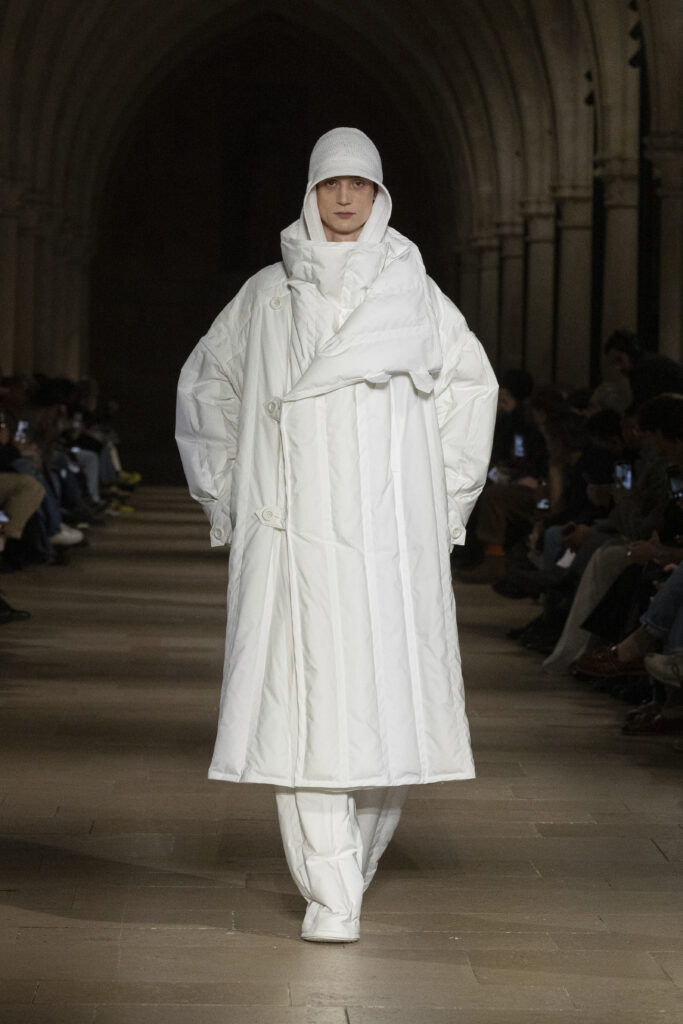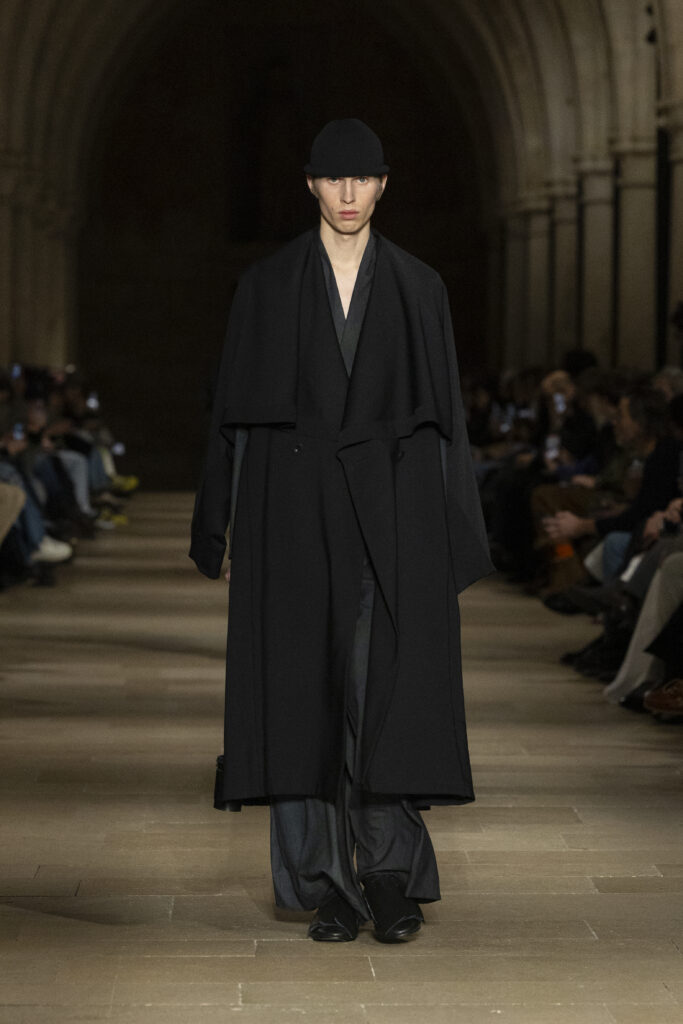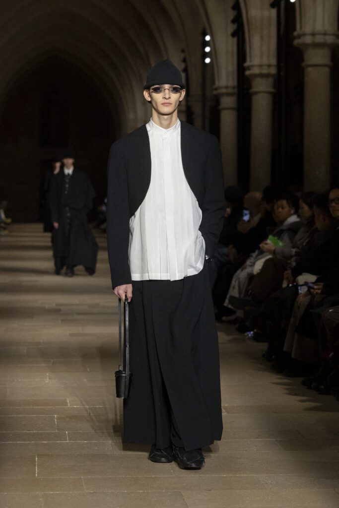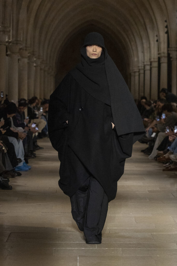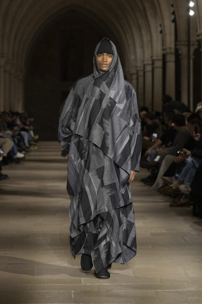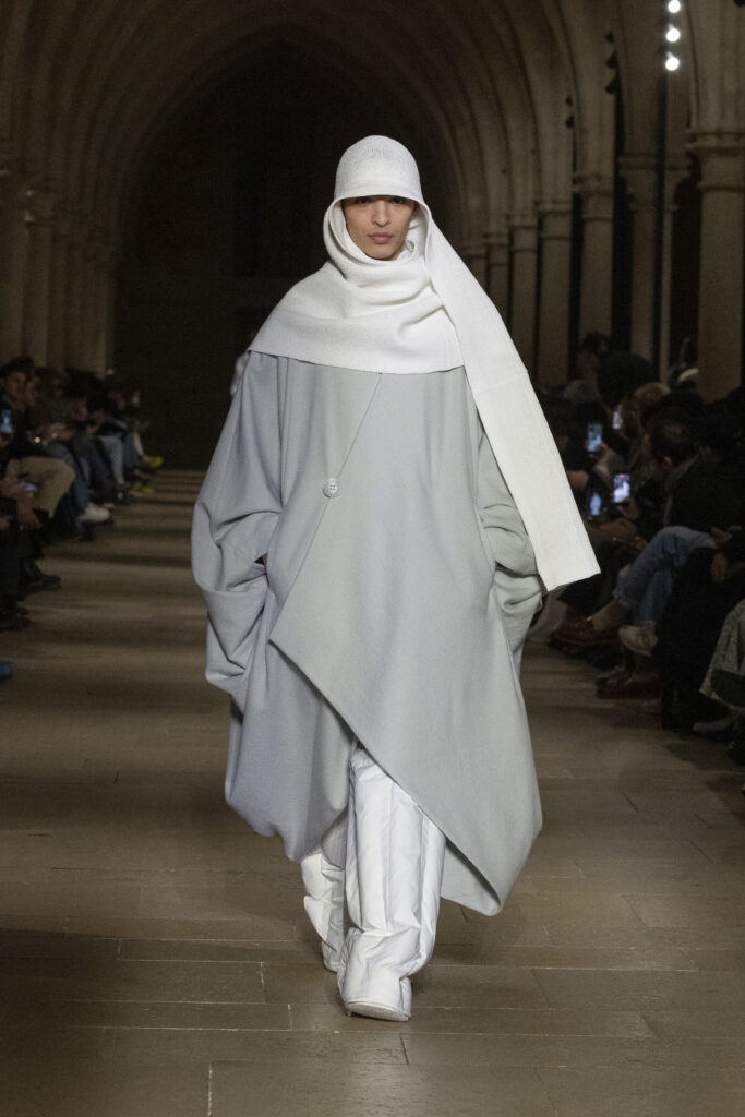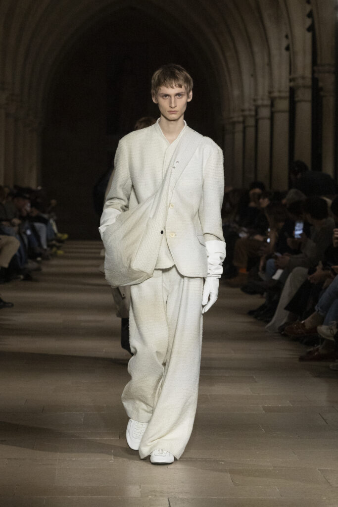 Au Collège des Bernardins, école cistercienne du XIIIe siècle, IM MEN a présenté le 22 janvier une collection fondée sur une contrainte : tout naître d’un unique rectangle de tissu. La réponse dépasse la rhétorique du minimalisme.