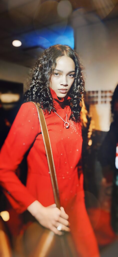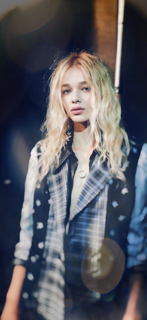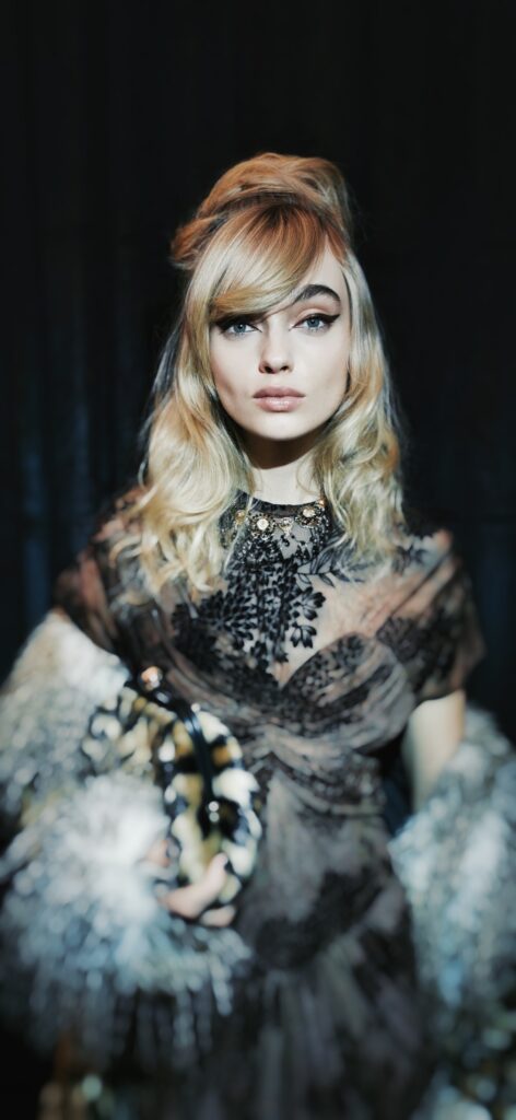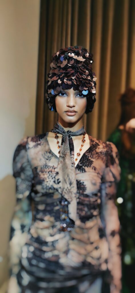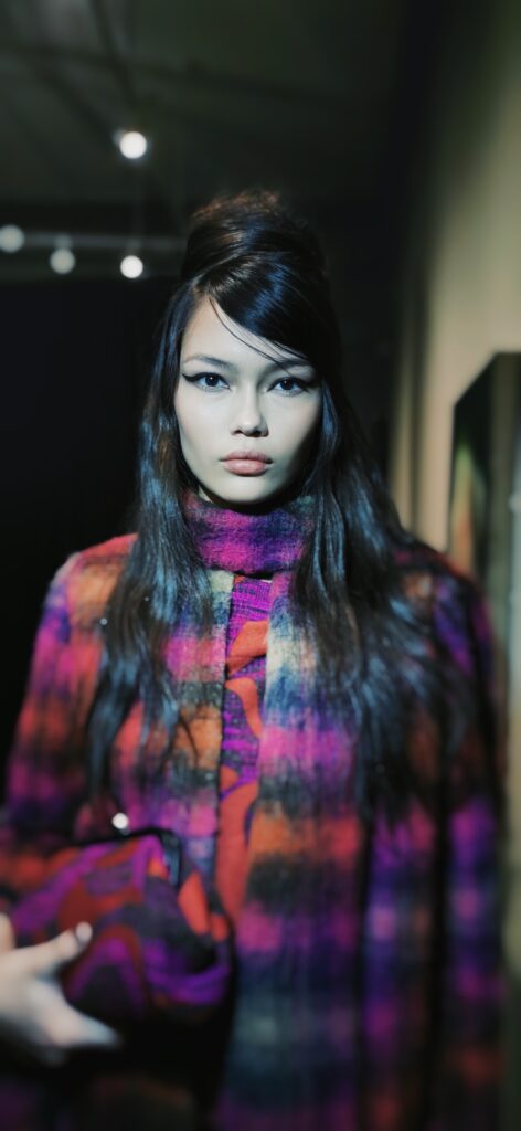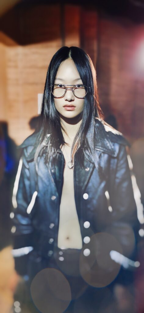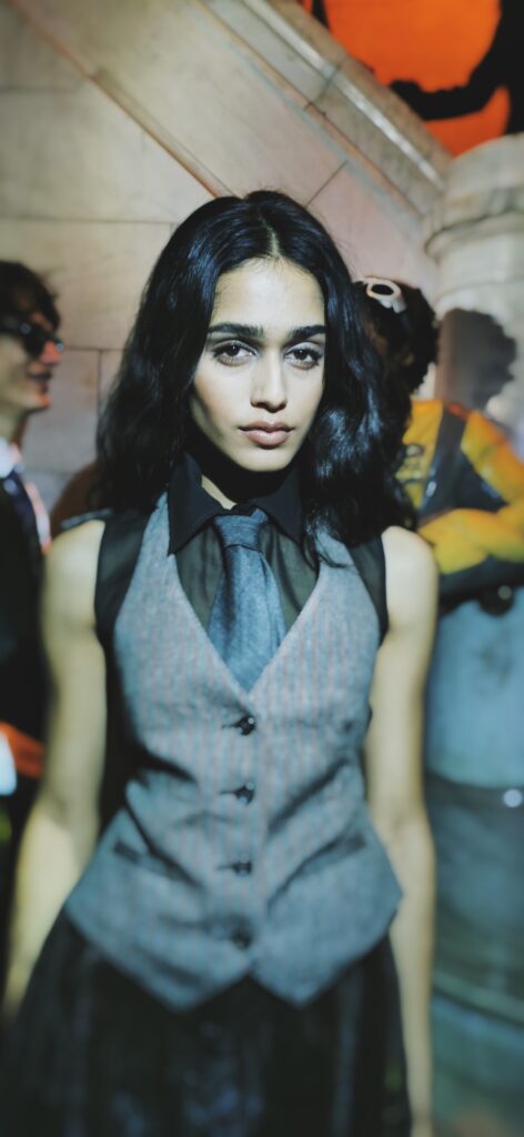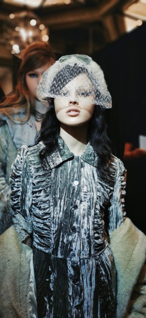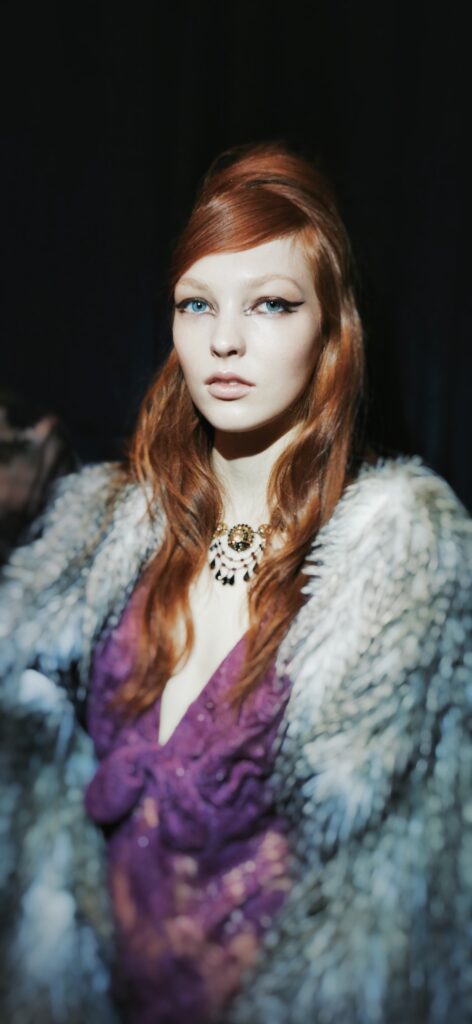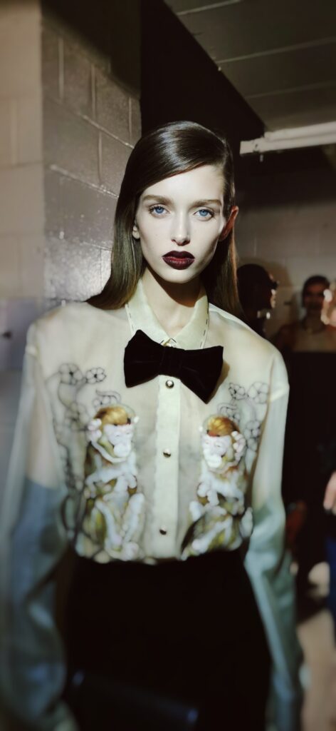 Chez Anna Sui, la même palette Mothership II : Sublime produit un effet opposé — regard élargi, lèvres floutées, peau travaillée en transparence. Le mot qu’elle choisit, « glamour urbain », n’est pas le plus précis, mais la direction l’est : un visage de ville, qui a vécu, qui n’a pas cherché l’impeccable.