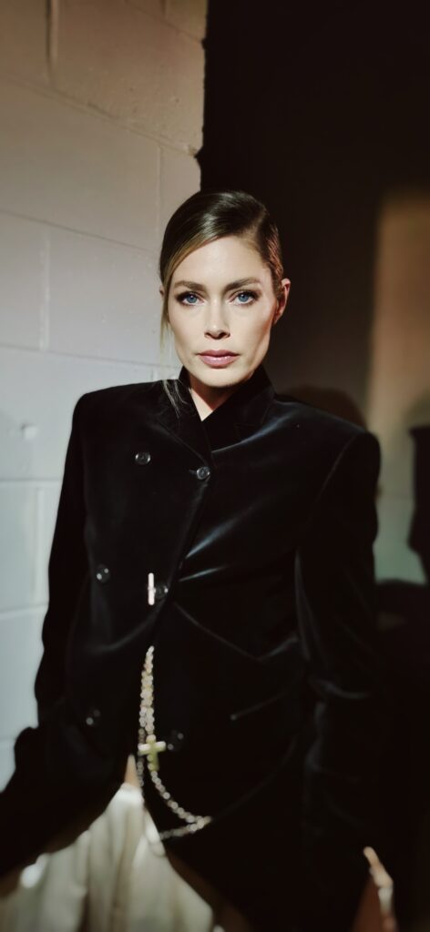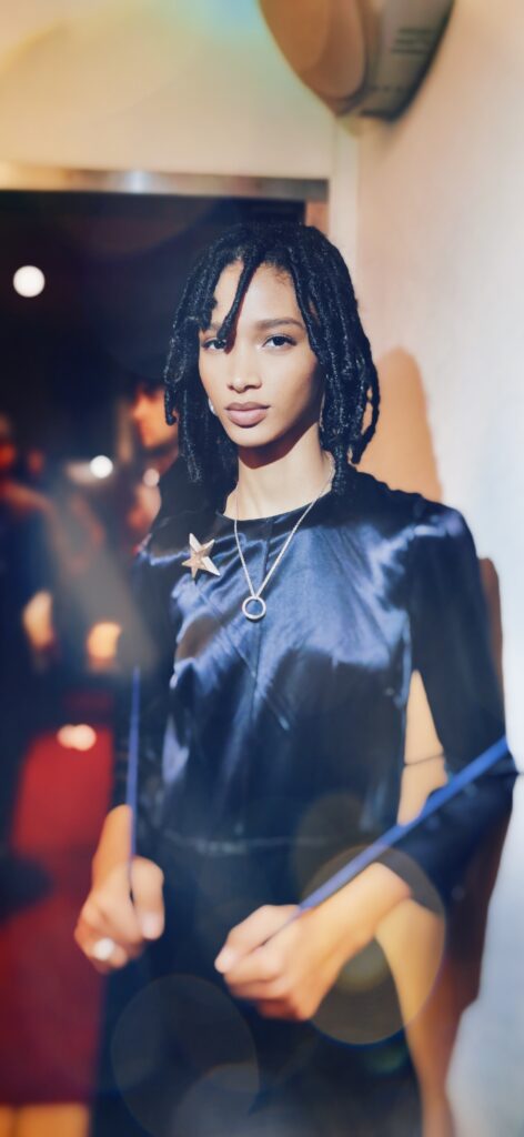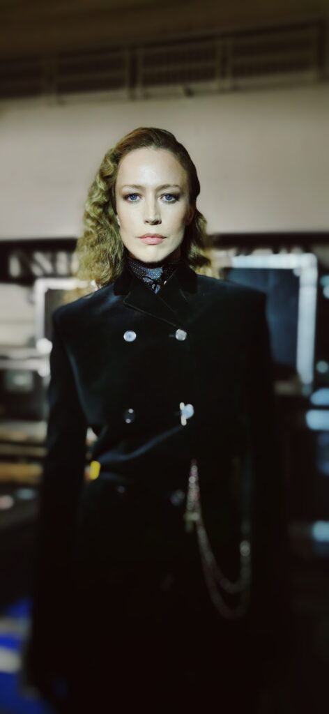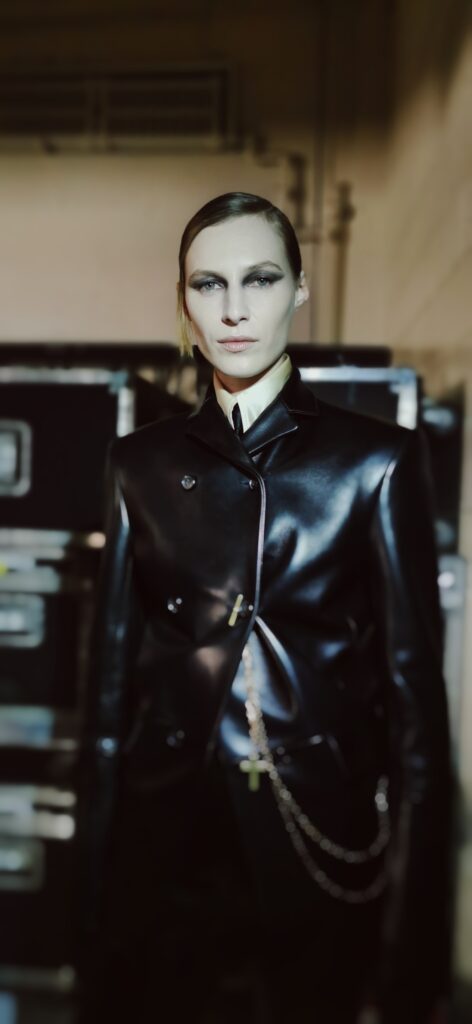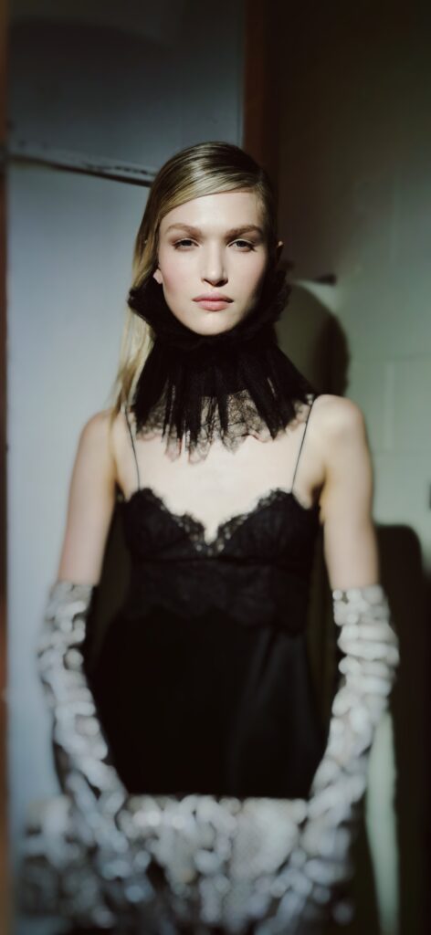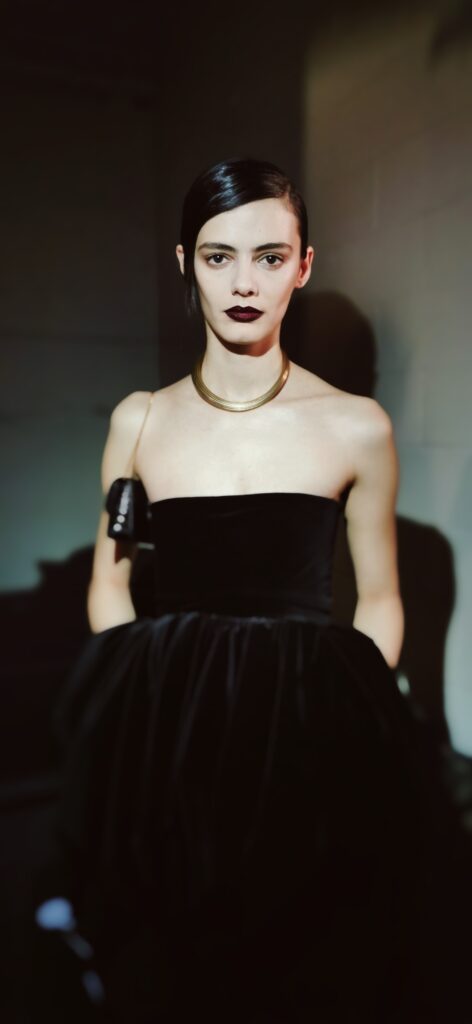 Chez Khaite, McGrath a travaillé le visage comme une surface picturale — yeux construits au PermaGel Ultra Glide Eye Pencil en Xtreme Black, lèvres en MatteTrance dans la teinte Elson, un bordeaux profond tirant vers le noir d’encre. La référence est cinématographique, elle l’assume : film noir, lumière contrastée, visage comme dramaturgie. Ce n’est pas un maquillage de soirée. C’est une direction d’actrice.