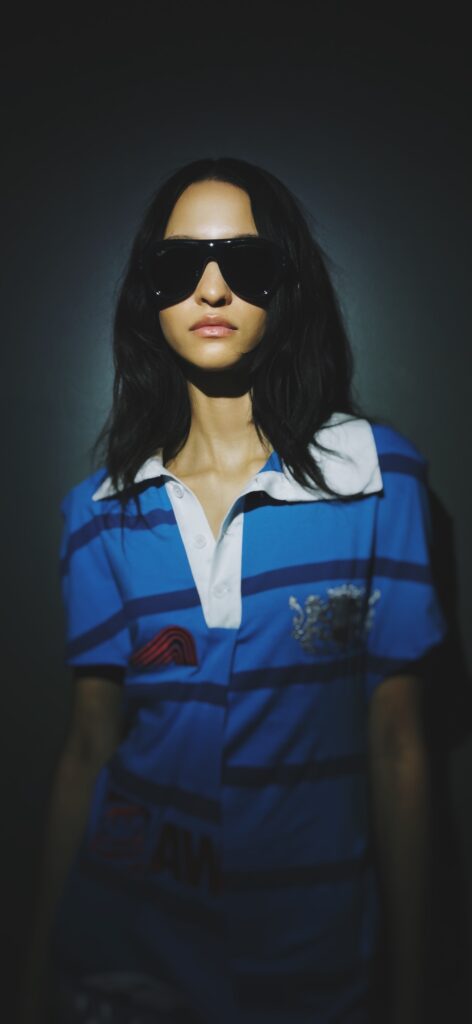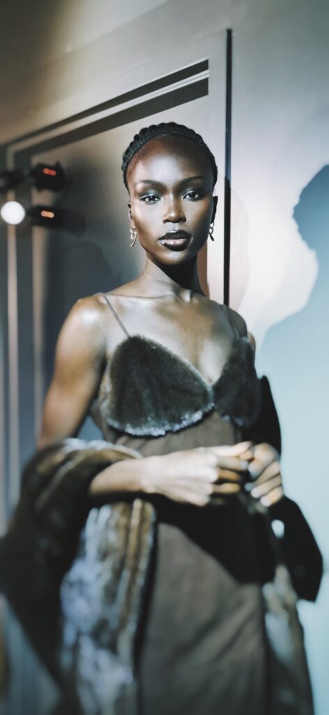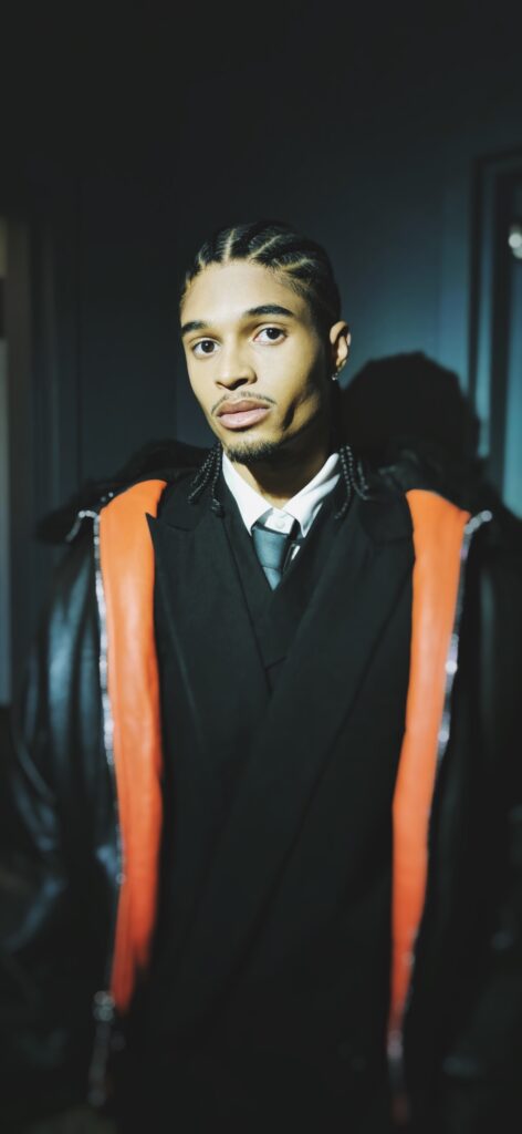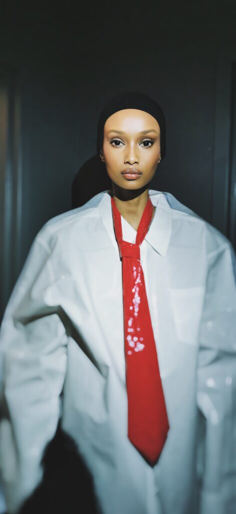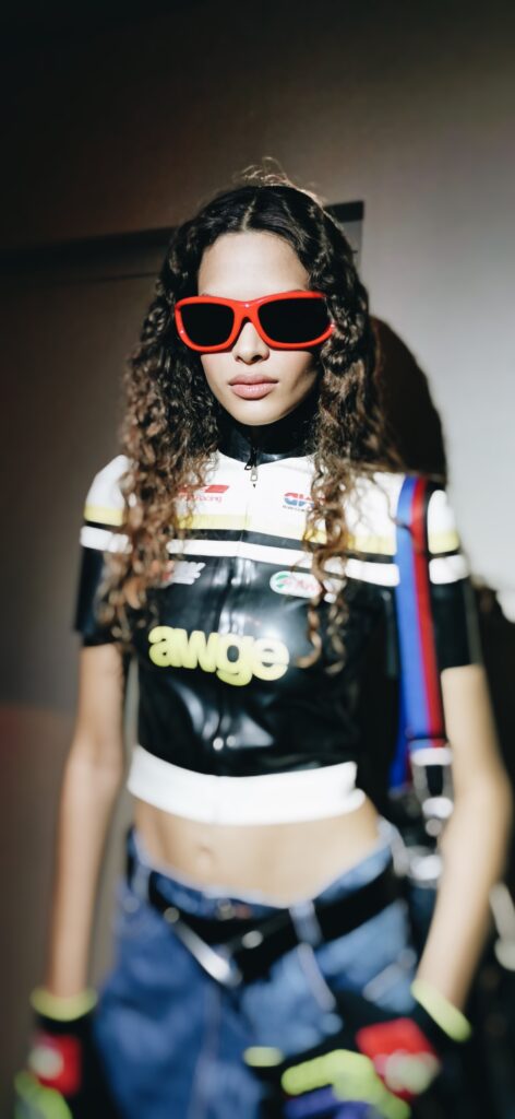 Chez AWGE — le collectif fondé par A$AP Rocky — McGrath opte pour un contraste tranchant, regard construit dans une intensité fumée, lèvres en velours moka. La référence revendiquée est le hip-hop soul des années quatre-vingt-dix : une époque où le maquillage masculin existait sur scène sans s’excuser d’y être.