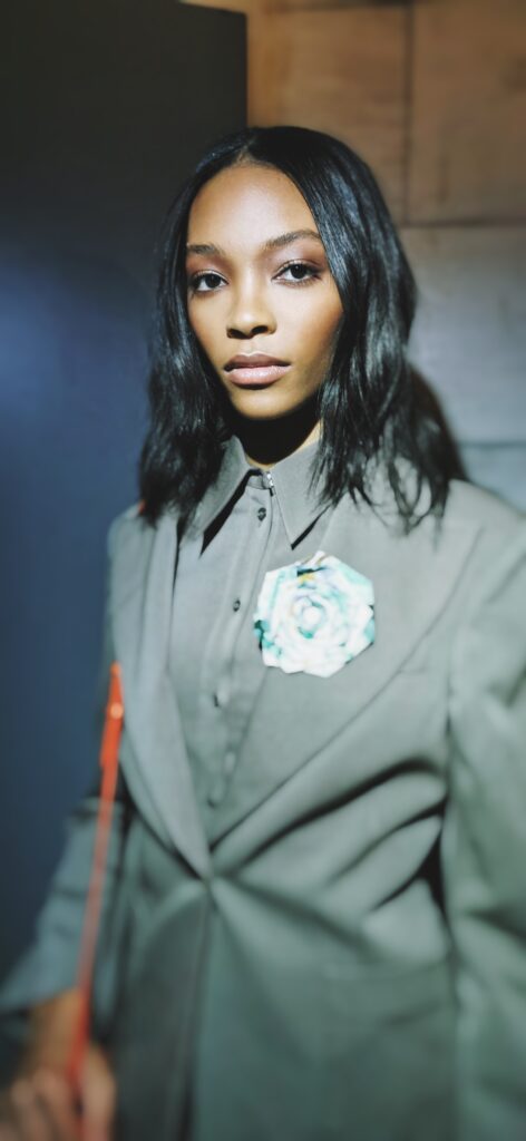 Chez Coach, le maquillage disparaît presque. Quelques touches de taupe sur les paupières via la Divine Bronze Luxe Quad Venusian Sunrise, mascara, baume incolore sur les lèvres. La peau prime, préparée en plusieurs couches superposées qui lui donnent cette densité lumineuse sans épaisseur visible. C’est la décision la plus difficile à prendre pour un maquilleur : choisir l’absence.