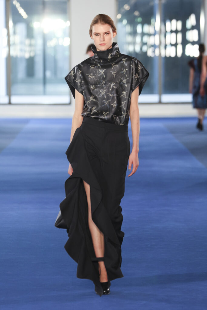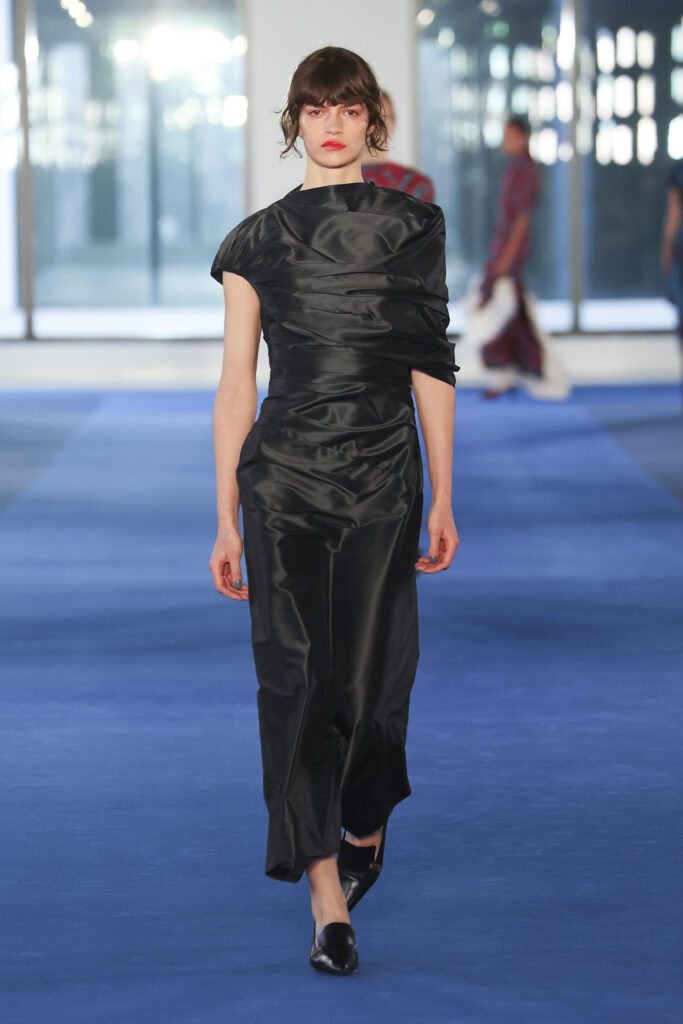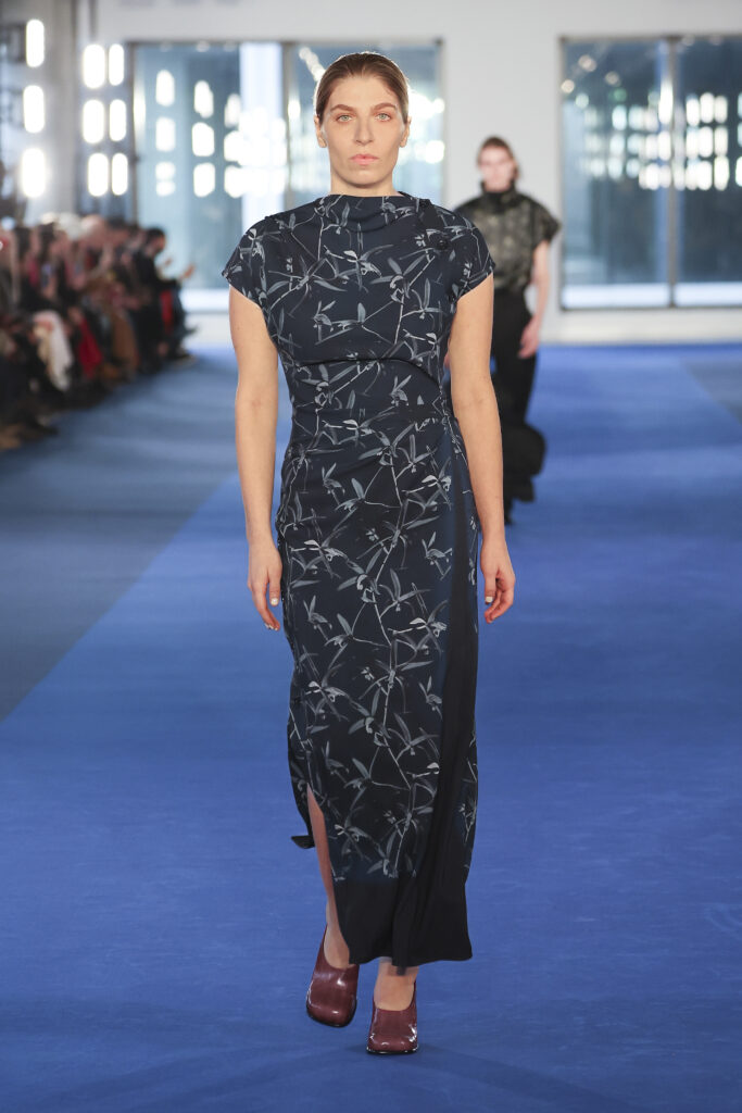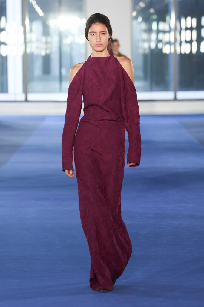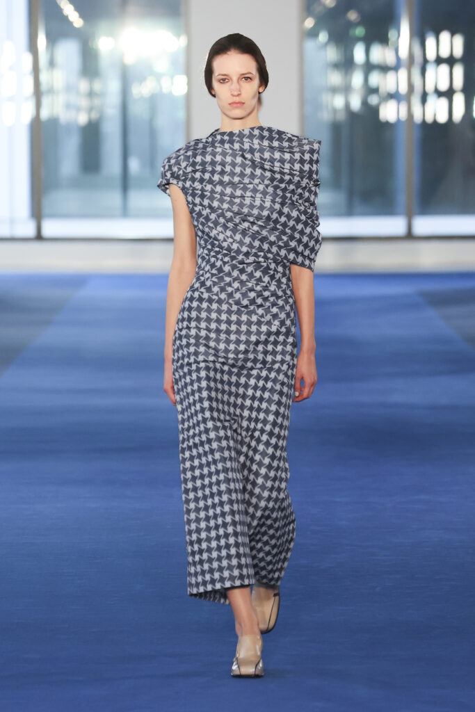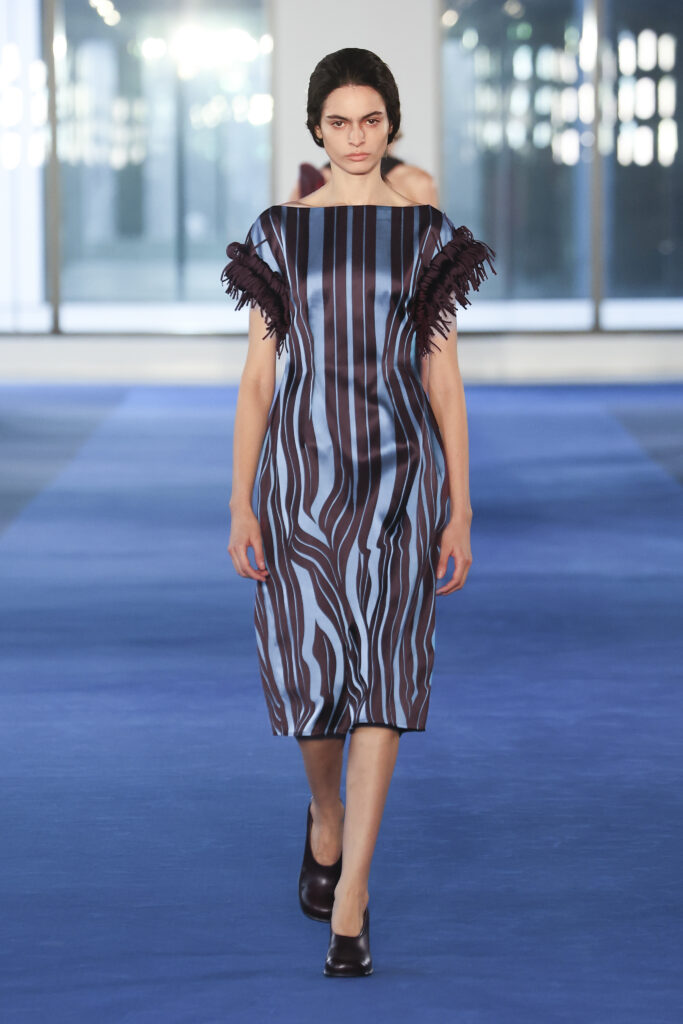 Le vêtement ici ne contraint pas, il suit l’accident du mouvement. L’architecture des pièces intègre le désordre : des robes aux drapés légèrement froissés, des jupes qui pivotent sur le corps pour se boutonner dans le dos, suggérant un habillage précipité. Cette silhouette, marquée par des tailles tronquées et des jambes allongées, refuse la perfection figée. Elle impose une « friction contrôlée », visible jusque dans les franges interrompues à mi-coupe, refusant la fluidité trop évidente au profit d’une rupture visuelle.