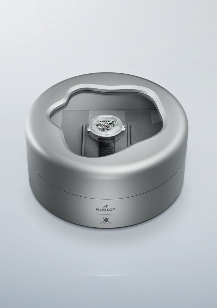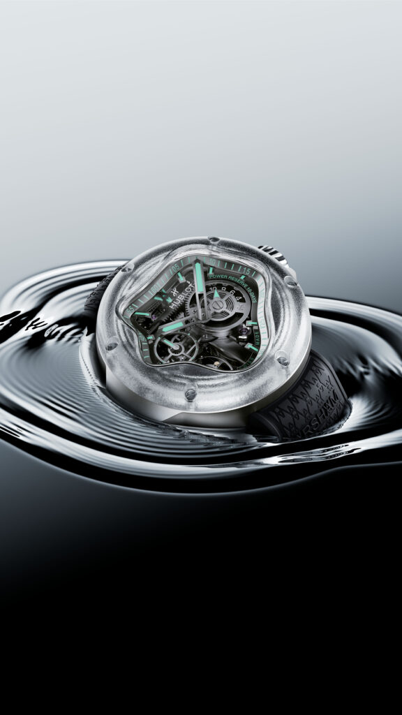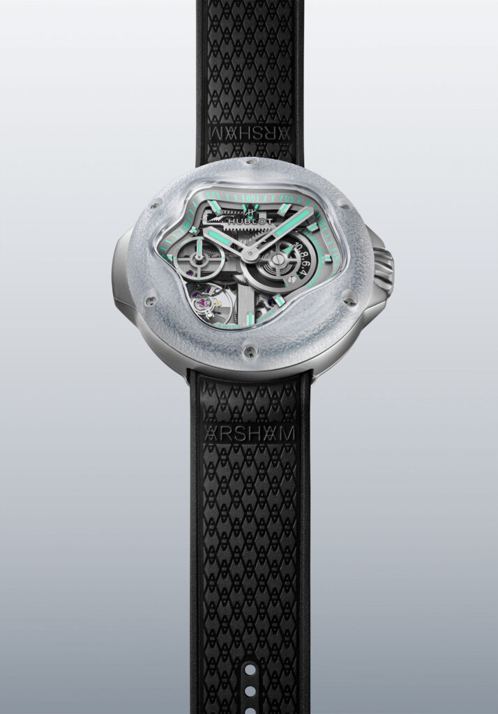 Au cœur de cette enveloppe tourmentée bat une mécanique d’une rationalité absolue : le calibre HUB1205. Ce mouvement Meca-10, réputé pour son architecture en « Meccano », a été repensé pour s’intégrer dans un volume plus contenu sans sacrifier sa lisibilité. Squeletté, traité en PVD gris, il offre une réserve de marche de 10 jours, affichée via un système de crémaillère visible côté cadran. La signature chromatique de l’artiste s’invite par touches : index, aiguilles et indicateurs se parent du vert « Arsham Studio » luminescent, seule concession colorée dans cet univers monochrome gris et translucide.