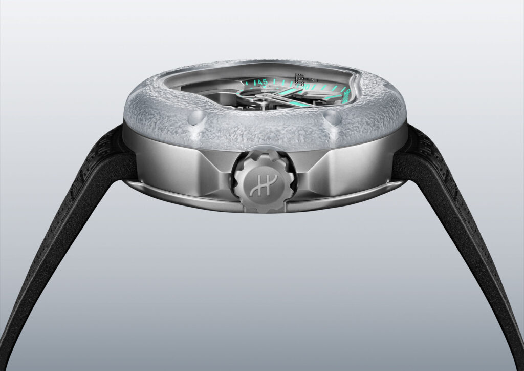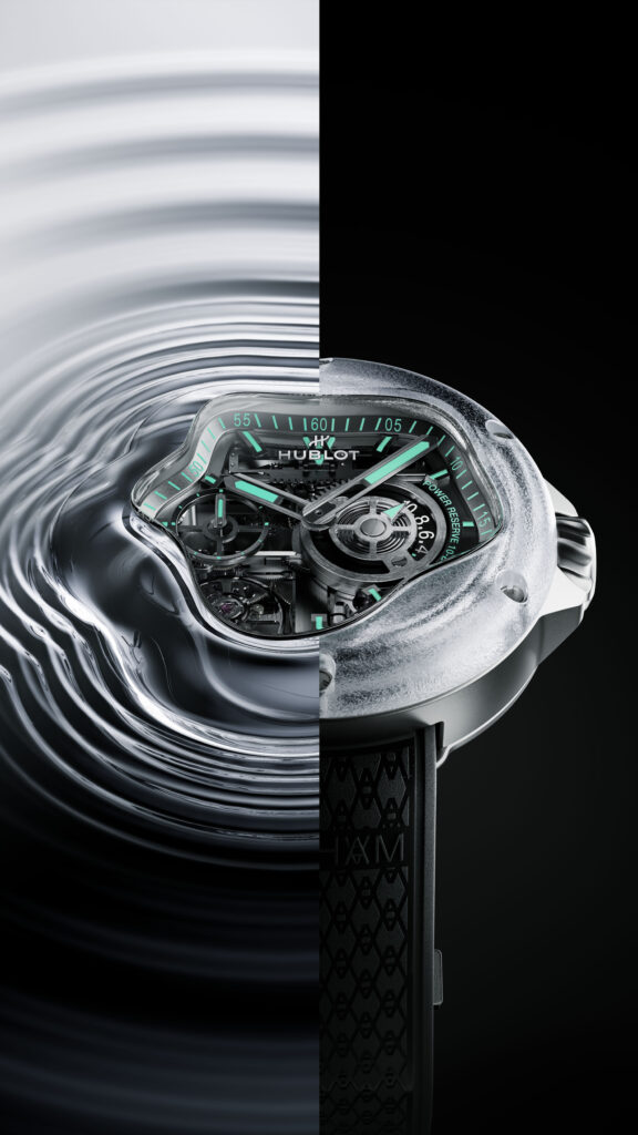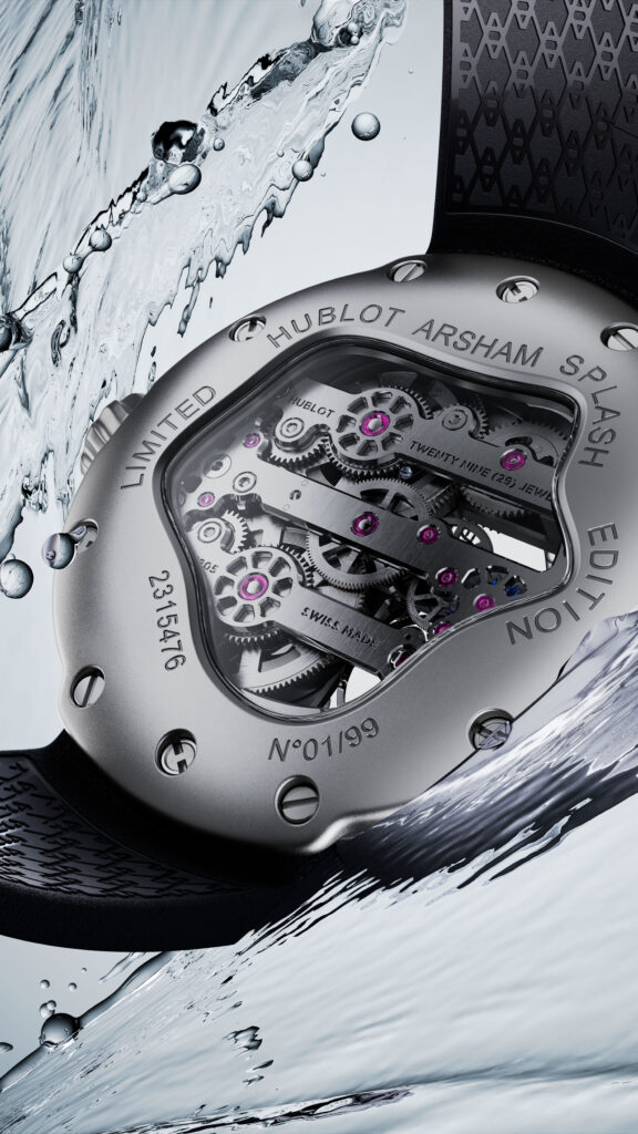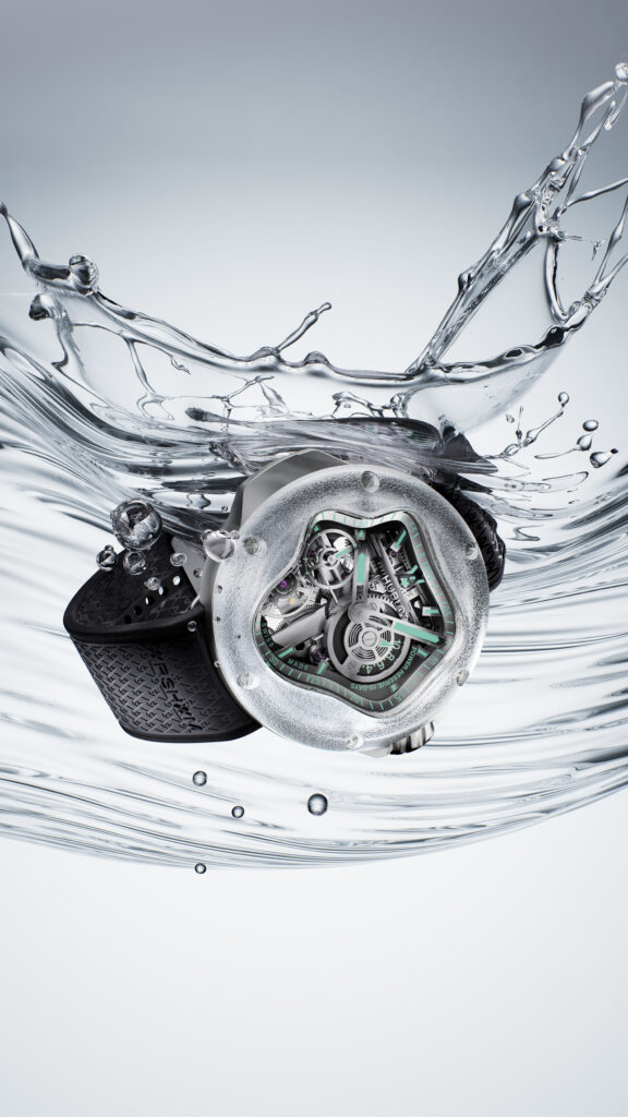 L’intérêt majeur de cette création réside dans sa carrosserie paradoxale. Le boîtier de 42 mm associe le titane microbillé à un verre saphir qui, loin d’être un simple couvercle protecteur, devient le protagoniste de l’œuvre. Travaillé au laser pour obtenir une texture fluide, le saphir imite le mouvement de l’eau qui s’écrase, créant une asymétrie sculpturale rare dans l’industrie. Ce « splash » figé, véritable prouesse d’usinage, contraste avec la froideur industrielle du métal, incarnant cette tension chère à Arsham entre l’archéologie fictive — l’objet semble avoir été exhumé d’un futur lointain — et la technologie immédiate.
