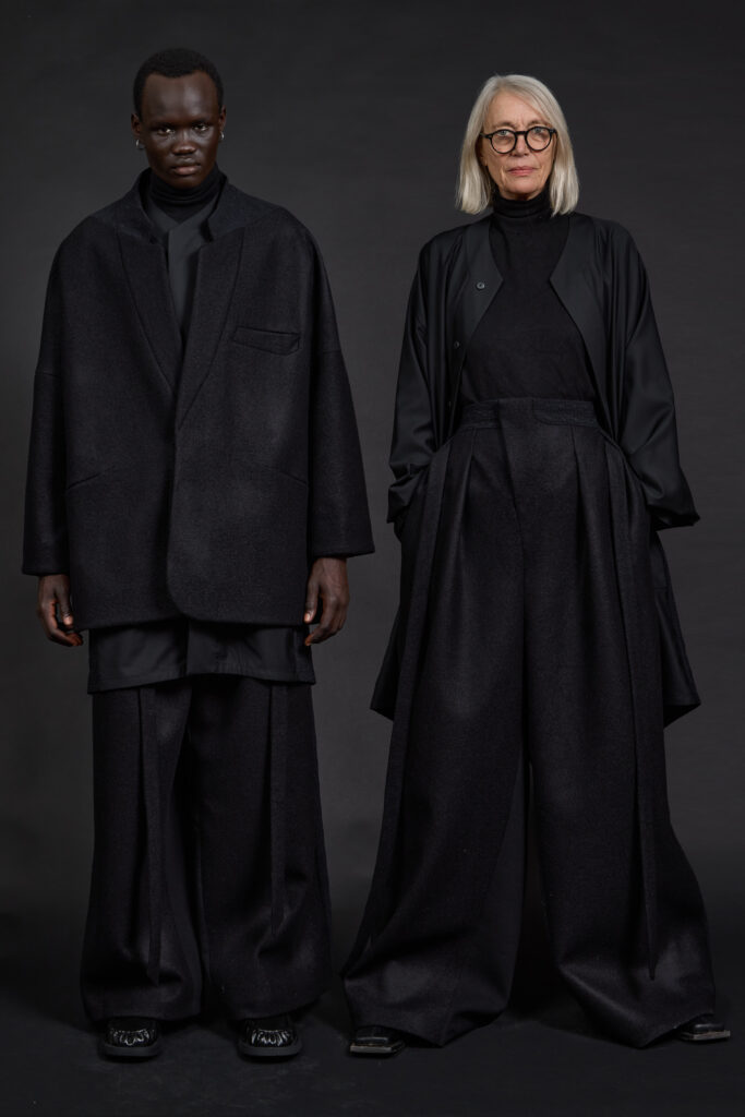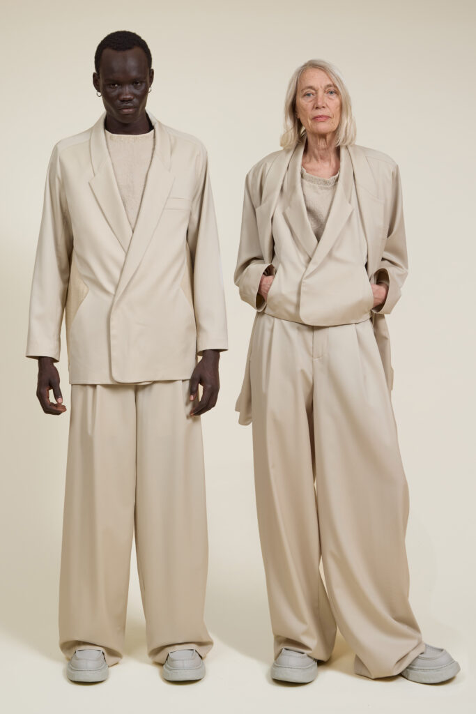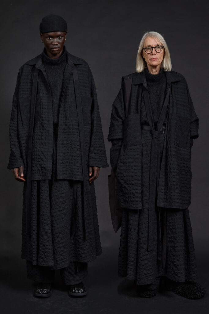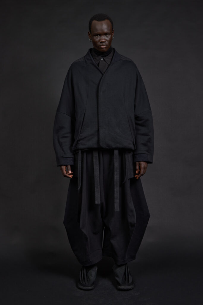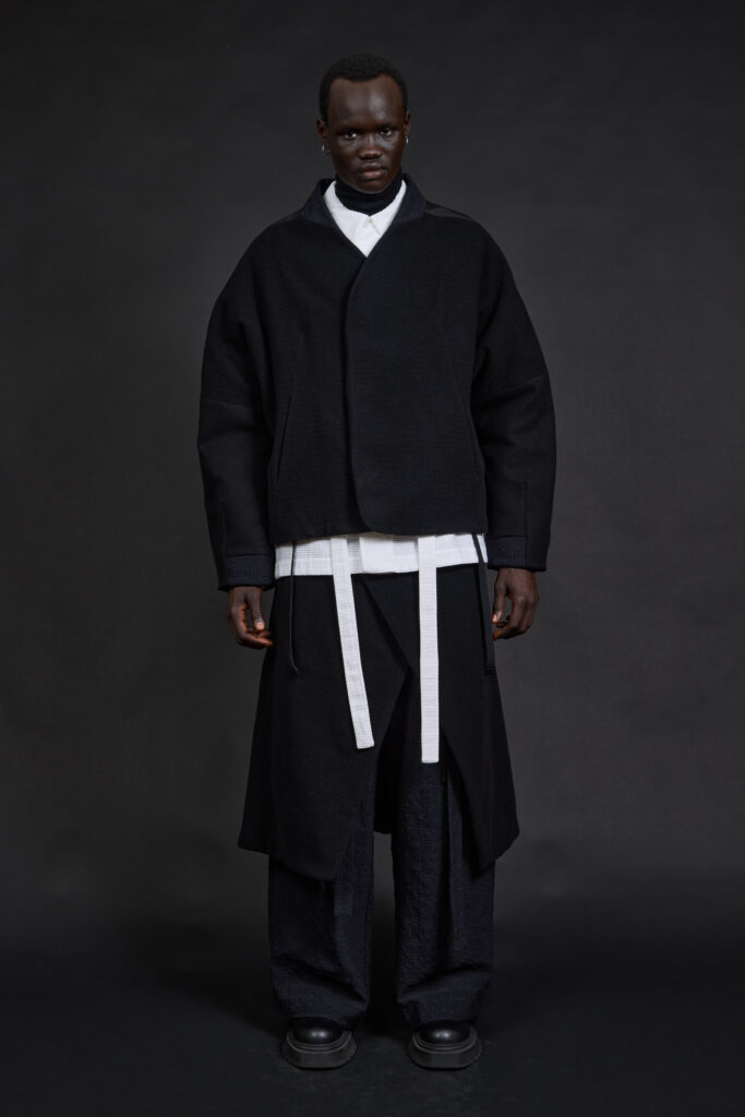 La collection s’organise autour d’une idée simple, presque radicale : l’uniforme contemporain. Non pas l’uniformisation, mais la répétition maîtrisée de formes pensées pour durer, se superposer et s’adapter. Dès les premières pages du lookbook, la posture est claire : volumes amples mais contenus, lignes allongées, silhouettes enveloppantes qui protègent sans contraindre .
