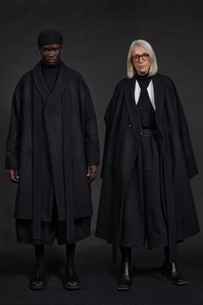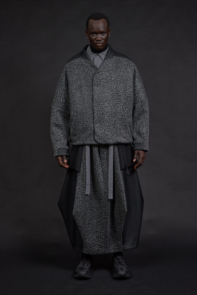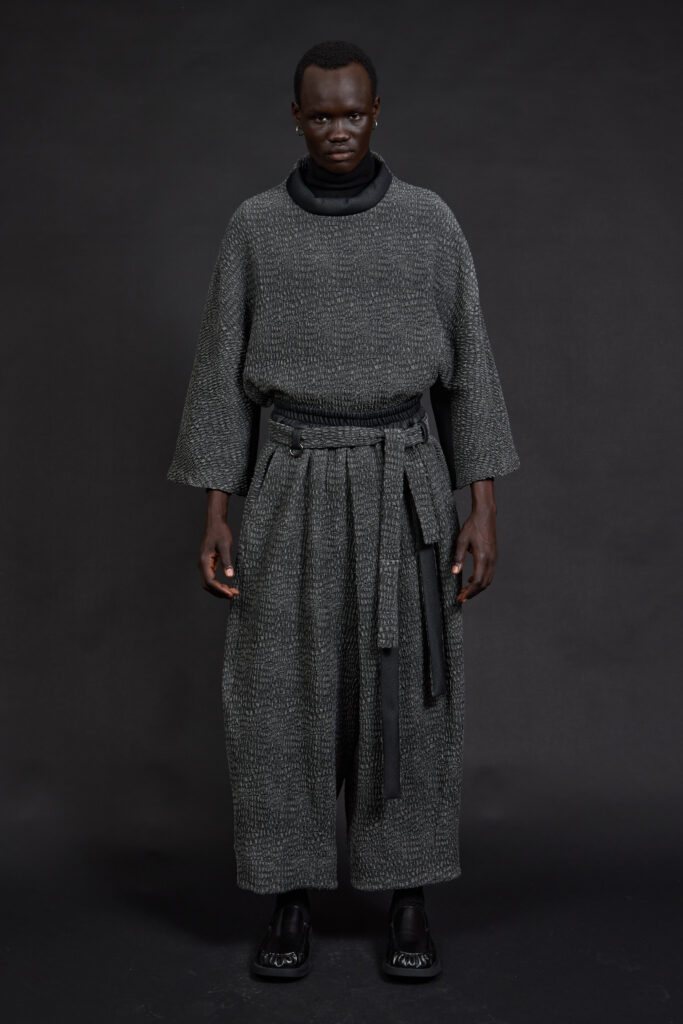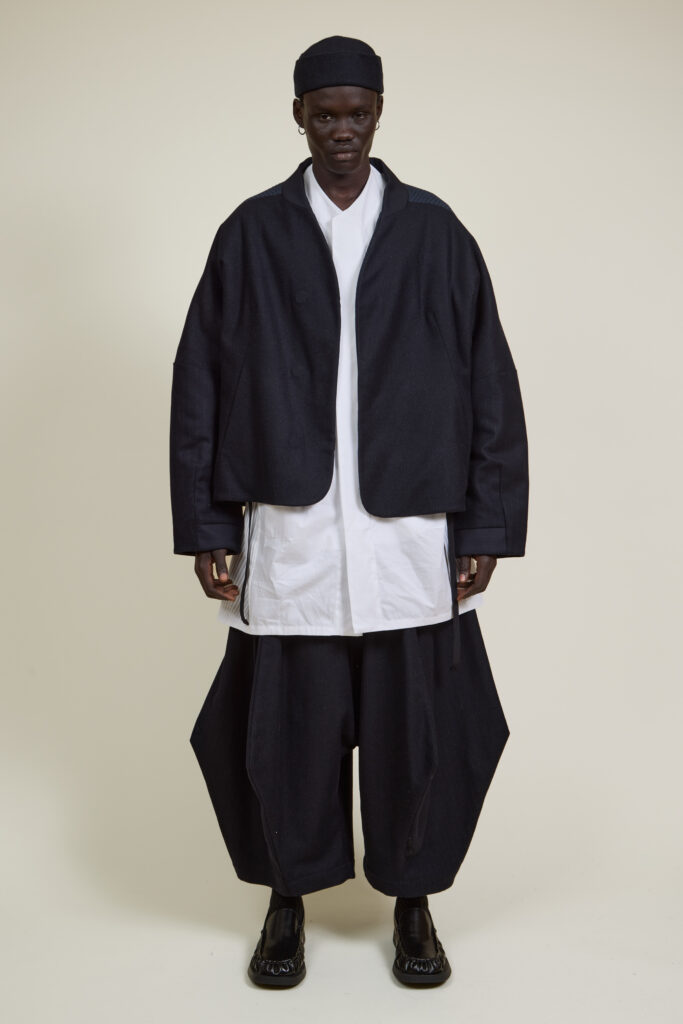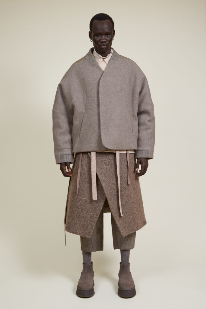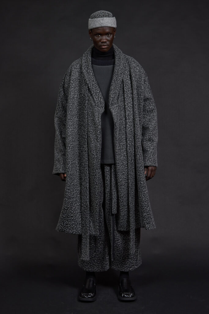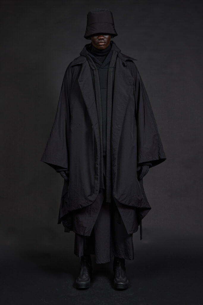 Les silhouettes, pensées comme modulaires, imposent un rapport différent au corps. Les pièces sont conçues pour être empilées, portées ensemble, ajustées selon le contexte. Capes et manteaux deviennent des éléments centraux, jouant l’enveloppe et la protection. Les accessoires — couvre-chefs, cols hauts — prolongent cette idée d’armure douce, une protection sans rigidité.