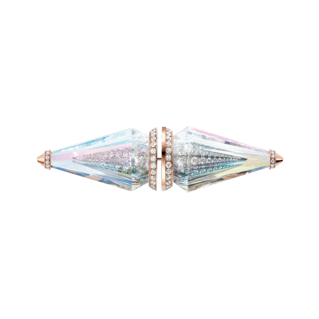La construction de « Faisceaux » suit trois opérations successives. D’abord, l’évidement du cristal de roche — taille en creux ménageant une cavité centrale. Ensuite, le sertissage interne d’un motif Jack (signature géométrique de la Maison depuis les années 1870) entièrement composé de diamants, placé au cœur de cette cavité. Enfin, l’application du voile holographique sur l’ensemble de la surface extérieure.