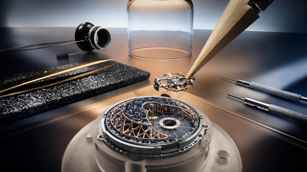 Cette mesure du temps céleste s’inscrit dans une mise en scène spectaculaire, sublimée par les artisans de l’atelier des Métiers Rares™. Le cadran bombé se déploie sur trois niveaux et s’organise autour d’un dôme en émail Grand Feu bleu nuit, parsemé de constellations décalquées en blanc. Autour de la carte du ciel, légèrement réduite par rapport aux versions précédentes, s’élève une structure dorée en filigrane baptisée « Atomium » : un maillage aérien de 117 sphères interconnectées, évoquant les lignes imaginaires reliant les étoiles entre elles. Cette architecture enveloppe littéralement le Cosmotourbillon, transformant le cadran en une véritable voûte céleste tridimensionnelle.