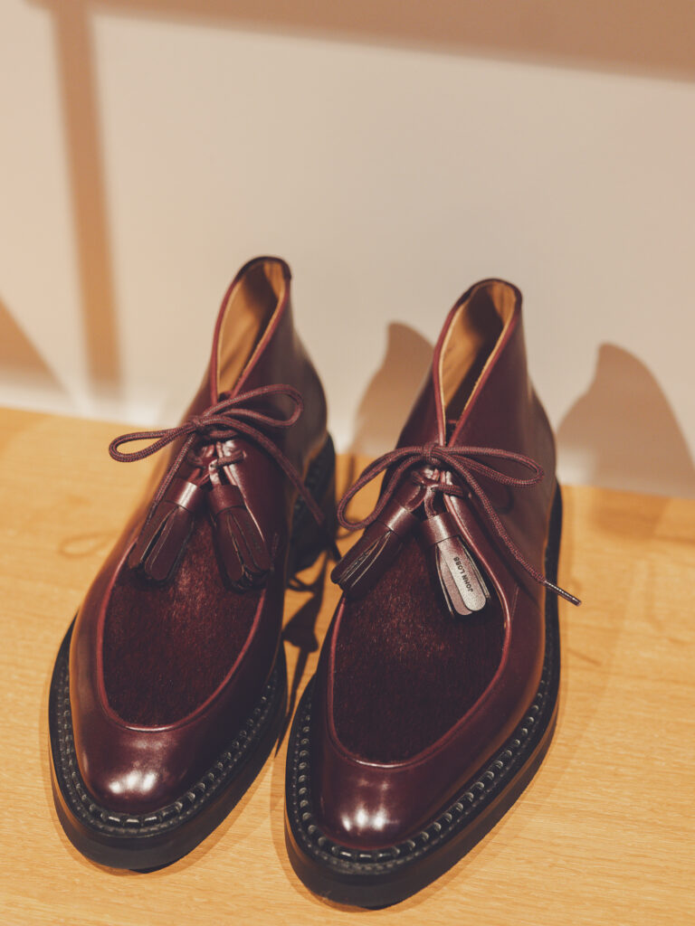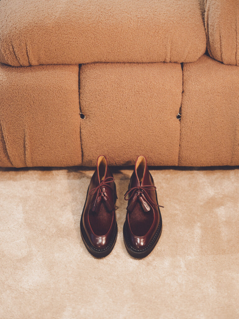 L’incursion la plus surprenante réside sans doute dans la révision du derby Smith. En l’équipant d’une semelle esprit « creeper », la Maison John Lobb cite explicitement l’esthétique rock et Ska britannique. C’est une hybridation culturelle : la forme classique du derby est « dérangée » par une plateforme qui modifie la démarche et l’attitude. Le modèle Smith Chukka accentue cette théâtralité avec des pampilles amovibles aux proportions volontairement exagérées, prouvant que l’humour anglais peut aussi s’exprimer par le cuir.