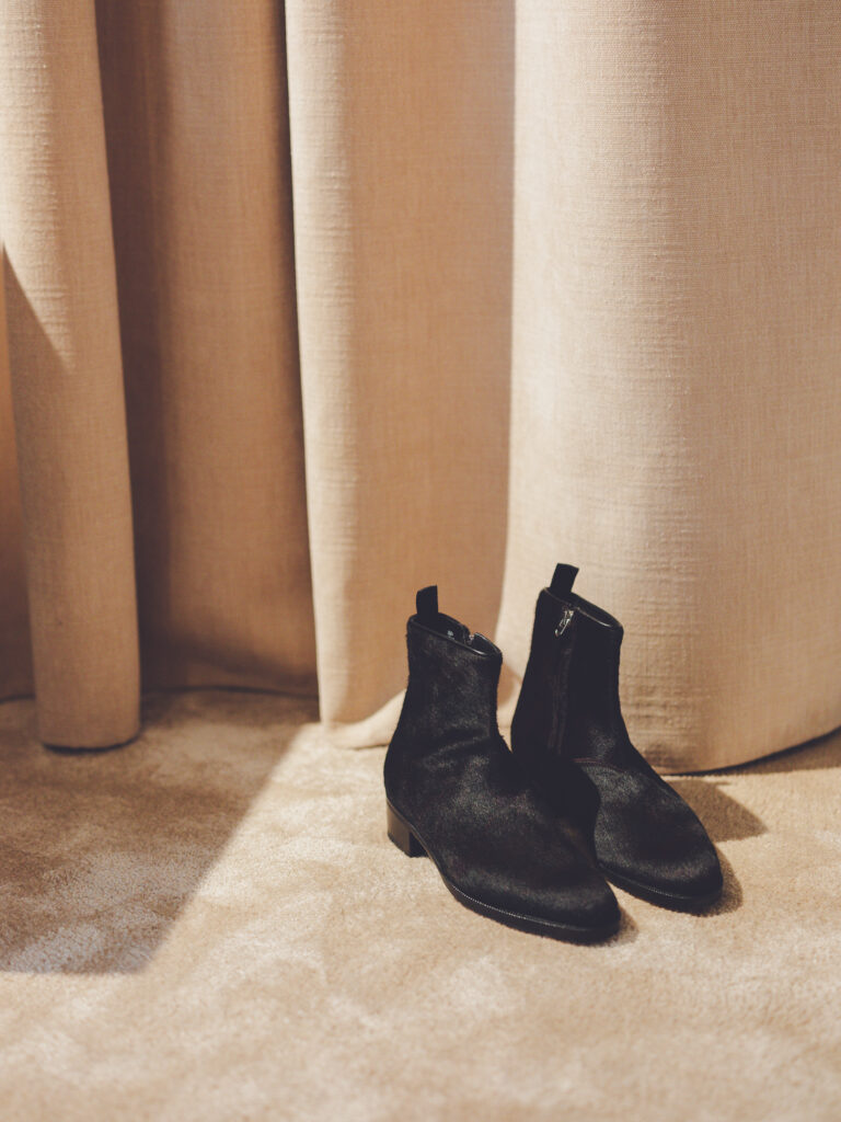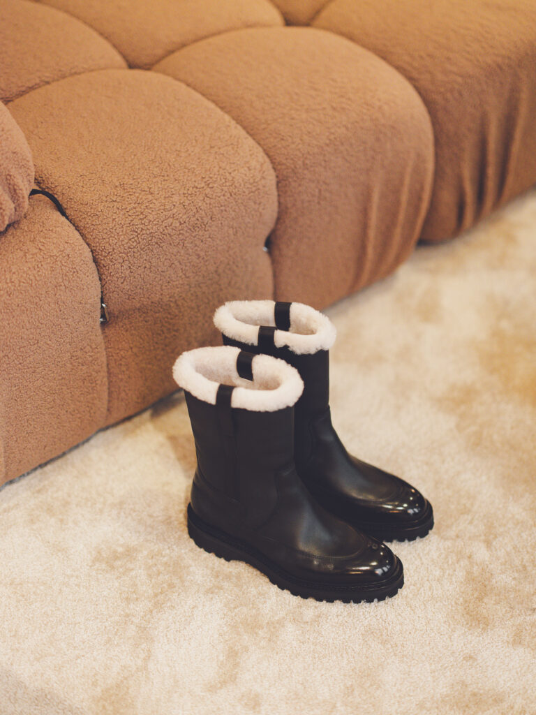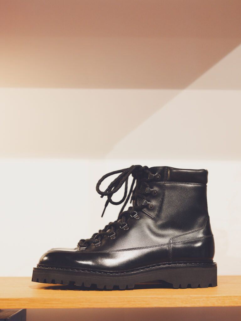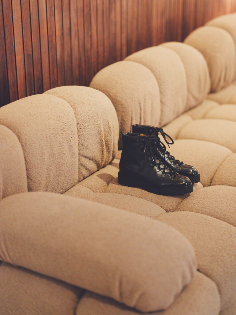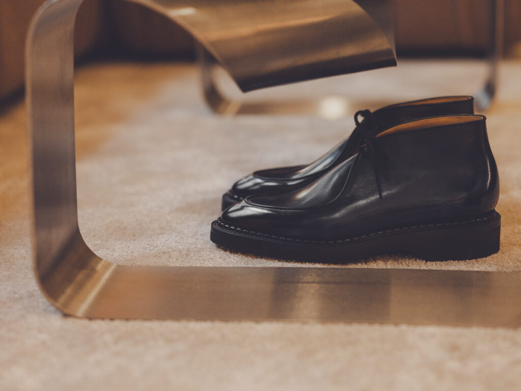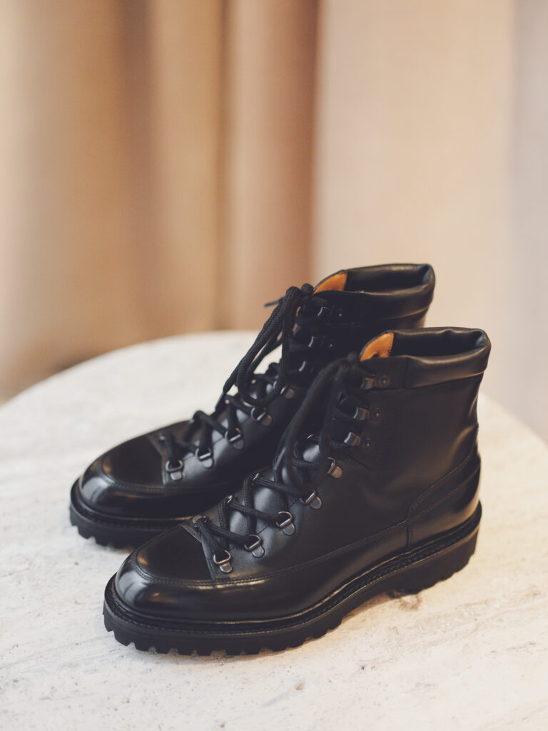 Dans la même logique, la botte Highland emprunte les codes de la botte de pluie anglaise (Wellington) mais les ennoblit par un cuir ciré destiné à se patiner. Doublée de laine, elle oppose à l’humidité urbaine une barrière organique. Ici, le luxe réside dans la capacité du matériau à vieillir et à s’embellir sous la contrainte des éléments.