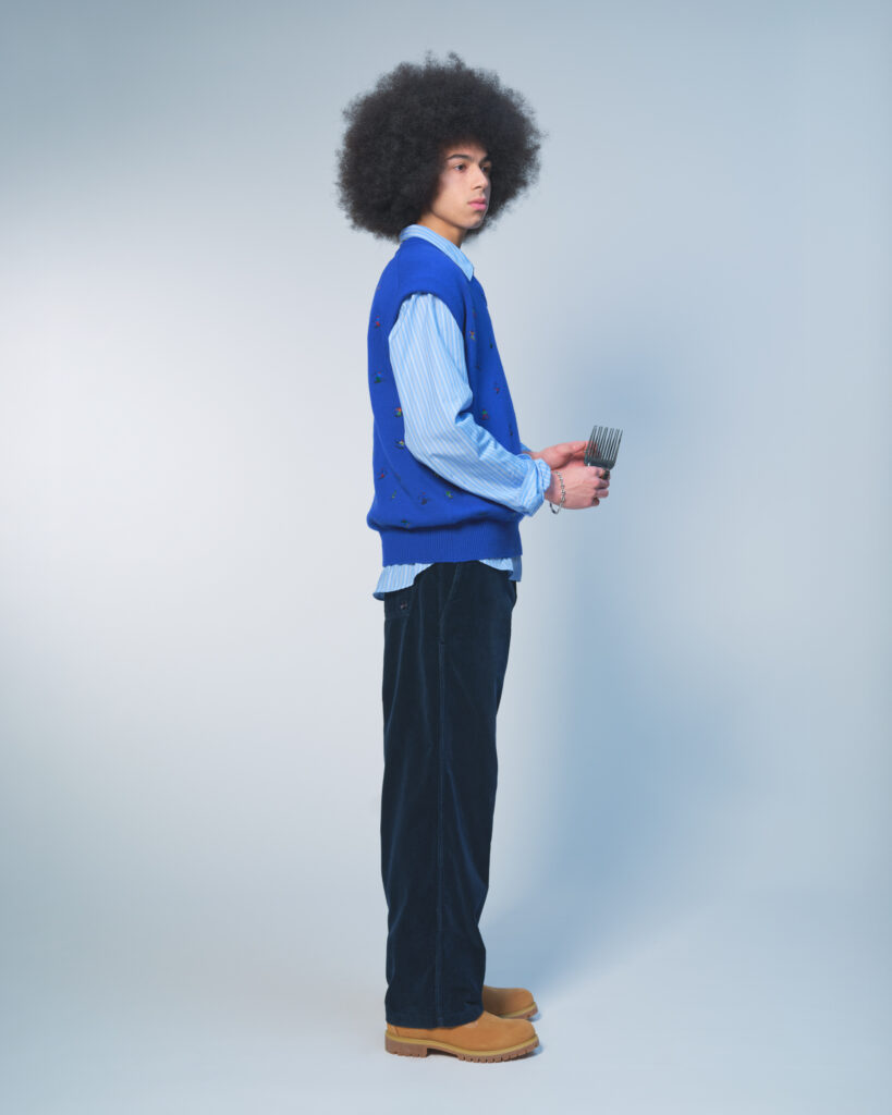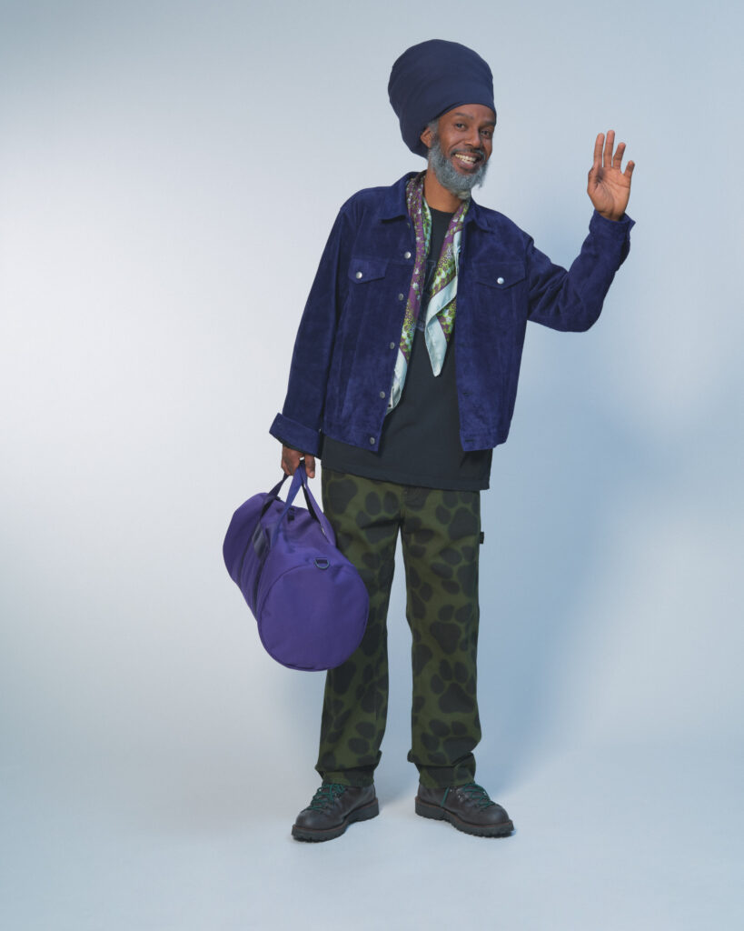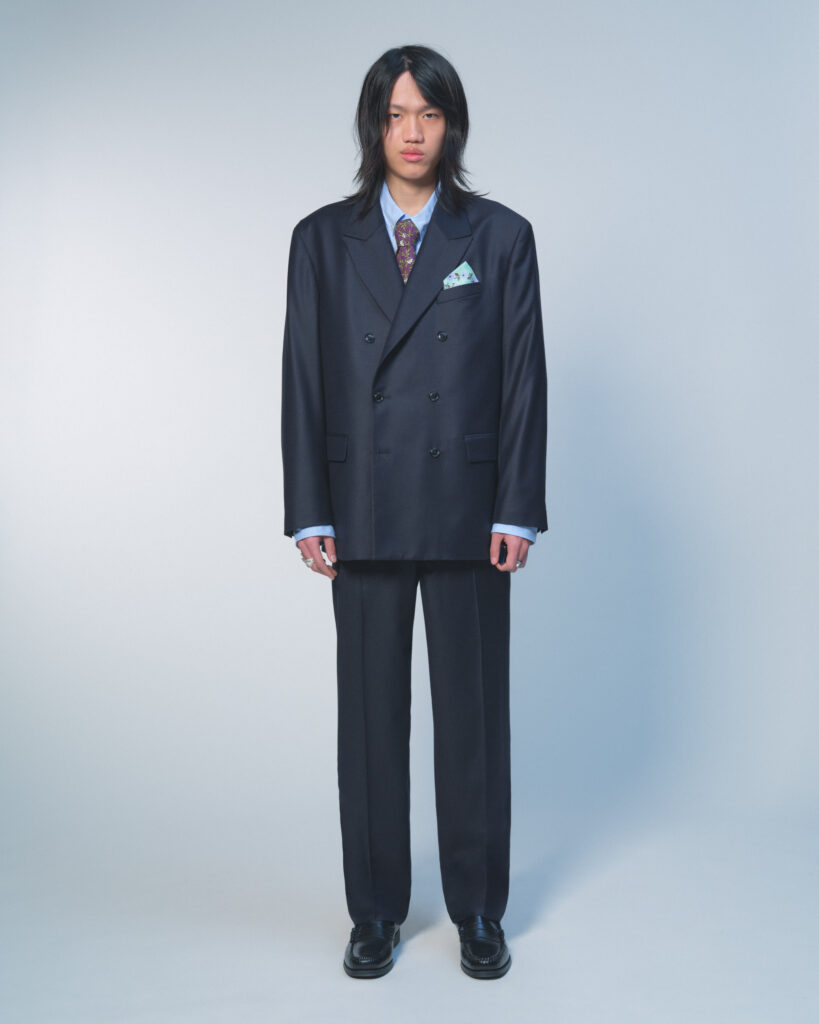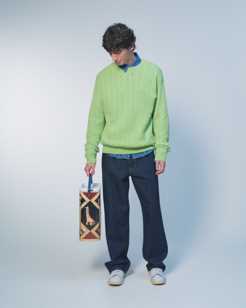La collection articule tailoring en costumes croisés et pardessus assortis avec des pièces à fonction quotidienne — chemises tissées, maille, denim. La veste trucker en velours côtelé pour les journées de transition, la veste coque bicolore contre les intempéries, le bomber tricoté — une pièce reconnaissable des saisons passées — traité ici en camouflage rose, mauve et vert. L’offre accessoires s’élargit : cravates et écharpes coordonnées aux costumes, petite maroquinerie de poche, sacs à dos et week-end bags conçus pour l’usage urbain quotidien.