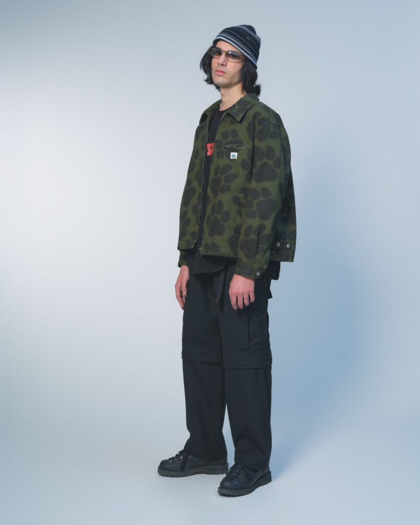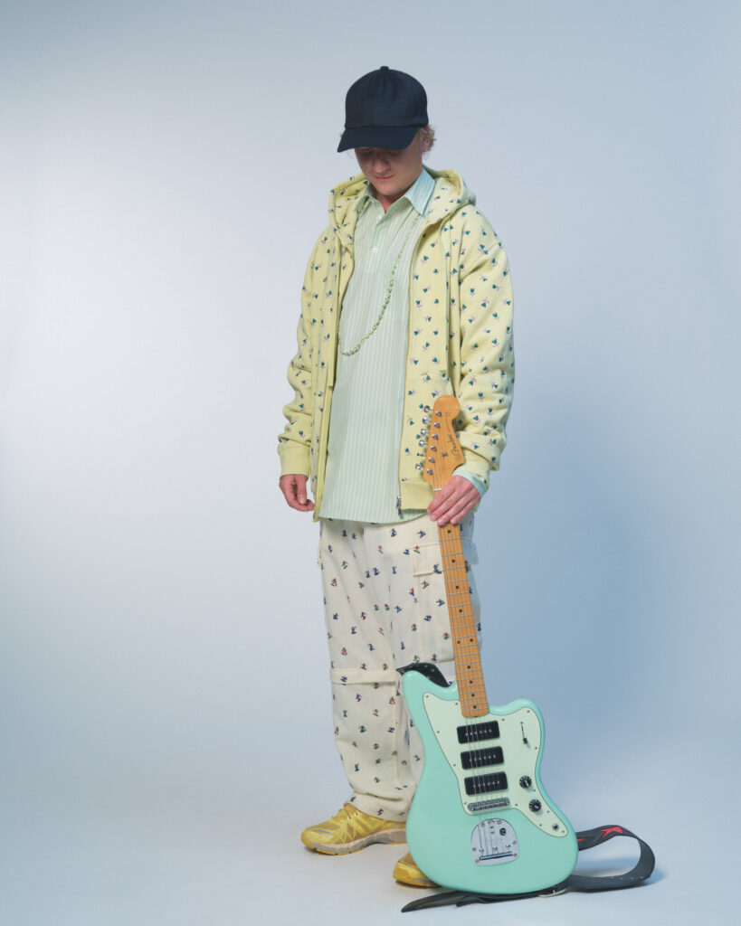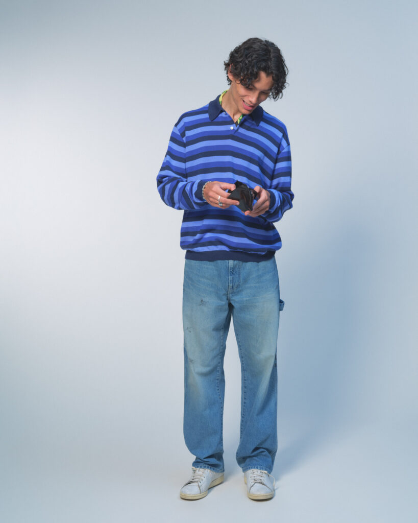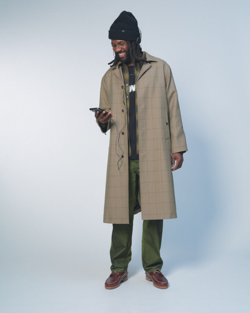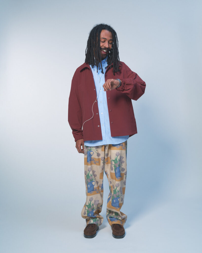 La collection articule tailoring en costumes croisés et pardessus assortis avec des pièces à fonction quotidienne — chemises tissées, maille, denim. La veste trucker en velours côtelé pour les journées de transition, la veste coque bicolore contre les intempéries, le bomber tricoté — une pièce reconnaissable des saisons passées — traité ici en camouflage rose, mauve et vert. L’offre accessoires s’élargit : cravates et écharpes coordonnées aux costumes, petite maroquinerie de poche, sacs à dos et week-end bags conçus pour l’usage urbain quotidien.