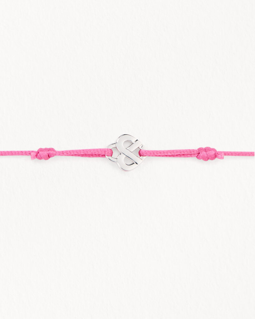Détail technique * Objet : Bracelet Cœur Entrelacé * Matière : Argent * Support : Cordon rose * Prix de vente : 190€ * Engagement : 20% des ventes reversés à EndoFrance du 1er au 31 mars 2026 +3