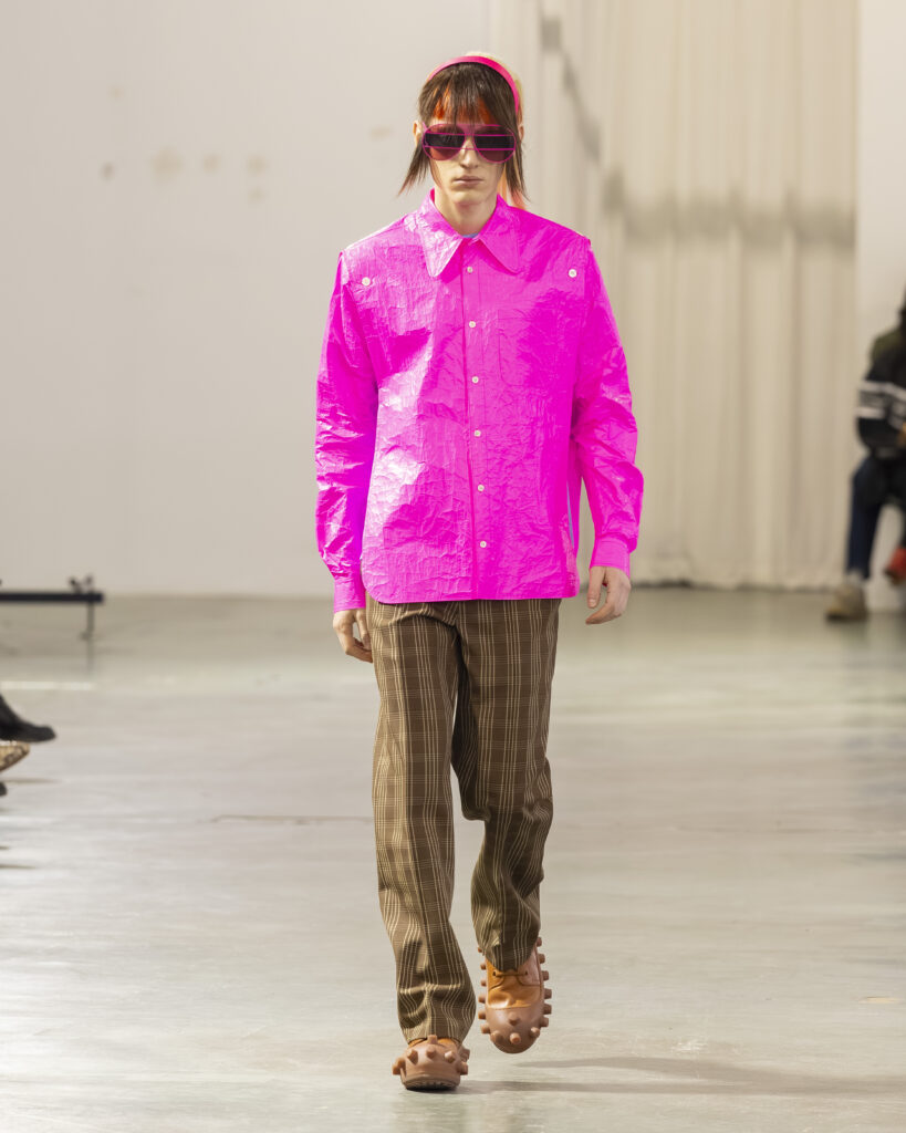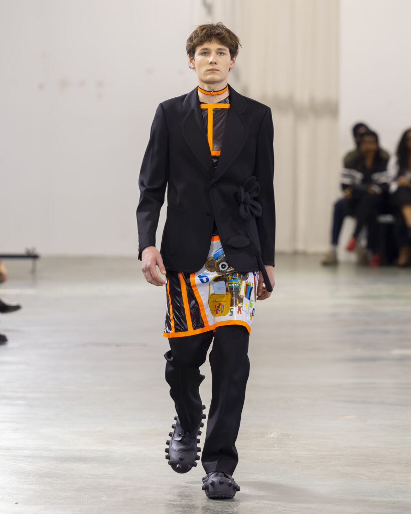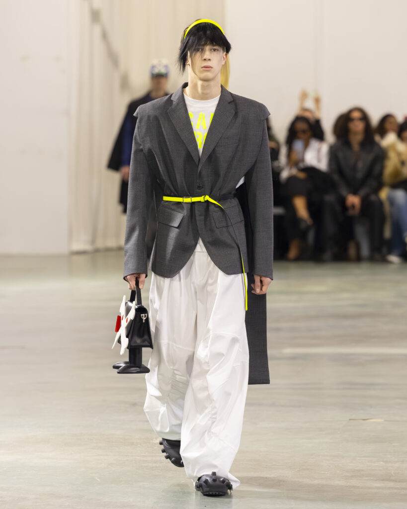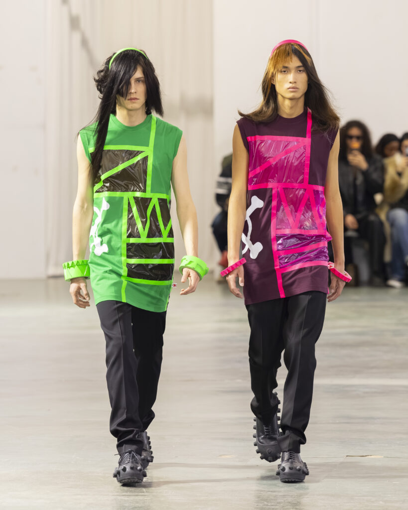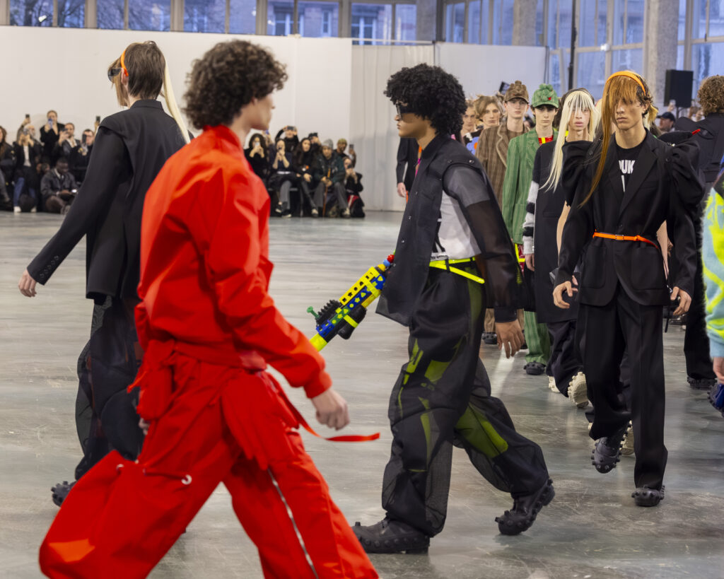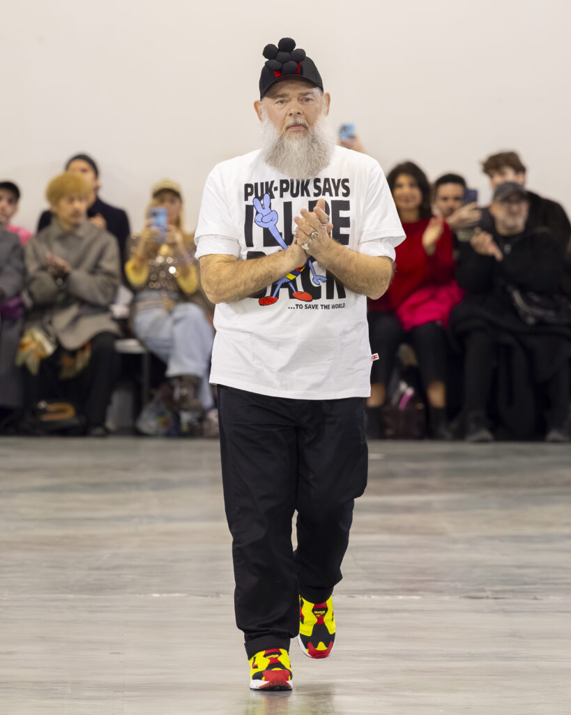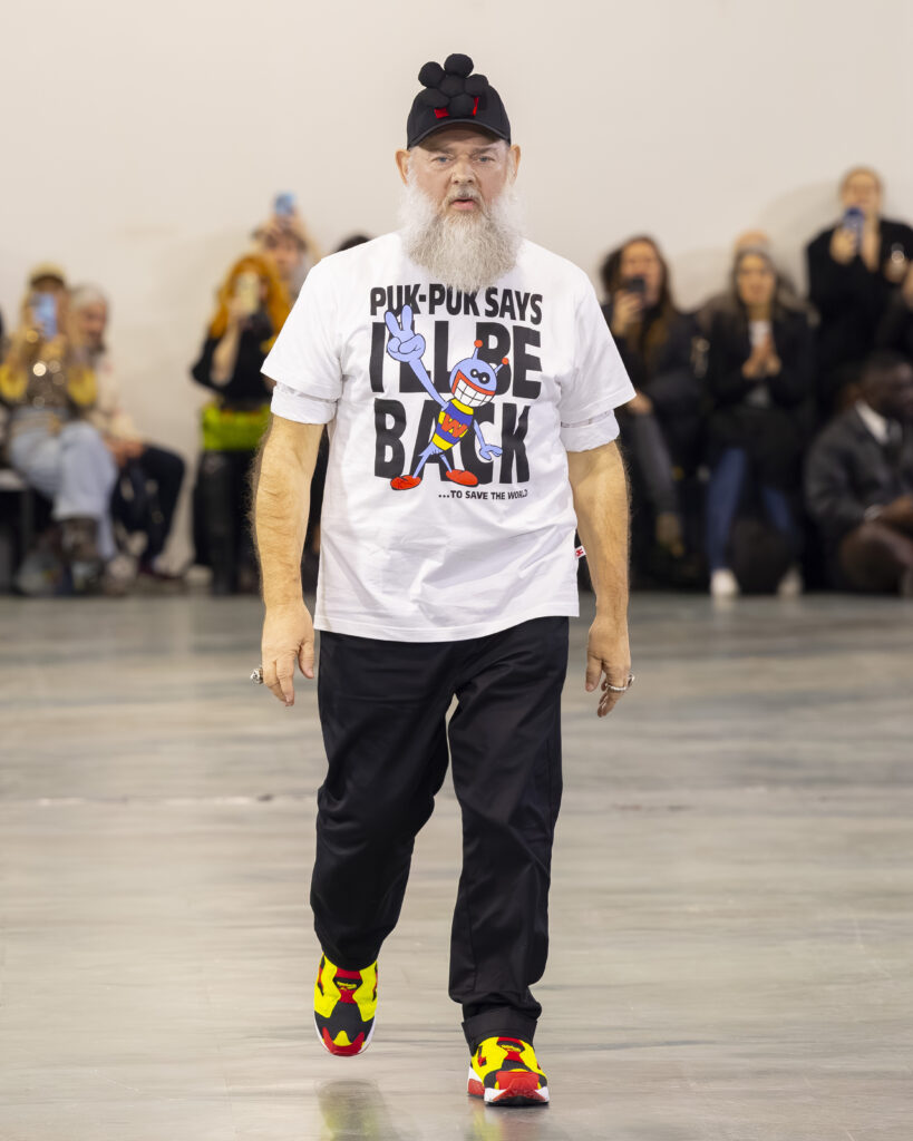 Cela fait quarante ans que Van Beirendonck pratique exactement ça à Anvers. Puk Puk — son personnage-mascotte, présent dans les collections depuis les années 1990 — revient ici comme signal de continuité adressé aux initiés. Non pas la nostalgie d’un designer qui se répète, mais la confirmation qu’une œuvre cohérente n’a pas besoin de se réinventer à chaque saison pour rester juste.