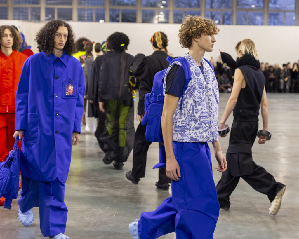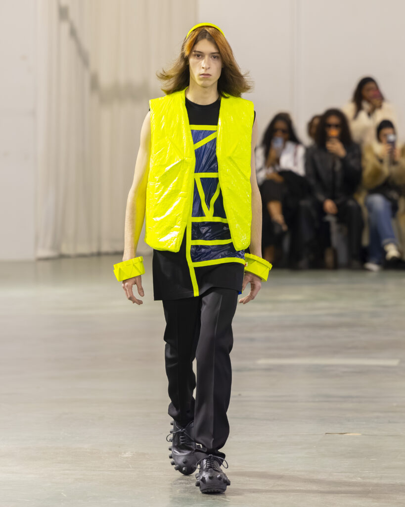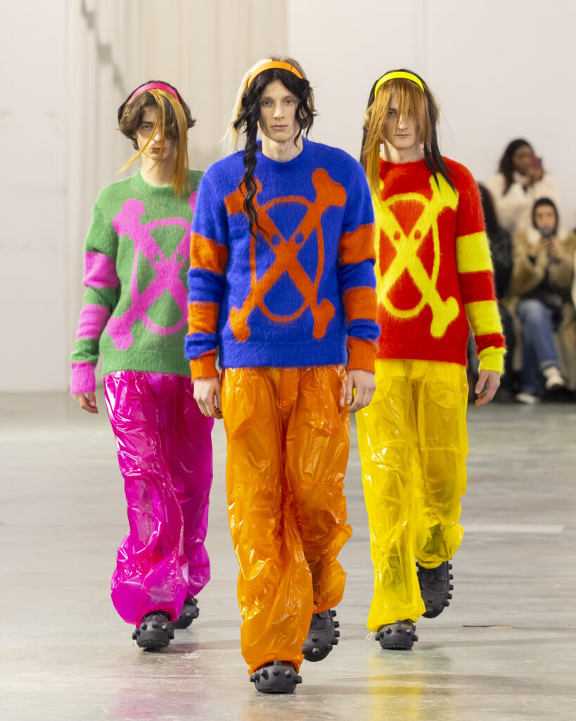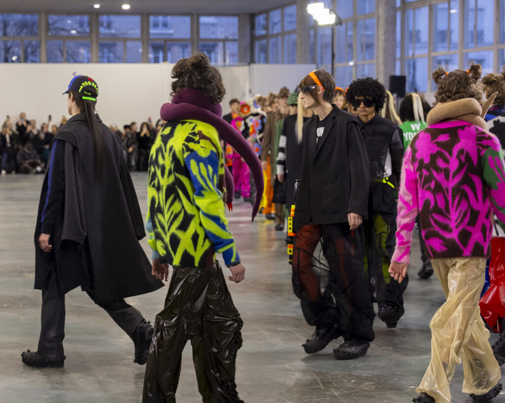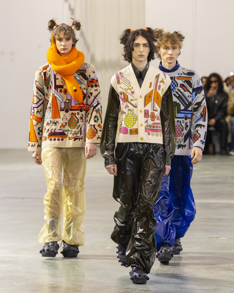 La palette est ton sur ton, plus retenue que dans les collections précédentes du designer, connues pour leur saturation chromatique maximale. Les laines britanniques sont croisées avec nylon et plastique. L’assemblage de matières — noble et technique, chaud et synthétique — reproduit structurellement la logique Robillard : on prend ce qui est là, on voit ce que ça fait ensemble.