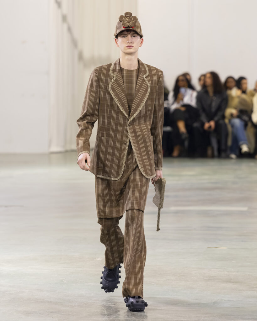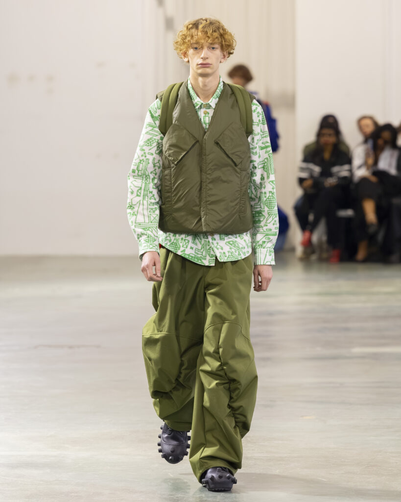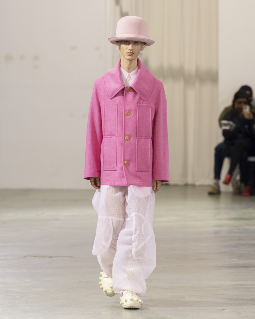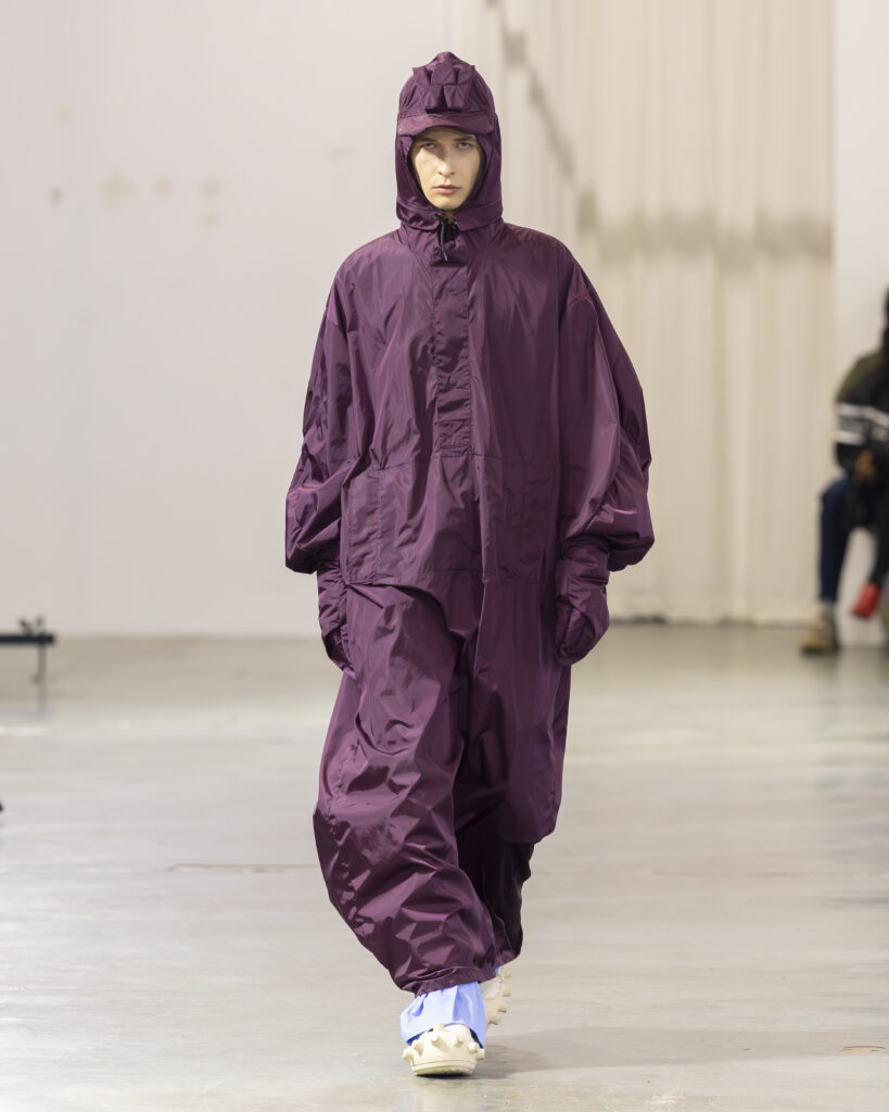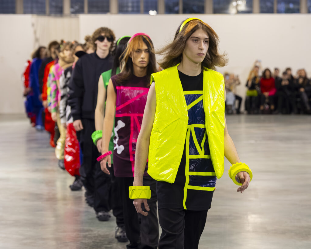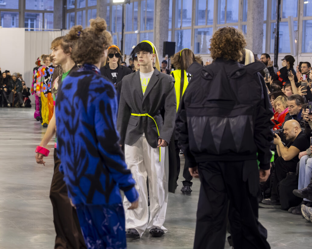 La palette est ton sur ton, plus retenue que dans les collections précédentes du designer, connues pour leur saturation chromatique maximale. Les laines britanniques sont croisées avec nylon et plastique. L’assemblage de matières — noble et technique, chaud et synthétique — reproduit structurellement la logique Robillard : on prend ce qui est là, on voit ce que ça fait ensemble.