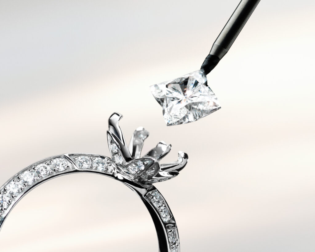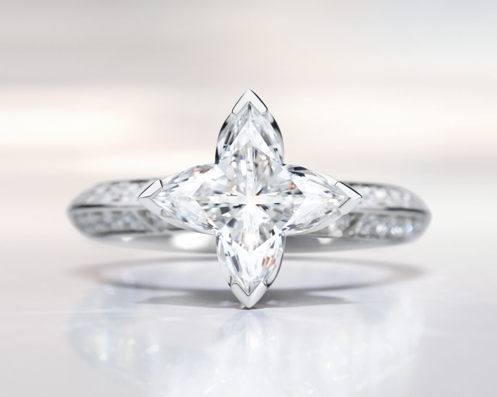 La taille LV Monogram Star, développée sur plusieurs années, revendique une filiation directe avec la toile de Monogram imaginée par Gaston Vuitton en 1896. Traduction technique: une géométrie de pétales symétriques pensée pour libérer scintillement, relief et profondeur. La coupe annonce cinquante-trois facettes, là où un brillant classique en compte cinquante-sept. Moins de facettes ne veut pas dire moins de lumière, si l’orientation, la taille et le polissage ont été recalibrés pour optimiser la capture lumineuse. C’est exactement ce que la Maison met en avant: un travail de réglage facette par facette, exécuté et poli à la main.