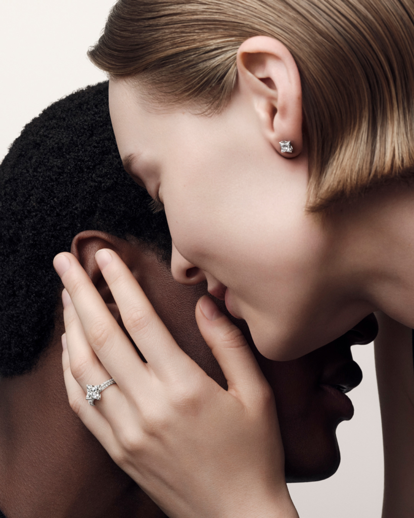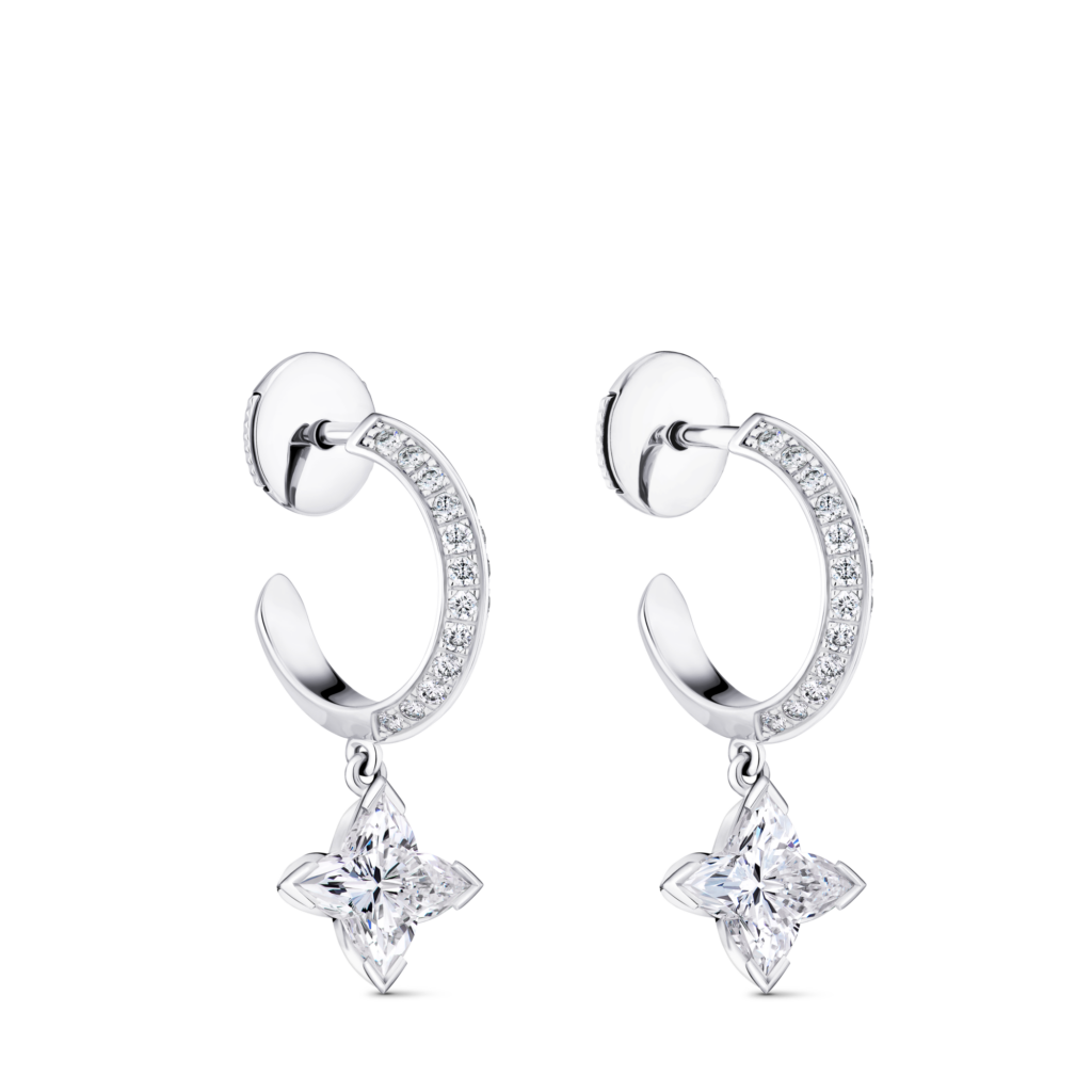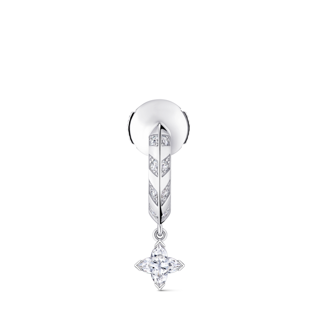 Côté pièces, trois propositions assument une silhouette contemporaine: une mono-créole, une paire de créoles et un earcuff. Rien de révolutionnaire dans les catégories, mais un signal sur l’usage: le diamant s’envisage en accumulation, en friction avec le quotidien, pas en vitrine. La quatrième création est une bague qui reprend la Fleur de Monogram pavée de diamants, associée à un diamant taille ronde, en écho à un pendentif déjà présent dans la collection. Les métaux annoncés: or et platine, sans précision à ce stade sur les alliages ou les finitions.