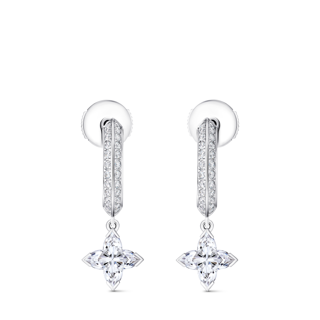 La collection LV Diamonds existe depuis 2022 et se place volontairement sur le terrain du bijou de sentiment – bagues, solitaires, alliances, motifs d’oreilles, pendentifs. Le point intéressant n’est pas la promesse romantique (ça, tout le monde sait faire), mais la façon dont la Maison tente de fabriquer une signature joaillière à partir d’un vocabulaire qu’elle maitrise déjà: la Fleur de Monogram. Dans ces nouveautés, la fleur n’est pas un motif posé, c’est un système de lecture: elle devient l’argument de forme, et la pierre suit.
