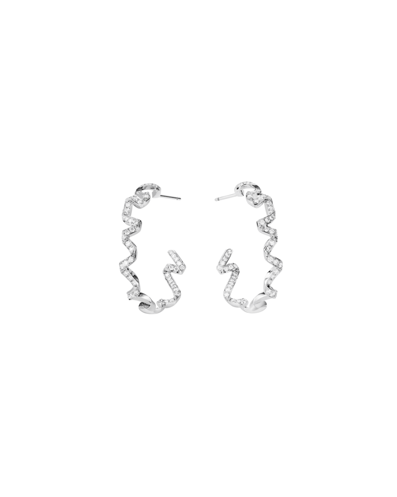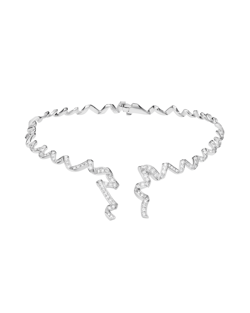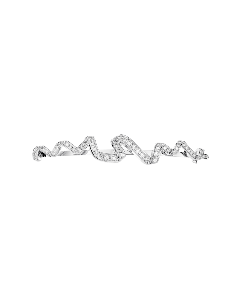 Ce ruban, de Castellane le reprend en or blanc poli et le confronte aux diamants. Le contraste n’est pas ornemental — il est structurel. Le poli capte la lumière de façon directionnelle, comme ferait une surface de soie tendue ; les diamants, eux, la dispersent. Entre les deux, la légère asymétrie qu’elle introduit dans le torsadé traduit ce que le textile accomplit naturellement sous la tension du corps : une ondulation, un relâchement calculé.