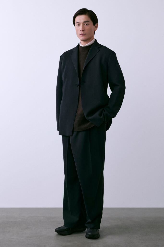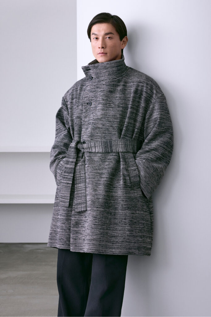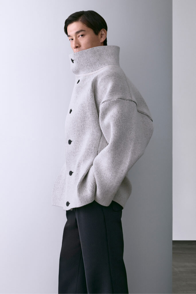VOL.12 applique ce procédé à une proposition précise : le workwear masculin adulte. Non pas le costume — avec ce que le mot implique d’armature, de toile thermocollée, d’épaule construite — mais une présence composée qui n’exige ni cintre spécial ni pressing. Les structures sont en maille drapée souple. La palette est sourde. Le vêtement ne signale pas l’effort de sa fabrication, et c’est exactement l’intention.