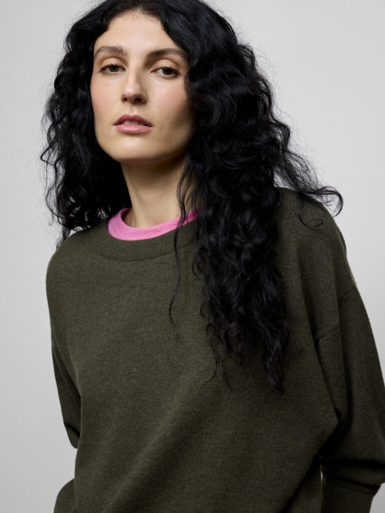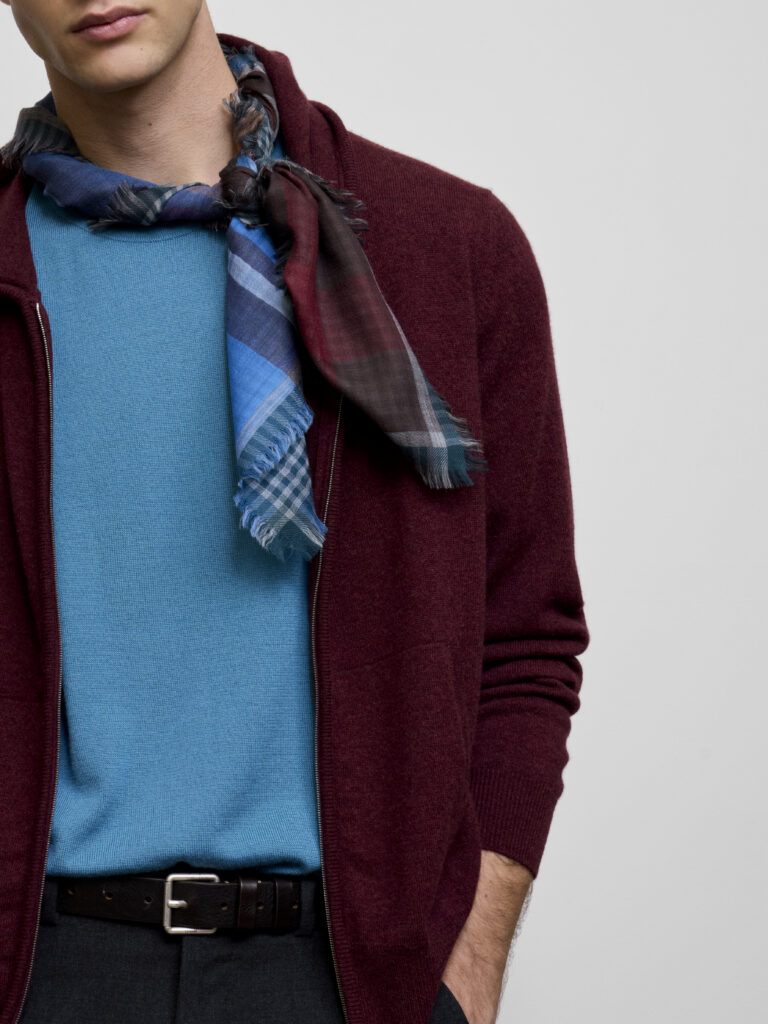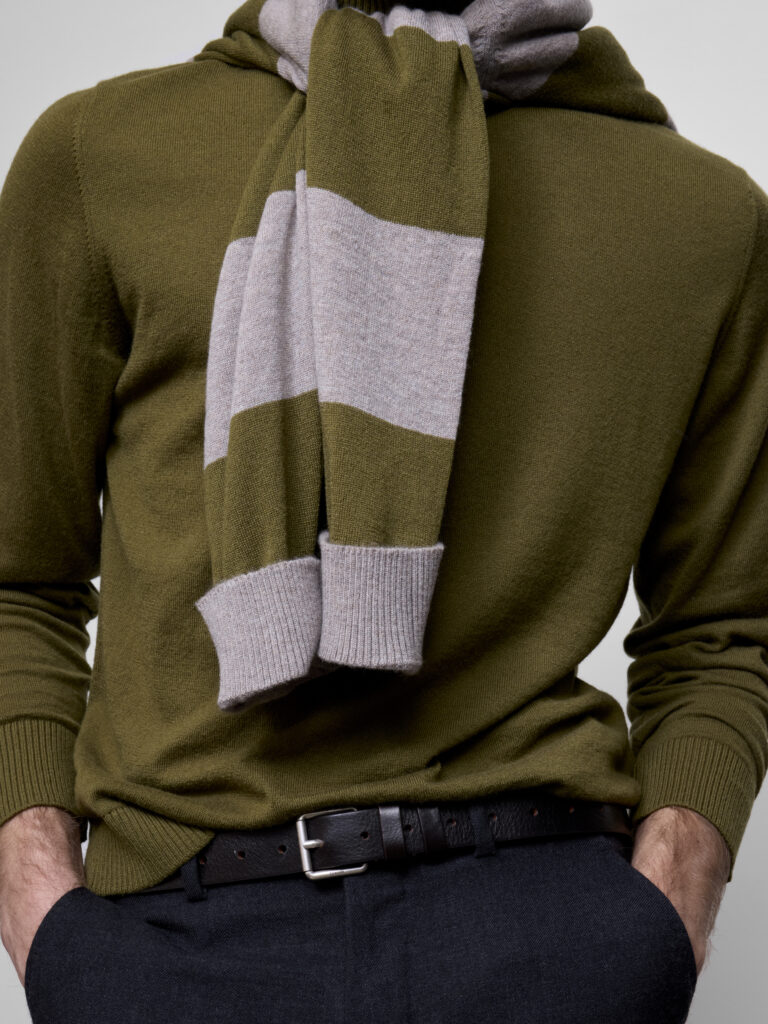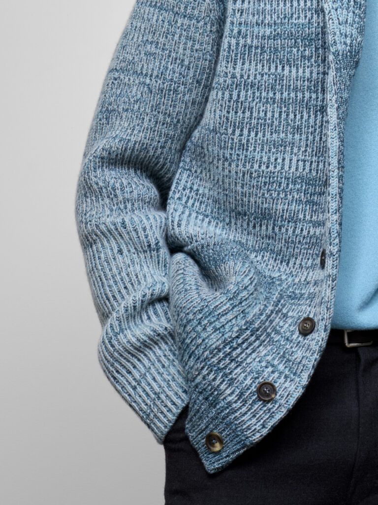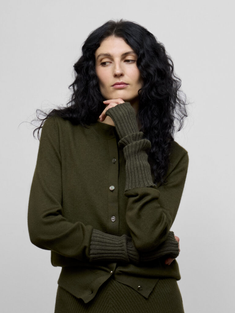 Le nouveau mélange cachemire/laine d’agneau — utilisé dans le pull et la veste Boyd — témoigne de la même logique de contrainte assumée. La laine d’agneau, plus rigide que le cachemire pur, apporte la structure que ce dernier ne peut fournir seul dans des constructions de maille bouclée. Ce n’est pas un compromis économique vers le bas ; c’est une réponse technique à un problème de tenue de forme.
