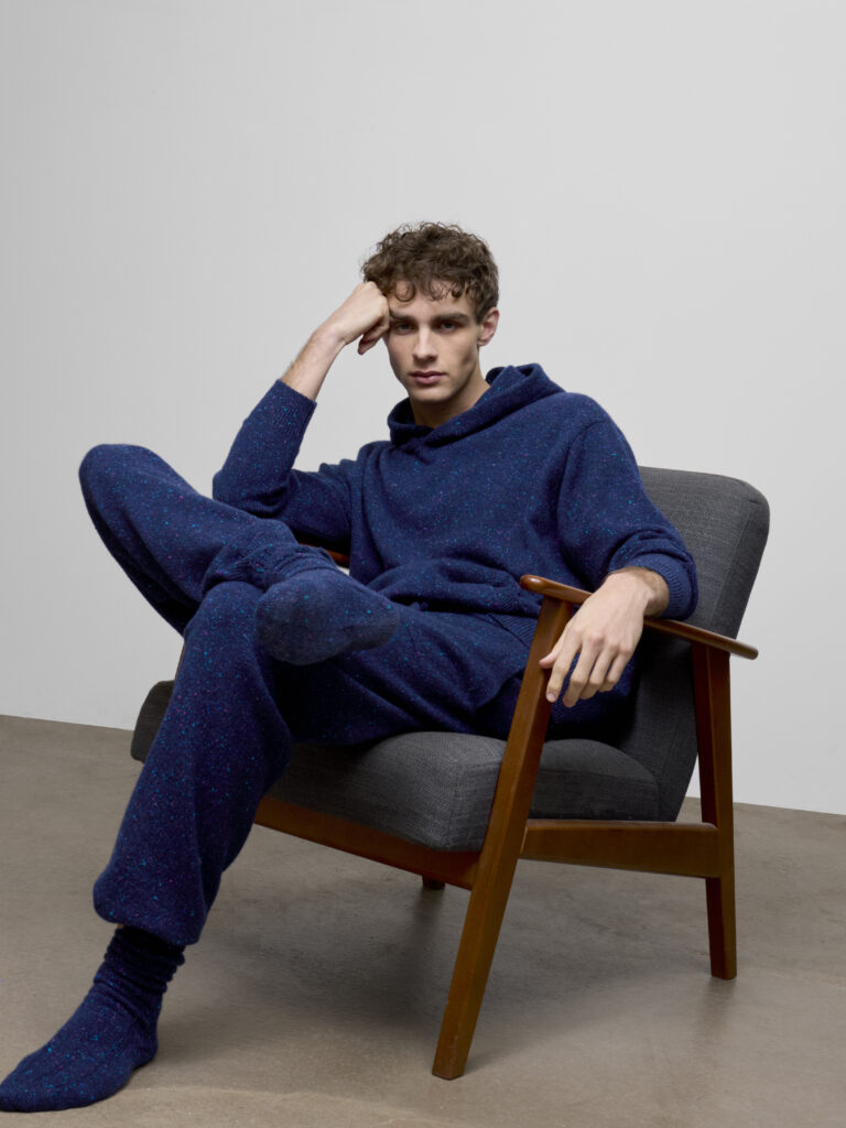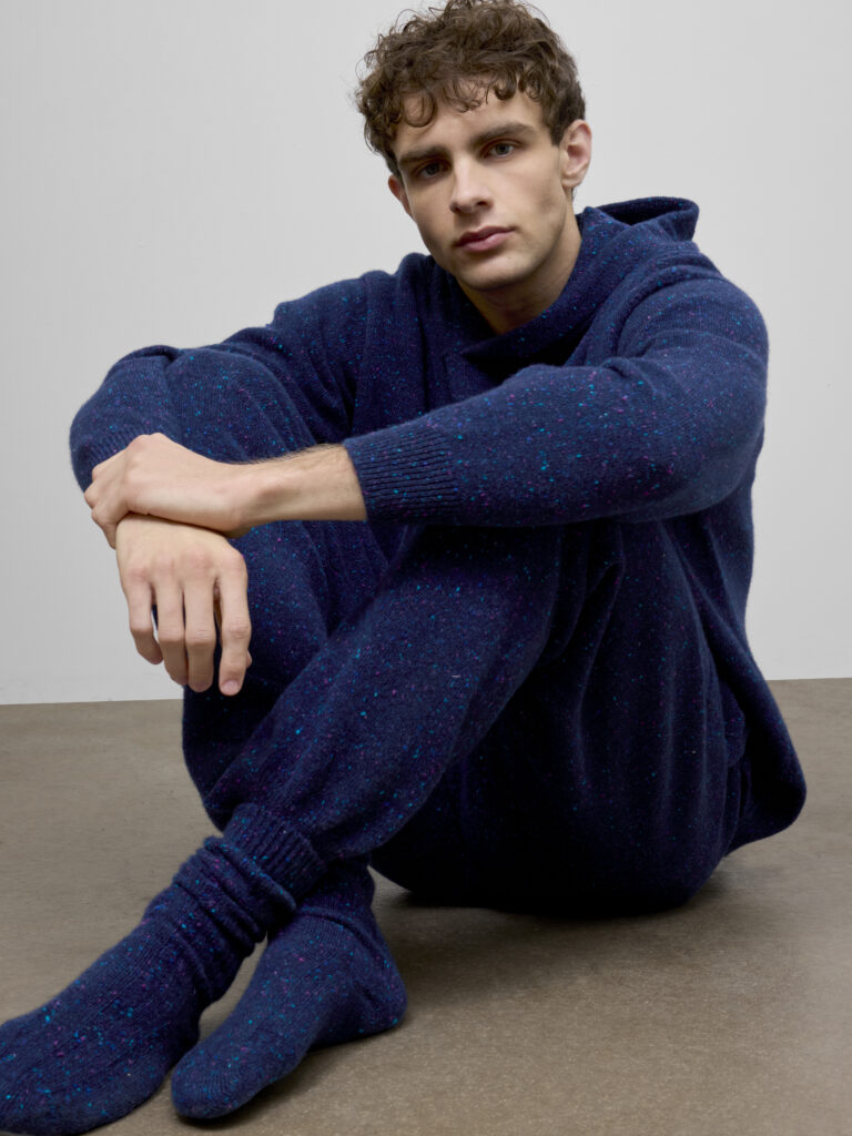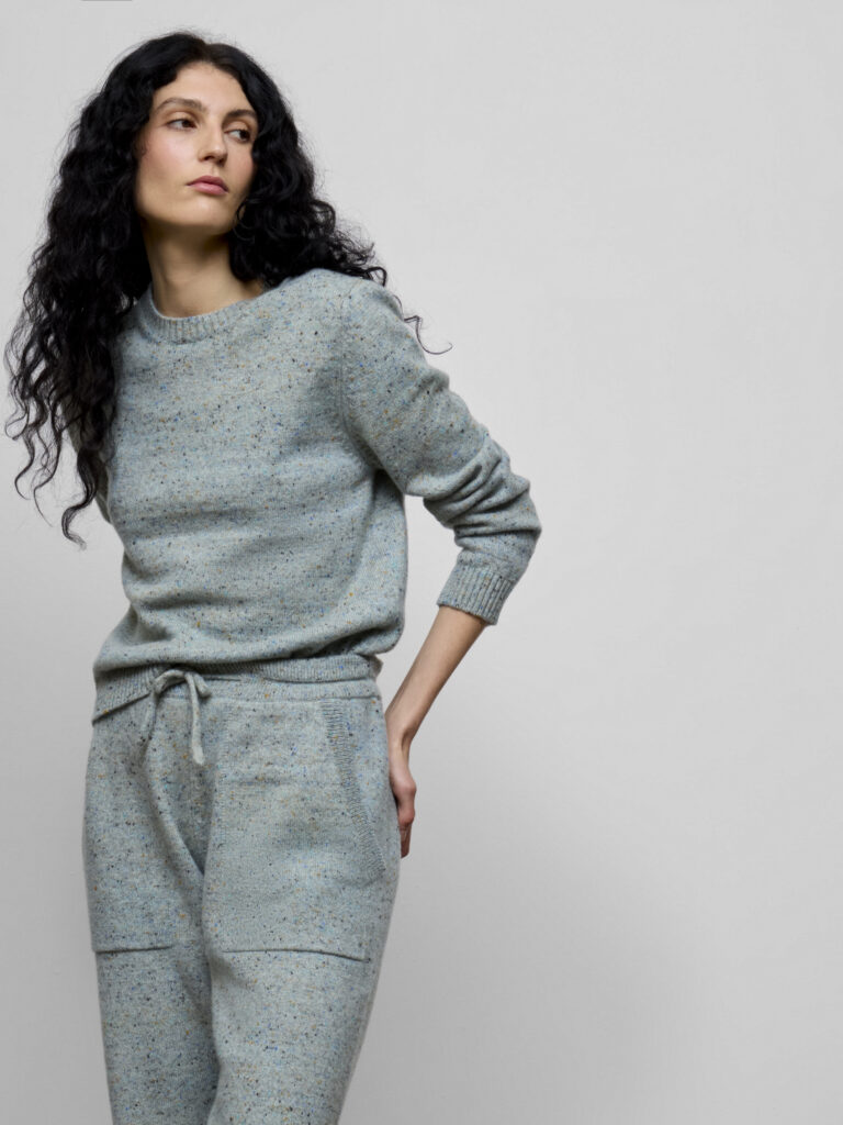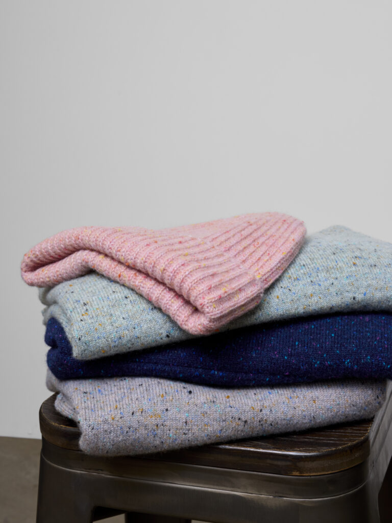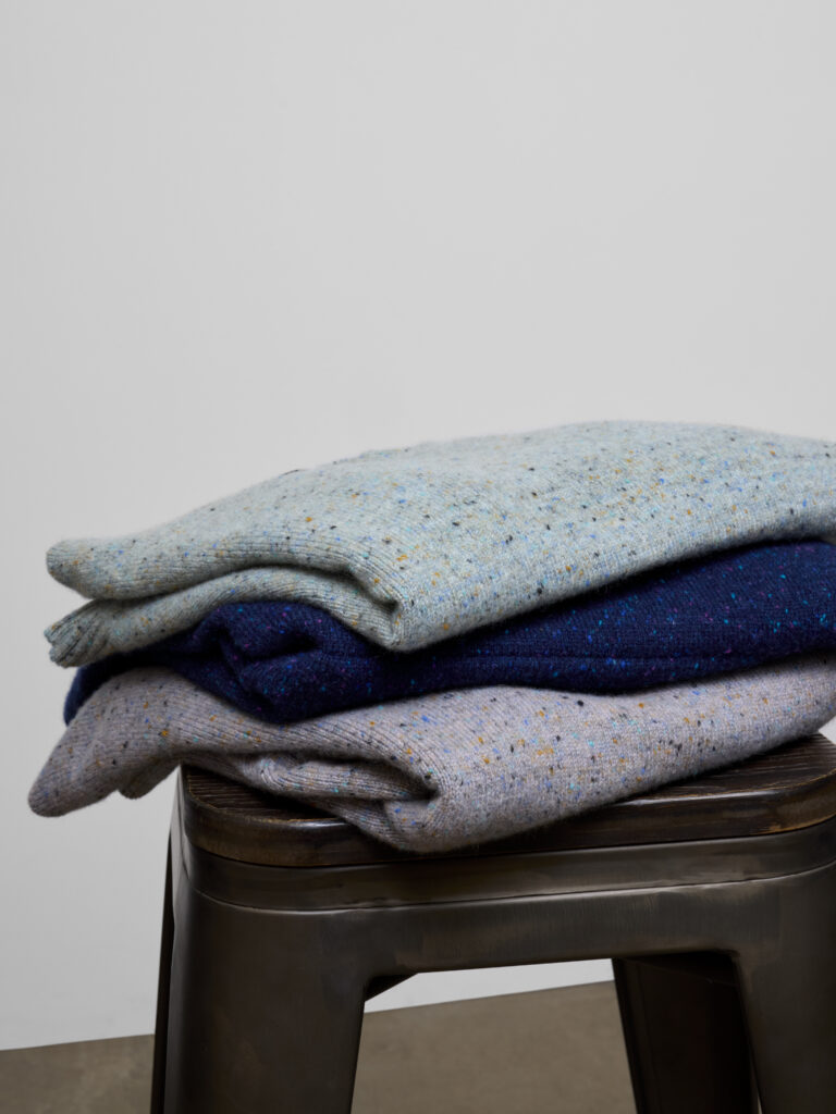 Le cachemire Donegal — décliné dans les modèles Brennan et Bethany — doit sa texture mouchetée à un procédé d’insertion de fibres colorées lors du filage. Des points de couleur sont incorporés dans la mèche avant la torsion, créant un effet de moucheture irrégulière qui rappelle visuellement les ardoises humides et les landes de bruyère. Cette technique, historiquement associée aux laines du comté de Donegal en Irlande, est ici appliquée au cachemire — matière plus fine, plus délicate à travailler, qui amplifie la variabilité visuelle du résultat.