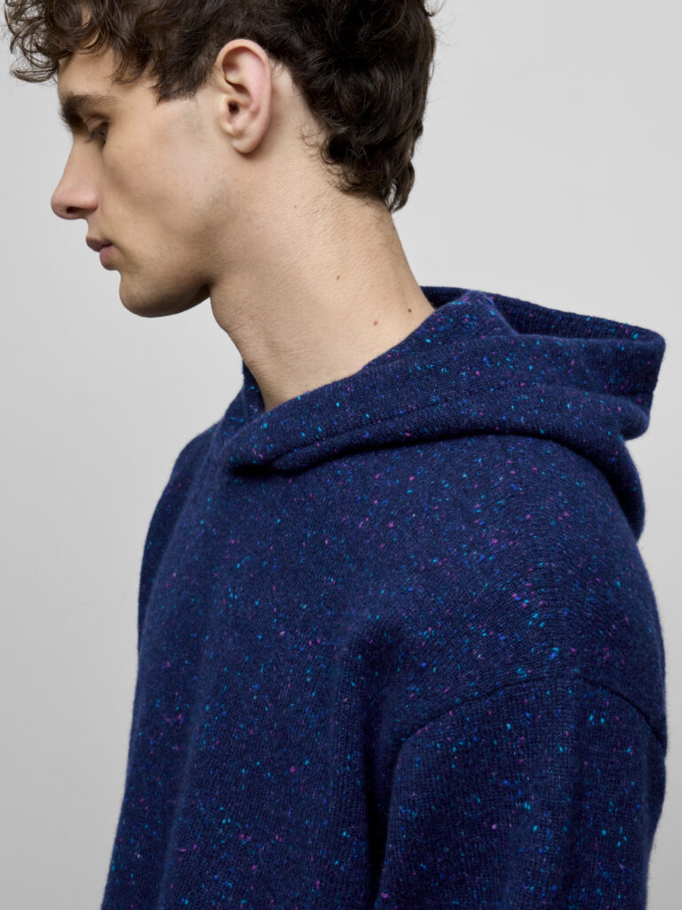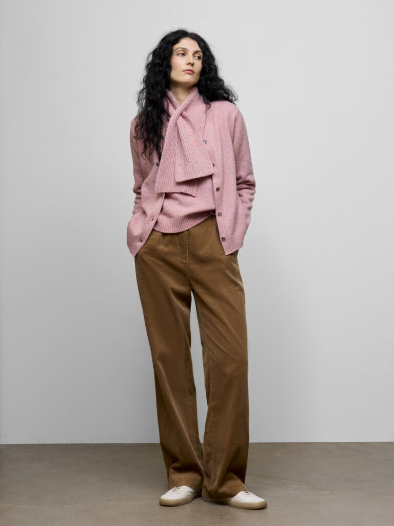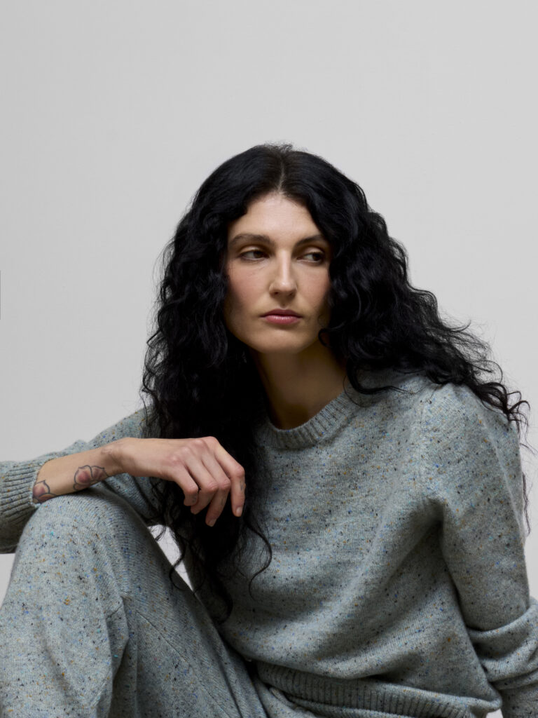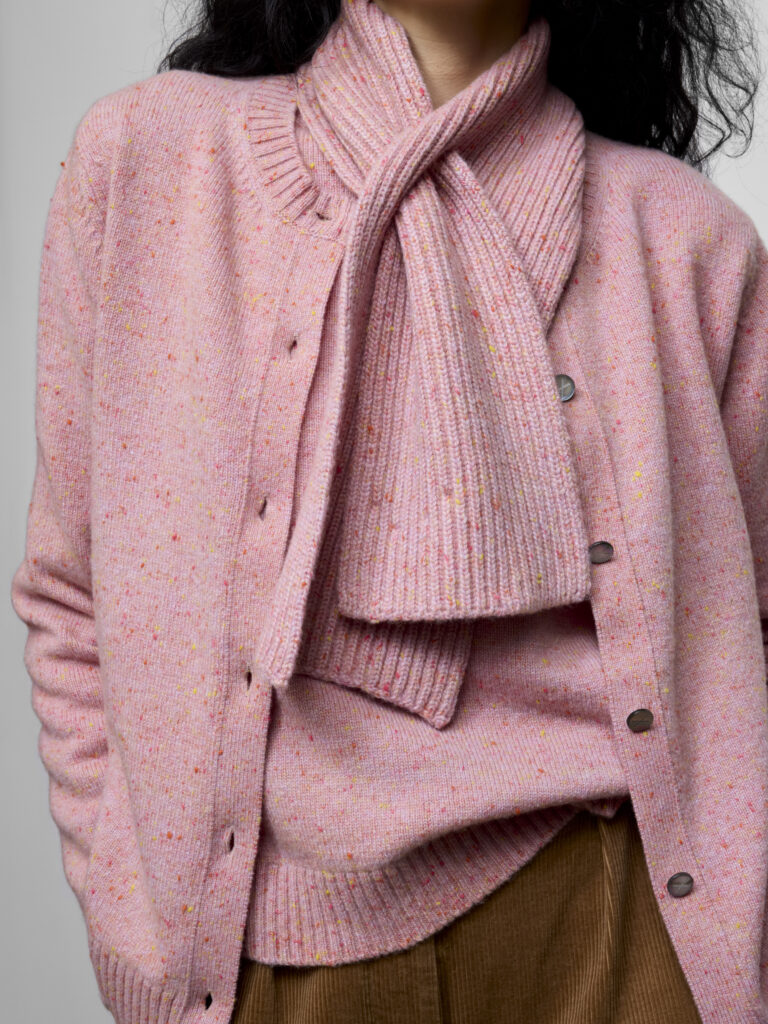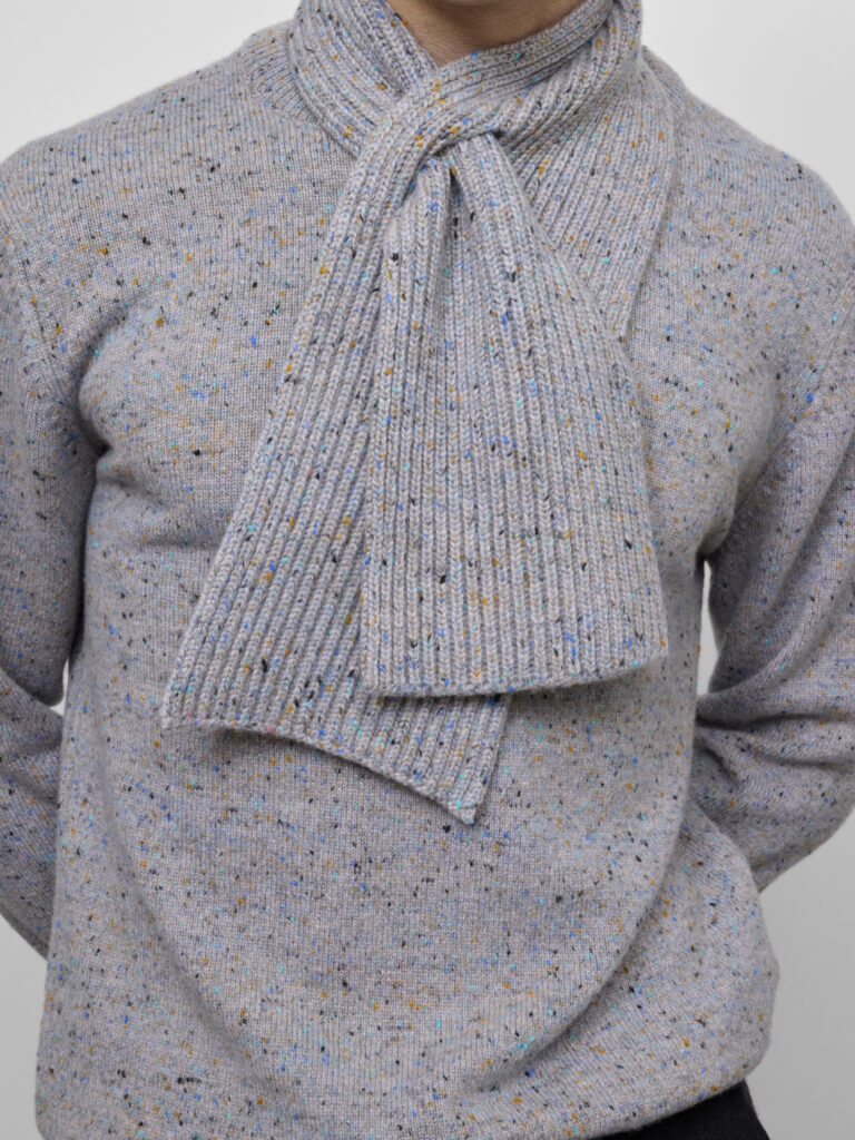 Le cachemire Donegal — décliné dans les modèles Brennan et Bethany — doit sa texture mouchetée à un procédé d’insertion de fibres colorées lors du filage. Des points de couleur sont incorporés dans la mèche avant la torsion, créant un effet de moucheture irrégulière qui rappelle visuellement les ardoises humides et les landes de bruyère. Cette technique, historiquement associée aux laines du comté de Donegal en Irlande, est ici appliquée au cachemire — matière plus fine, plus délicate à travailler, qui amplifie la variabilité visuelle du résultat.
