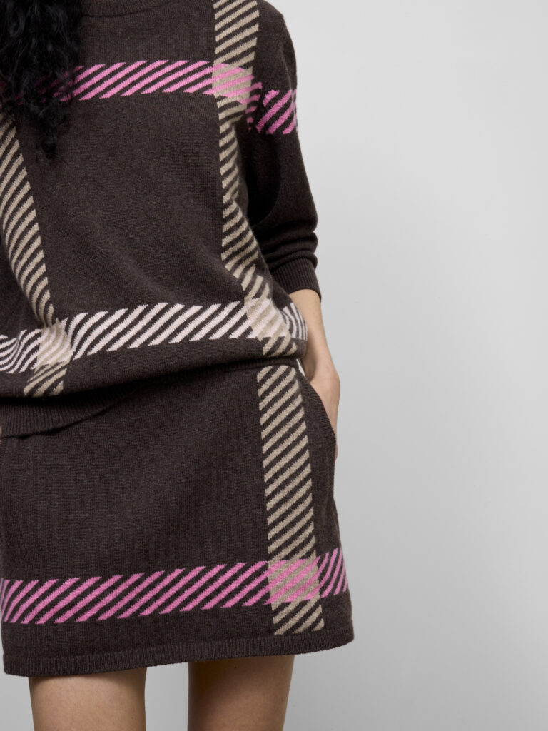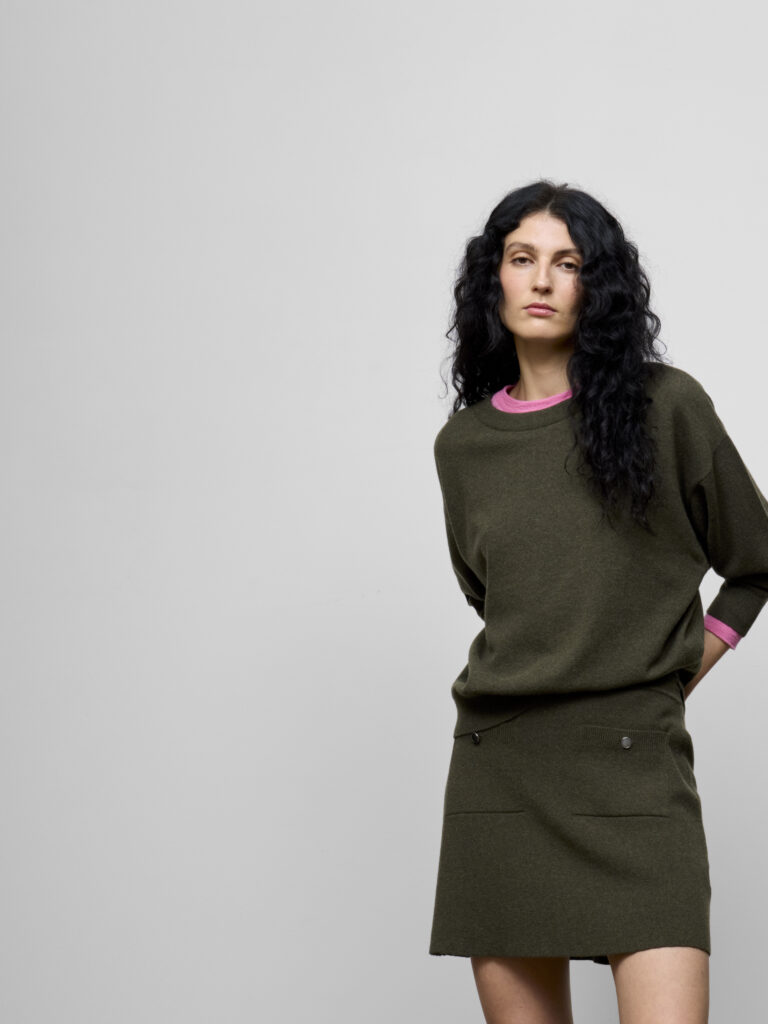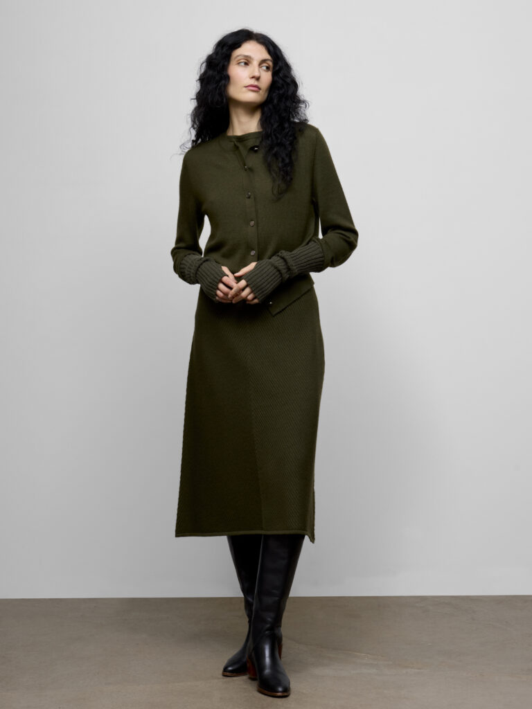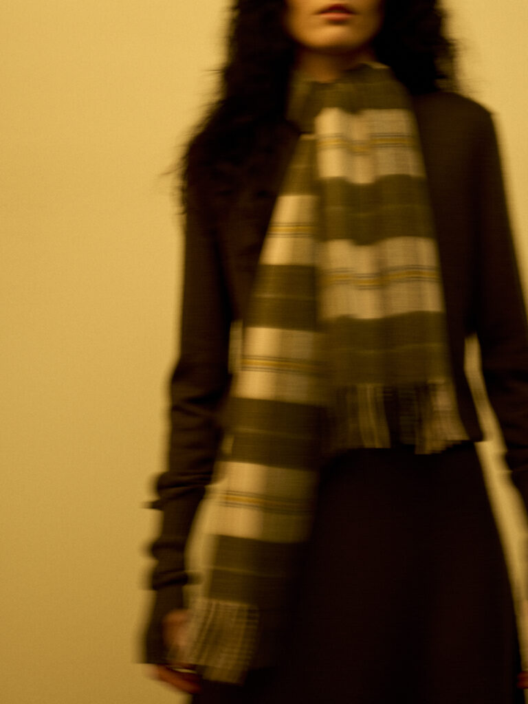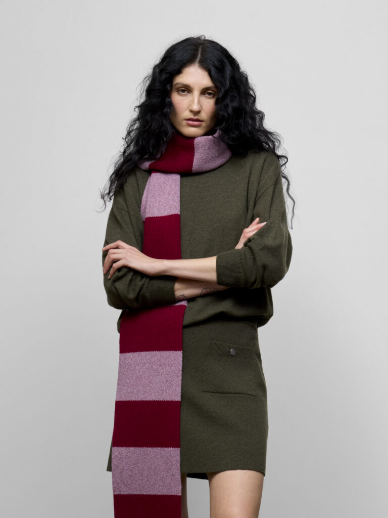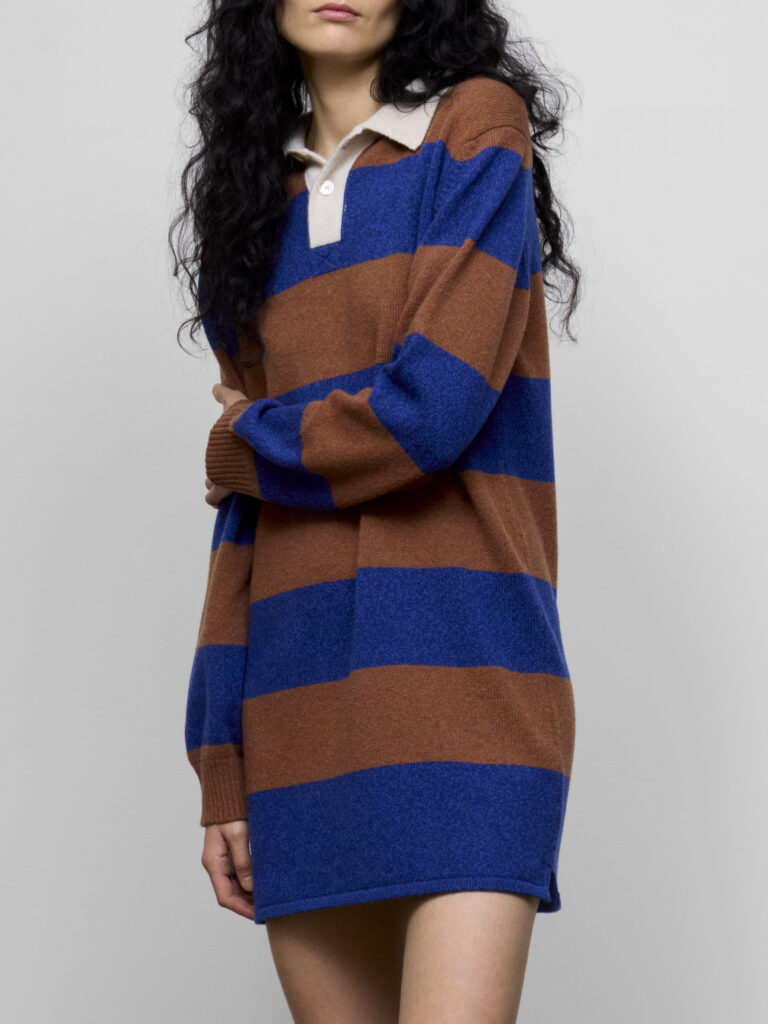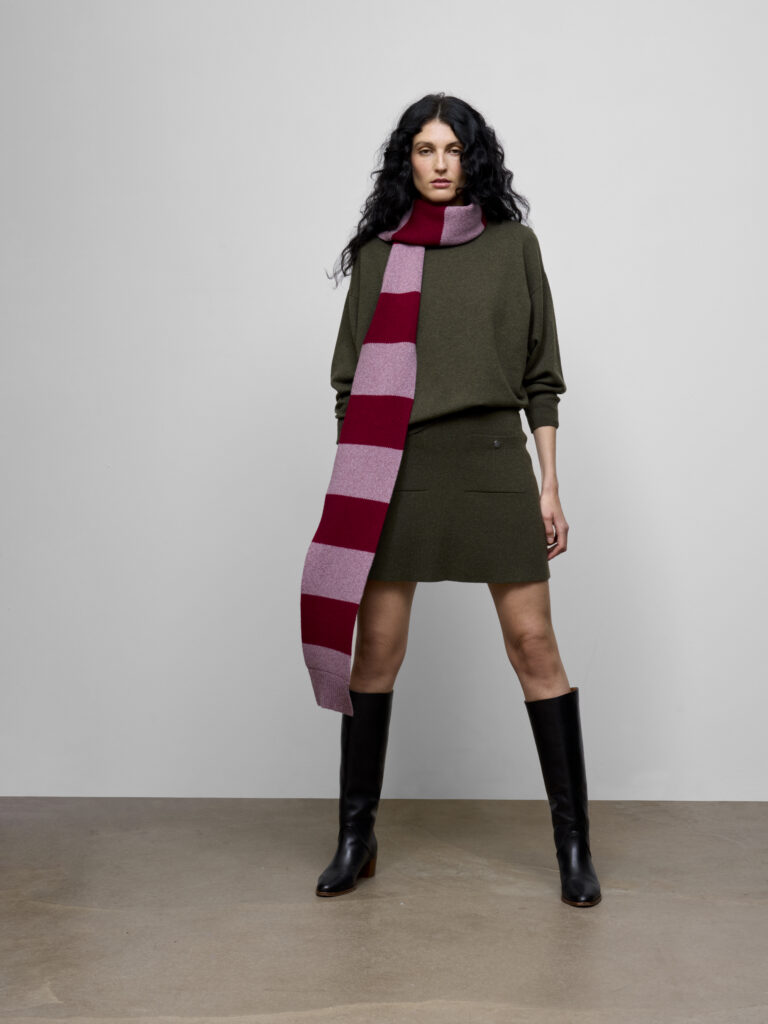 Le maillot de rugby en cachemire incarne cet ancrage avec une précision presque ethnographique. La ville de Hawick, où se trouve l’un des deux ateliers de la manufacture, est une ville de rugby. Pas métaphoriquement : la ville compte parmi les plus titrées du rugby écossais, et le maillot rayé y est un objet culturel autant qu’un vêtement. Begg x Co ne l’adapte pas — elle le transpose, en le déclinant en silhouette courte et ajustée, puis en robe. La fonction sportive devient prétexte à une relecture de la proportion.