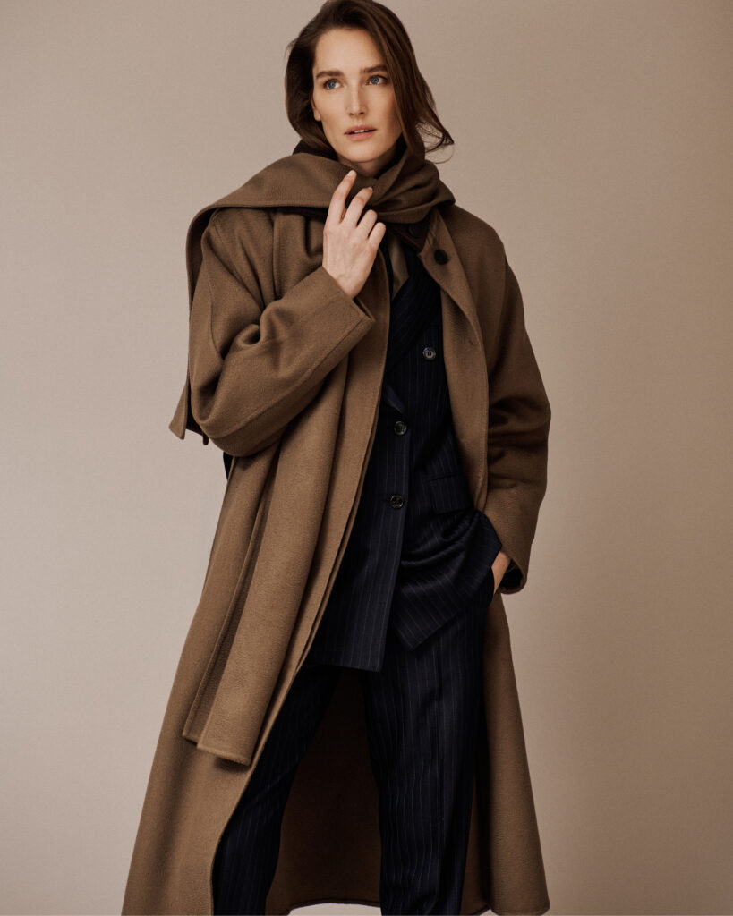 La collection ne s’invente pas un langage. Elle emprunte celui du service Bespoke masculin de la Maison — le même répertoire de tissus, les mêmes doubles laines, les mêmes grilles de personnalisation avec sélection de doublures, de boutons et d’options de monogramme. Ce que le client masculin choisit depuis des décennies dans les carnets de l’atelier romain, la cliente le choisit désormais selon le même protocole.