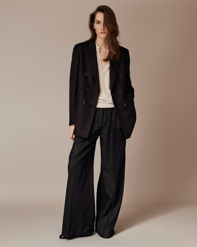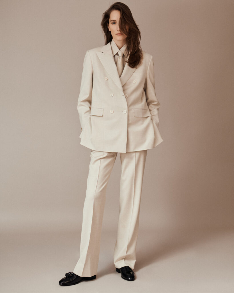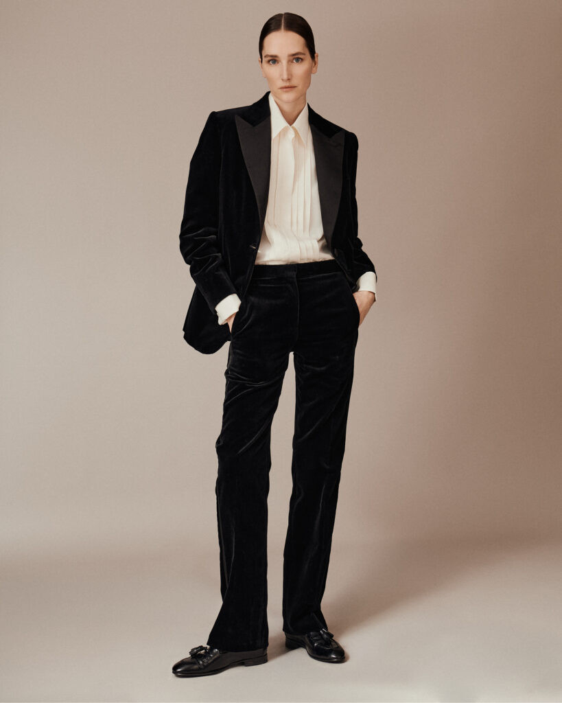 La marque évoque l’héritage du power suit Brioni. Ce n’est pas une posture nostalgique — c’est une indication de méthode. Le tailleur-pantalon tel que la Maison l’a développé pour l’homme repose sur l’équilibre entre autorité visuelle et confort de mouvement. Appliquer cette logique au vestiaire féminin, du professionnel au décontracté jusqu’aux silhouettes du soir, revient à refuser la distinction habituelle entre vêtement de travail et vêtement de représentation — une distinction que le tailoring masculin n’a jamais vraiment connue.