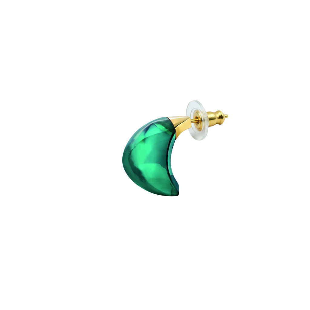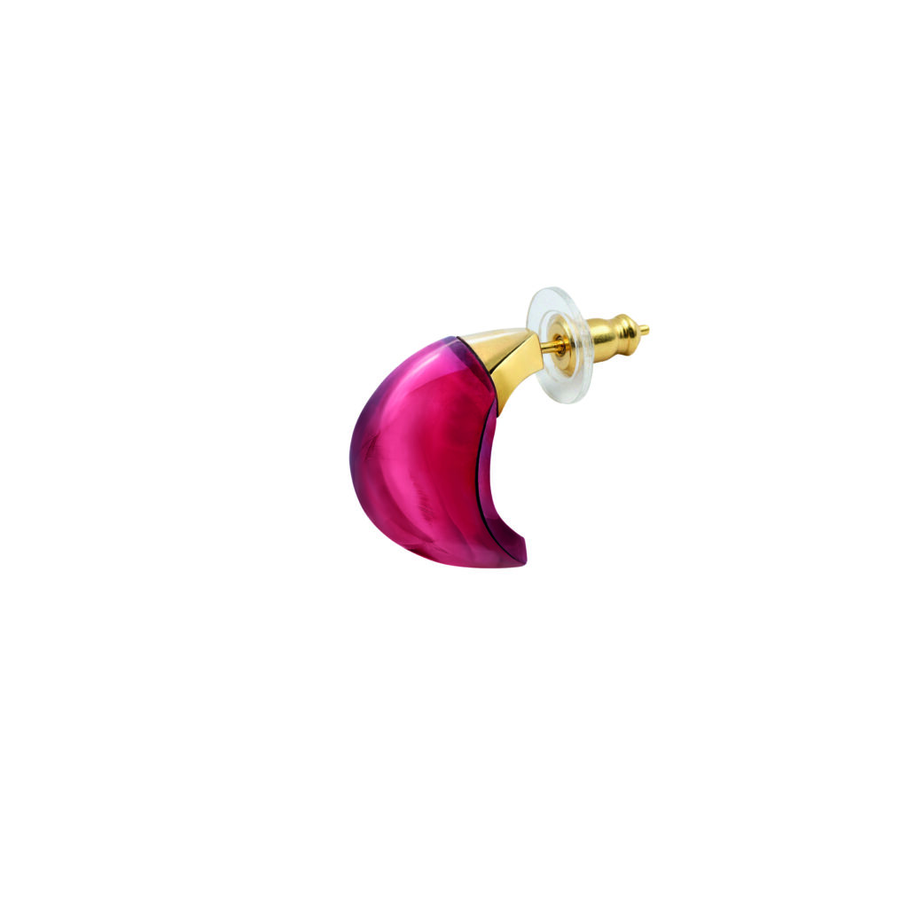 Les boucles d’oreilles reprennent le volume arrondi du Cabochon originel. Le cristal est serti sur argent rhodié ou plaqué or jaune, en fonction du coloris choisi. La forme épouse le lobe, et le poids — non communiqué dans les documents techniques fournis — a été calibré pour permettre un port prolongé sans déséquilibre.