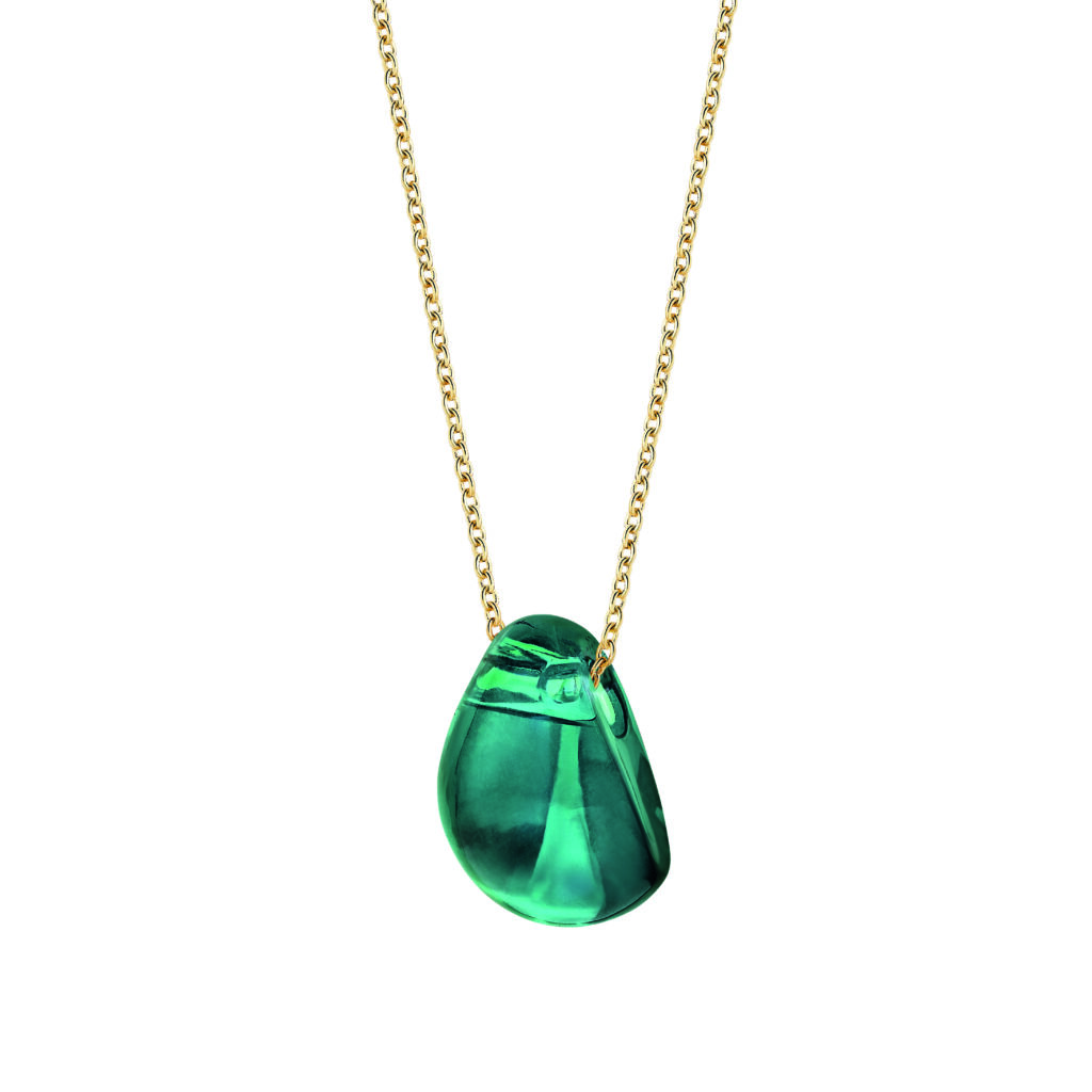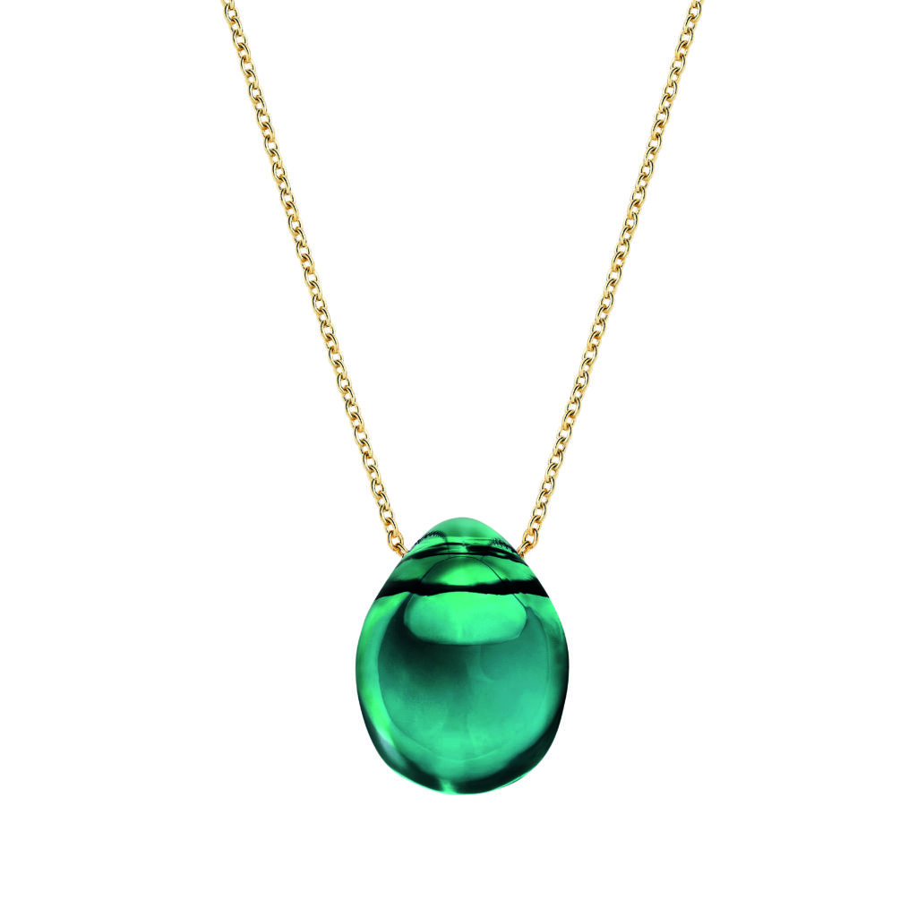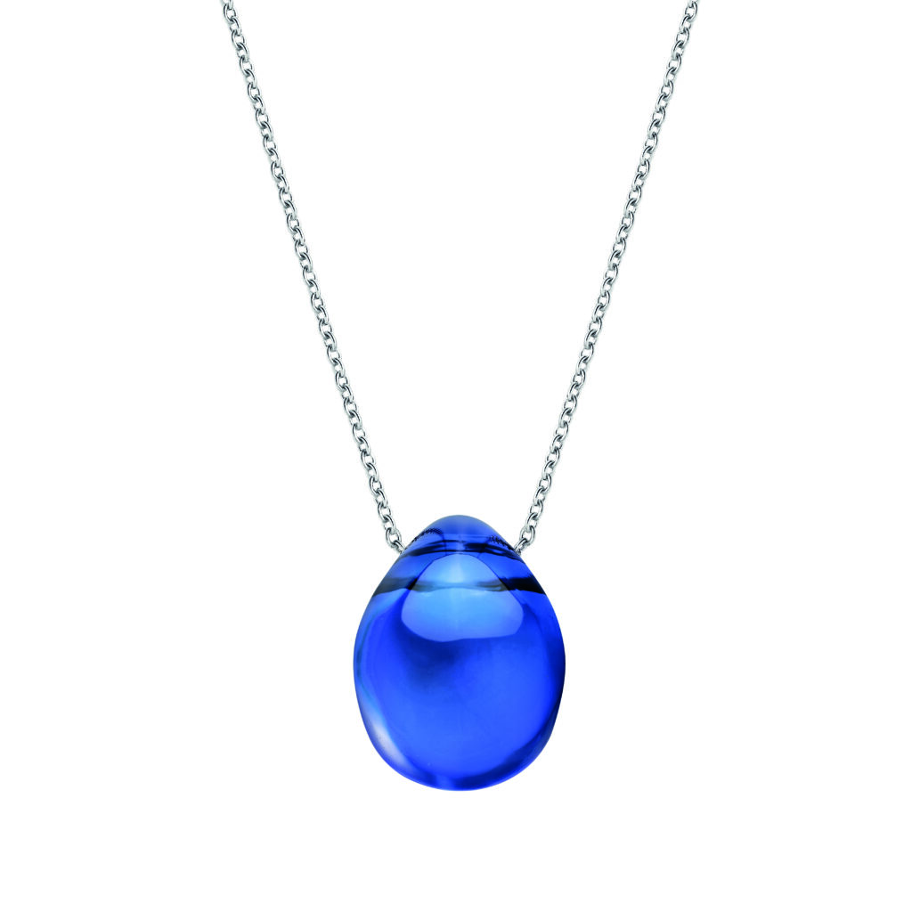 Le pendentif suspend une goutte de cristal au décolleté, portée par une chaîne forçat ronde en argent rhodié ou plaqué or jaune. La longueur est ajustable pour s’adapter à différentes morphologies. La pièce est conçue pour rester stable — le cristal ne doit pas tourner sur lui-même lors des mouvements.
