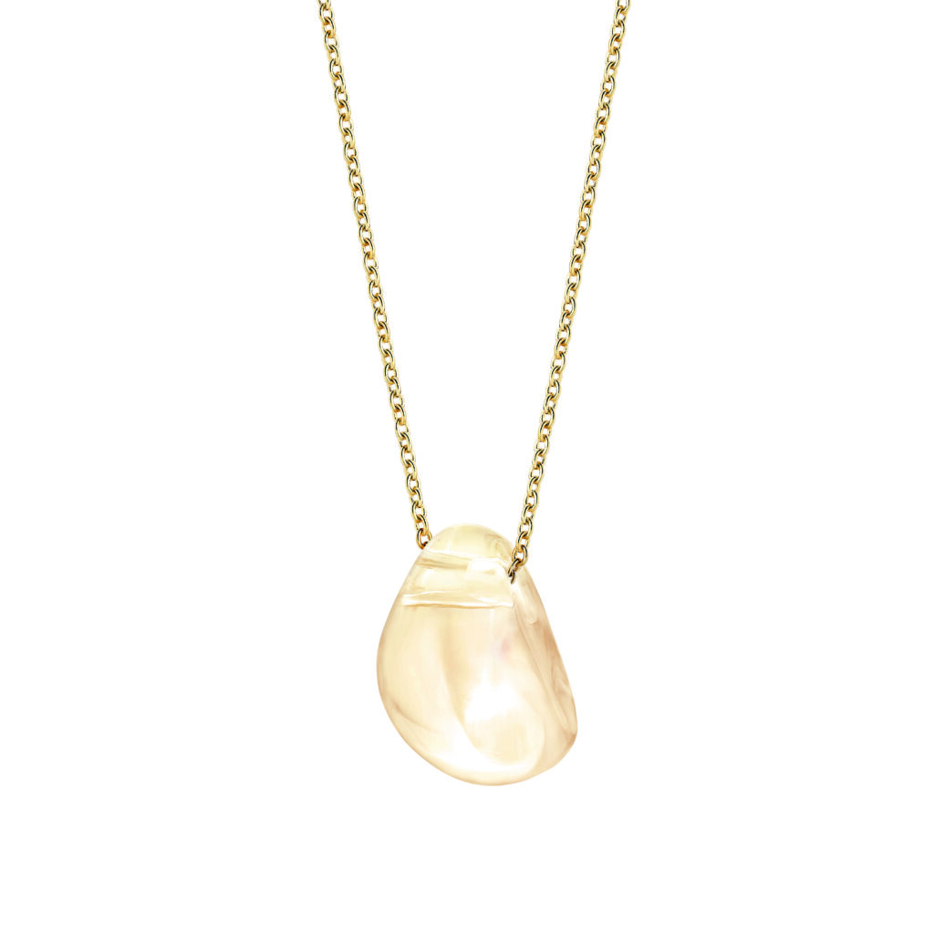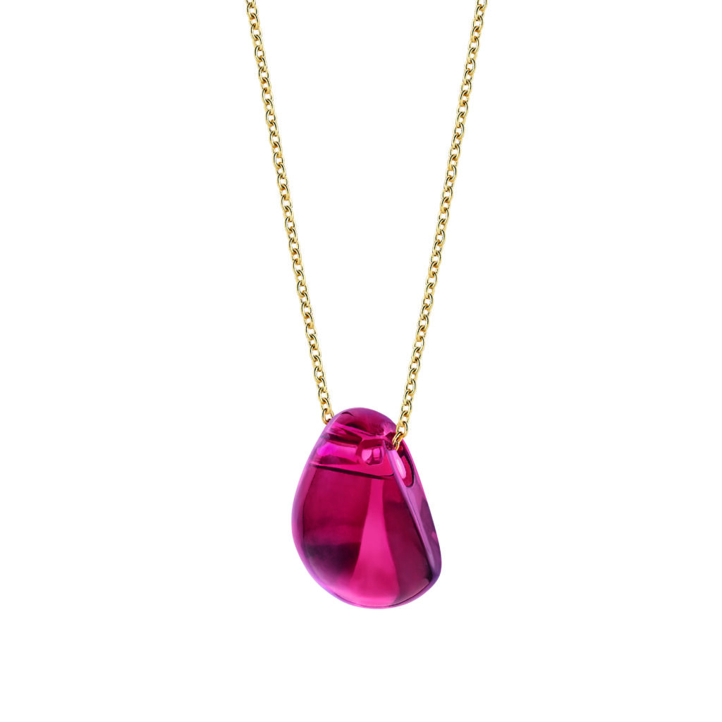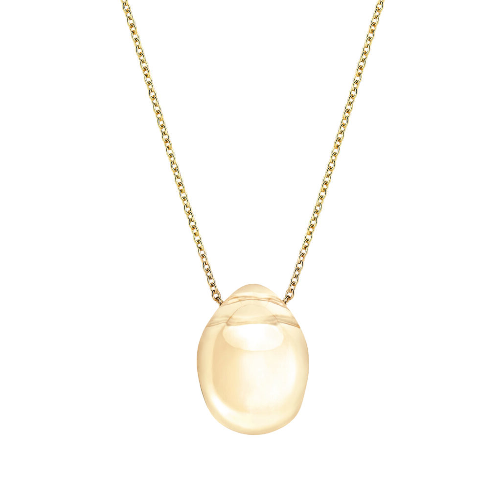 Le pendentif suspend une goutte de cristal au décolleté, portée par une chaîne forçat ronde en argent rhodié ou plaqué or jaune. La longueur est ajustable pour s’adapter à différentes morphologies. La pièce est conçue pour rester stable — le cristal ne doit pas tourner sur lui-même lors des mouvements.