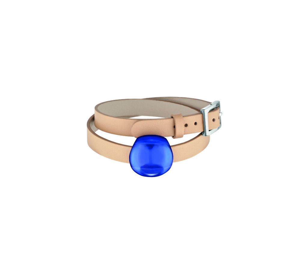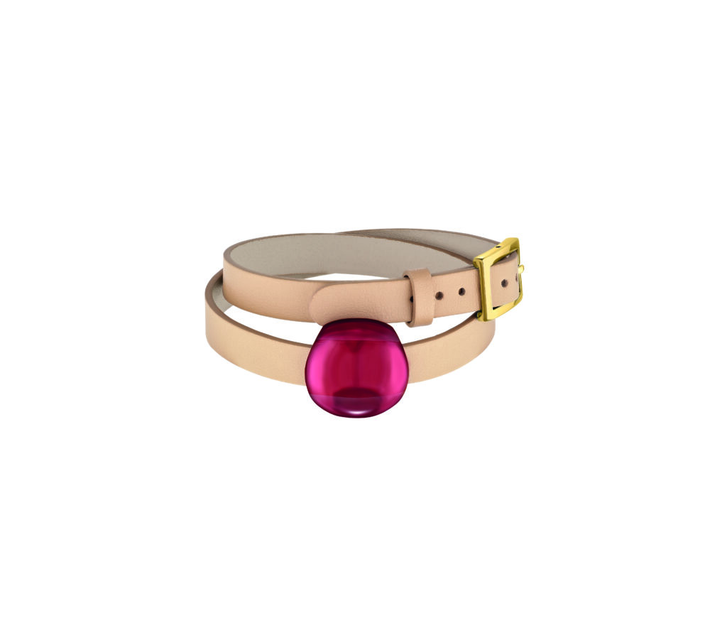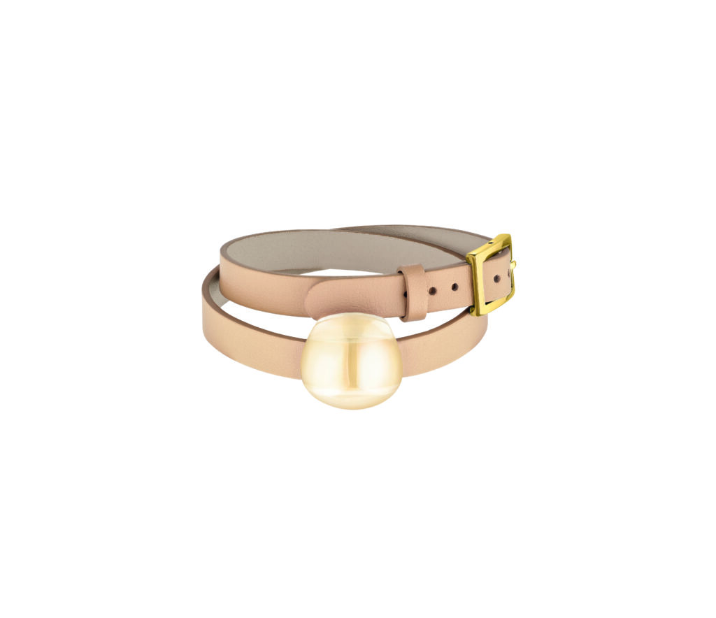 Le bracelet pose le cristal sur un double tour de cuir. Les bords sont légèrement rembourrés, et la boucle plaquée or limite les frottements sur le poignet. Ce choix du cuir, rare dans l’univers joaillier de Lalique, introduit une matière organique face à la rigidité du cristal — dialogue textile-minéral qu’Hermès maîtrise depuis longtemps, mais que Lalique explore ici avec retenue.