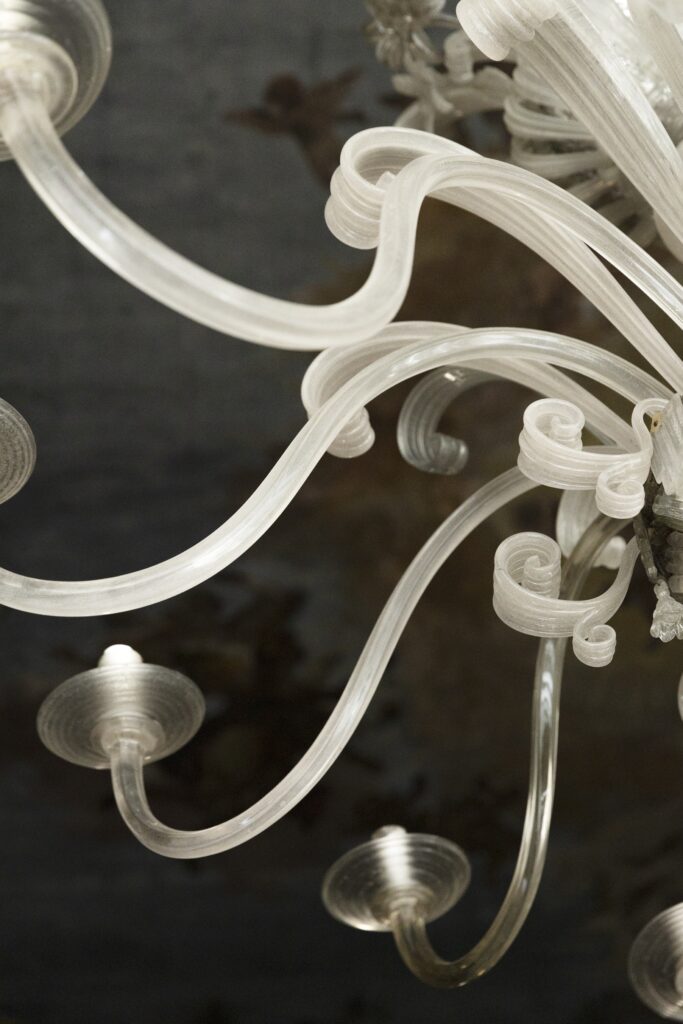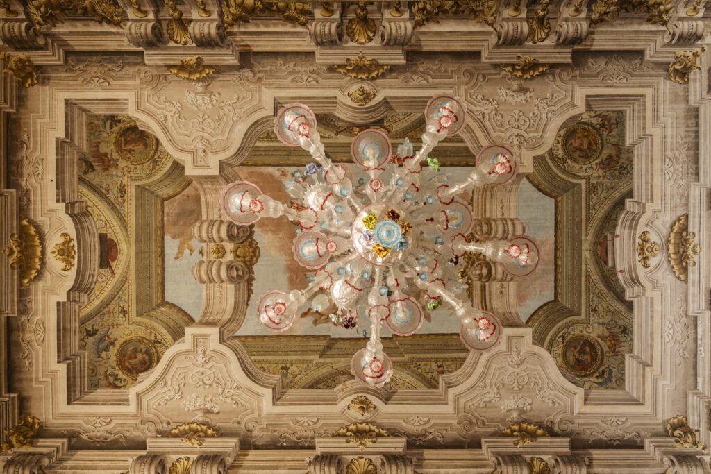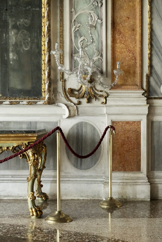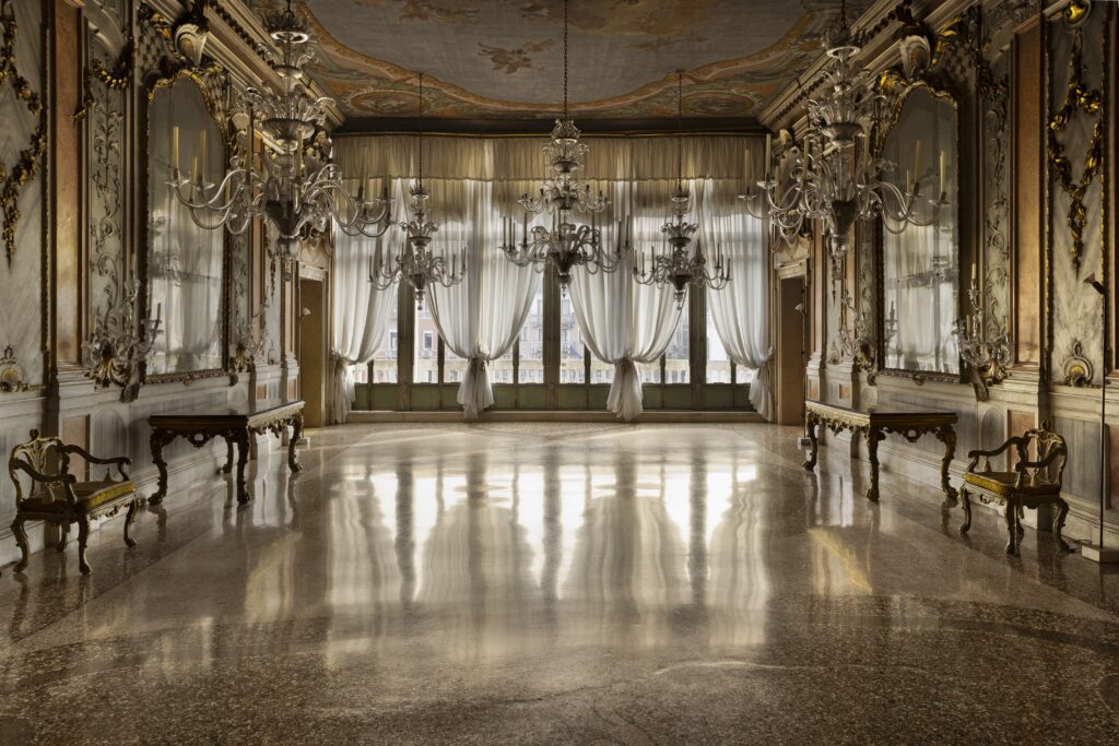 L’accrochage confirme l’intention. Dans le premier salon du Piano Nobile, sous le plafond de Guarana — La Victoire de la Lumière sur les Ténèbres, disciple de Tiepolo — les créations Memento Mori de Codognato dialoguent avec les photographies de sujets endormis de Steven Shearer et des pièces de haute couture de Christian Lacroix et Rei Kawakubo pour Comme des Garçons. La mort, le sommeil, l’architecture baroque, le vêtement comme sculpture : Van Noten construit une argumentation, pas une vitrine.