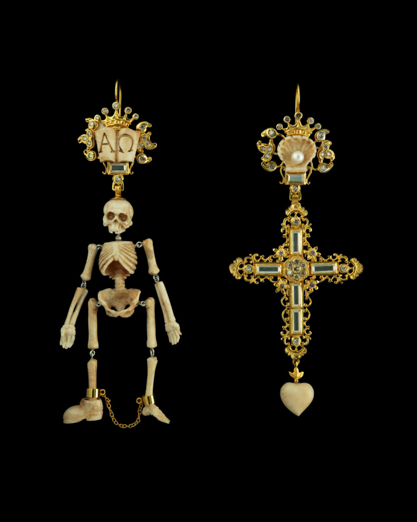 La pièce la plus radicale du point de vue matériel est moins visible : les boucles d’oreilles Squelette de prisonnier, en or jaune 18 carats, os de mammouth, diamants, cristal de roche et perle. L’os de mammouth — matière fossile extraite du permafrost sibérien, dont le commerce est légal contrairement à l’ivoire d’éléphant contemporain — introduit dans le bijou une temporalité qui échappe à toute saisonnalité. La pièce ne porte pas seulement un symbole de mort ; elle est construite à partir d’une matière morte depuis plusieurs dizaines de milliers d’années. Cette cohérence entre forme et matière est précisément ce que Van Noten semble avoir reconnu.