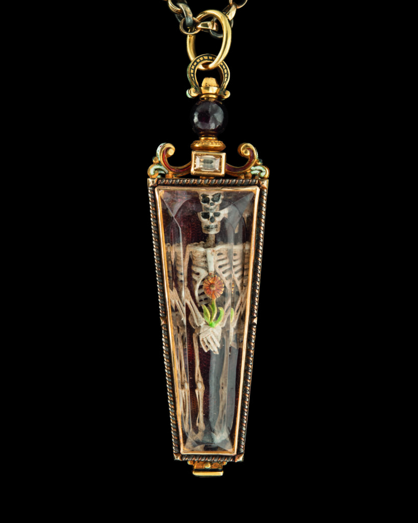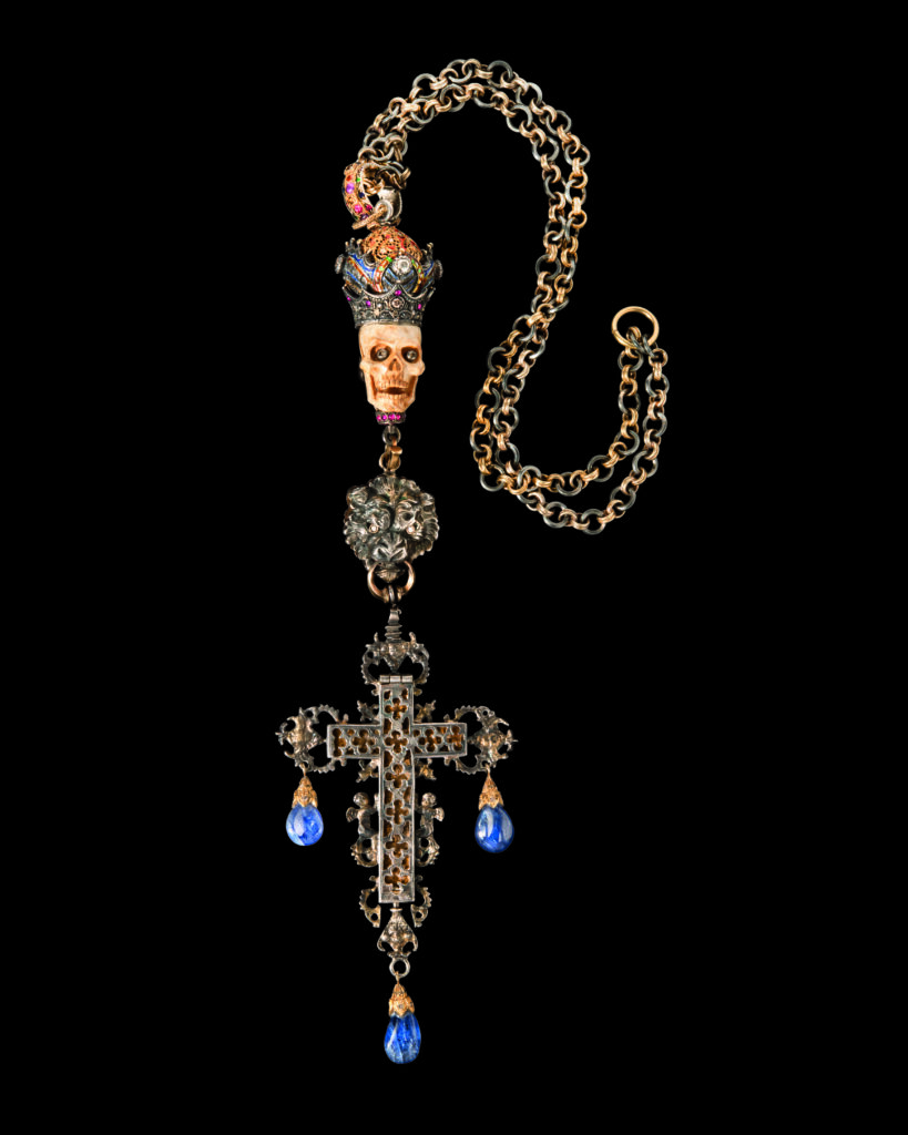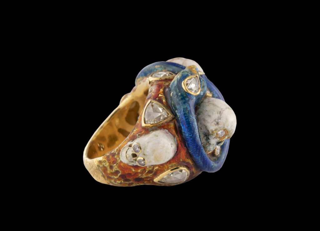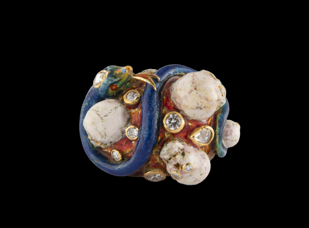 Codognato, fondée en 1866 près de la Piazza San Marco, est une maison dont le registre symbolique n’a jamais cherché la neutralité. Le Memento Mori — crâne, cercueil, squelette — y est traité depuis des générations non comme une provocation commerciale mais comme un héritage théologique et iconographique vénitien. Les quinze pièces présentées au Palazzo Pisani Moretta du 25 avril au 4 octobre 2026 documentent cet héritage sur plusieurs décennies : certaines appartiennent à des collectionneurs historiques, d’autres ont été conçues pour l’événement, dont la bague Cinque Morti 2026 en or jaune 18 carats, diamants et émail, reprise d’un design d’archive.