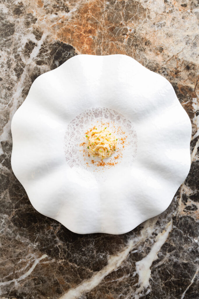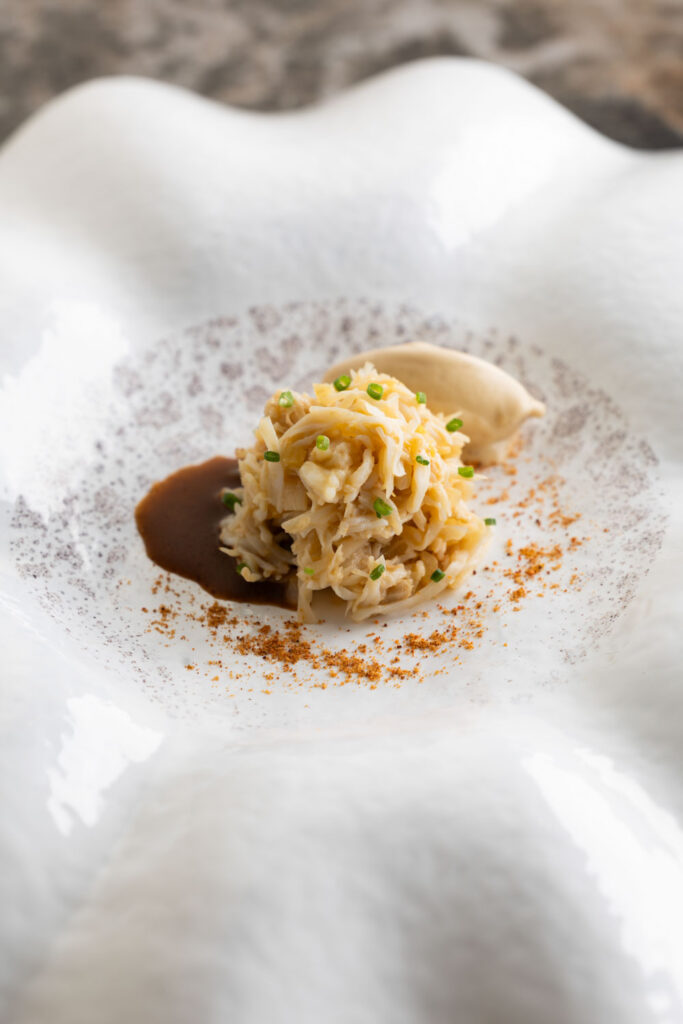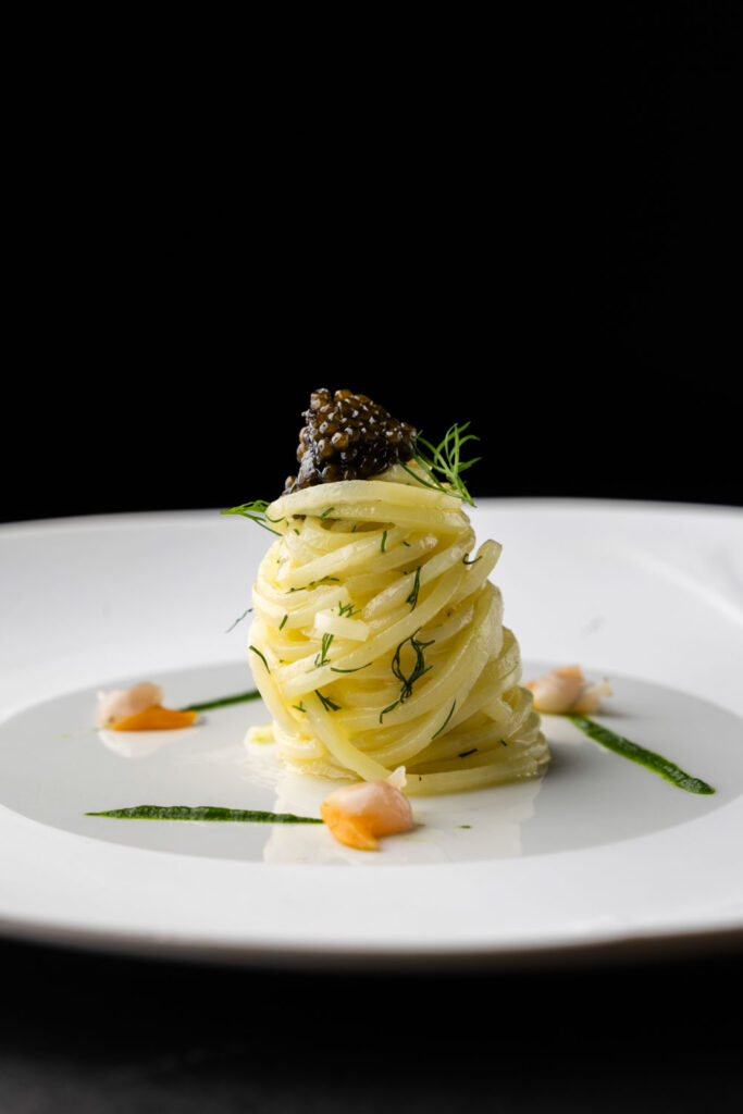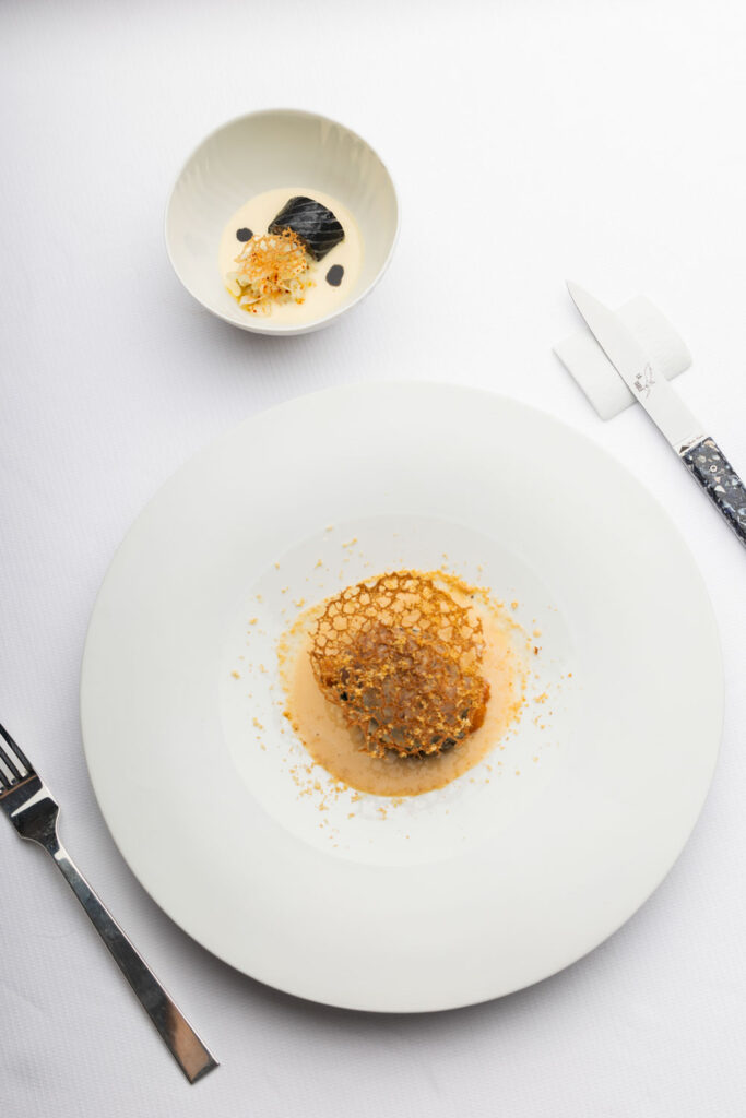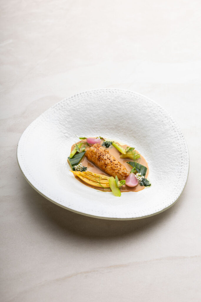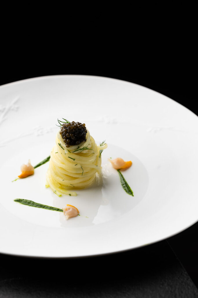 Les spaghettis de pommes de terre au caviar et jus de coquillages — plat signature construit sur un paradoxe de matière noble et de tubercule humble — migrent de La Gourmandière vers le Liziec. Ce type de continuité n’est pas anodine : elle signale que le changement de structure n’est pas un changement d’identité. C’est le même geste culinaire, dans un espace plus capitalisé.