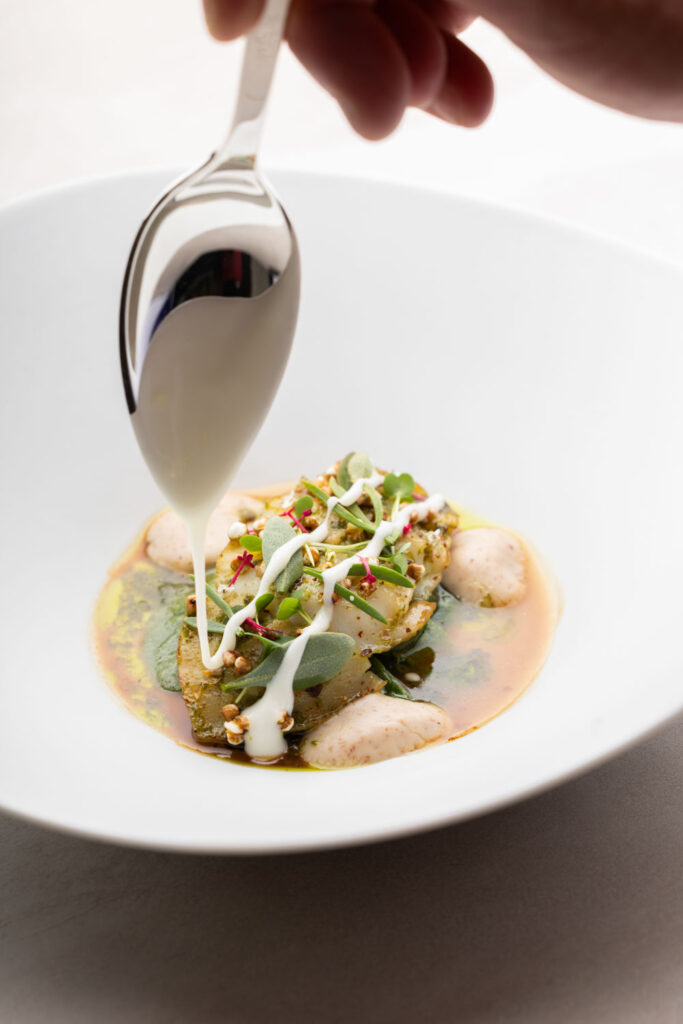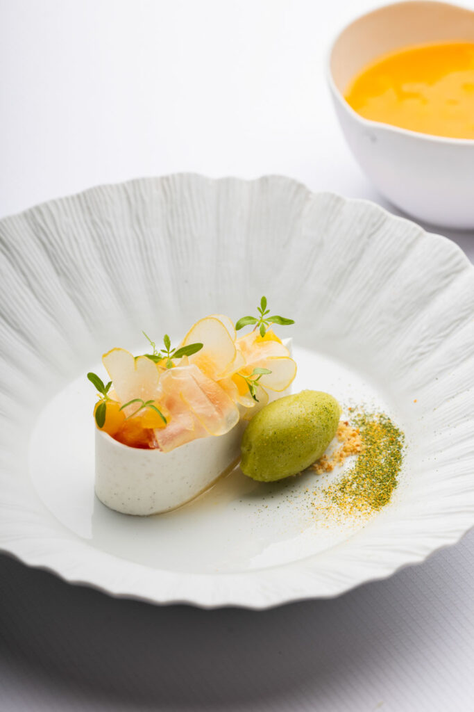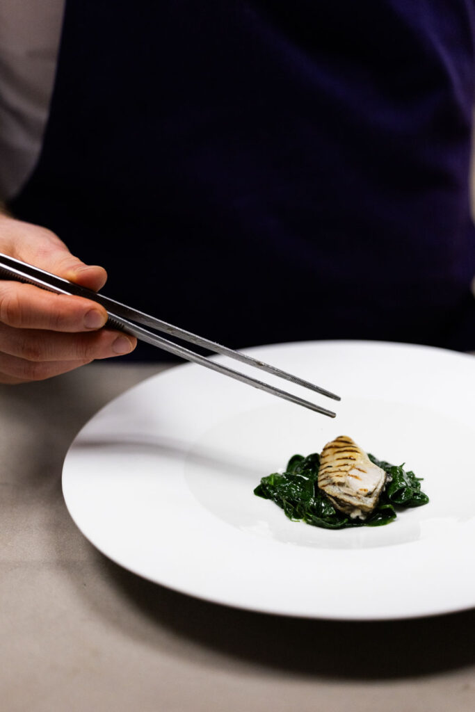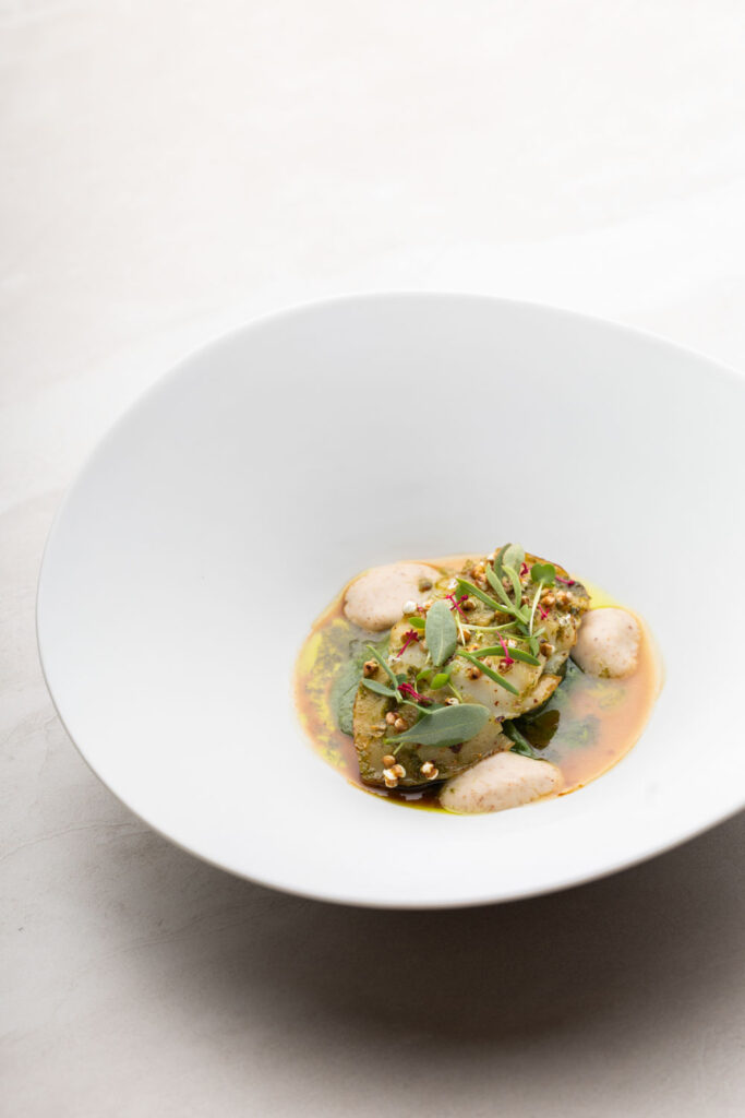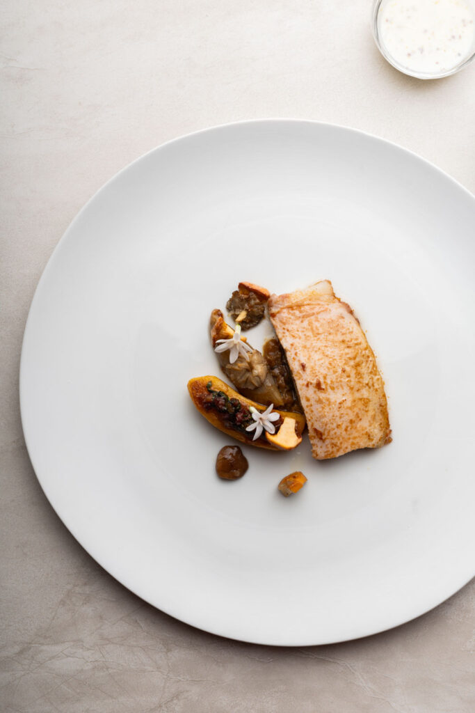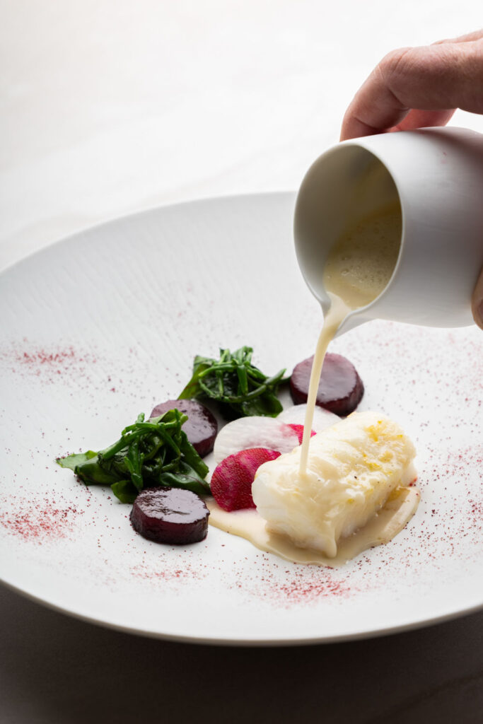 Les spaghettis de pommes de terre au caviar et jus de coquillages — plat signature construit sur un paradoxe de matière noble et de tubercule humble — migrent de La Gourmandière vers le Liziec. Ce type de continuité n’est pas anodine : elle signale que le changement de structure n’est pas un changement d’identité. C’est le même geste culinaire, dans un espace plus capitalisé.