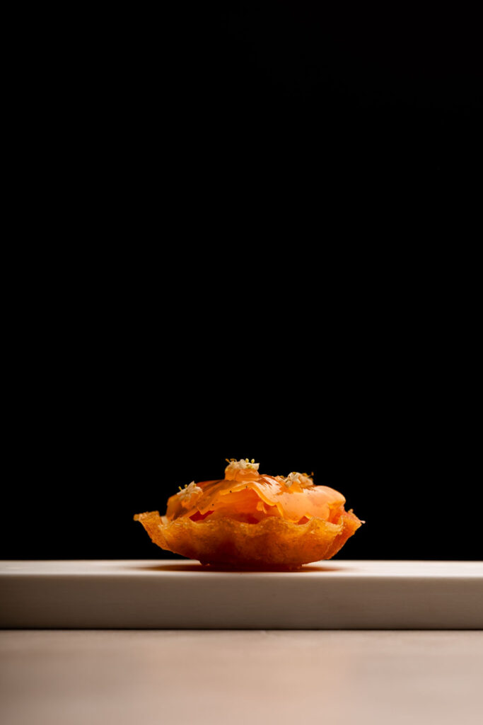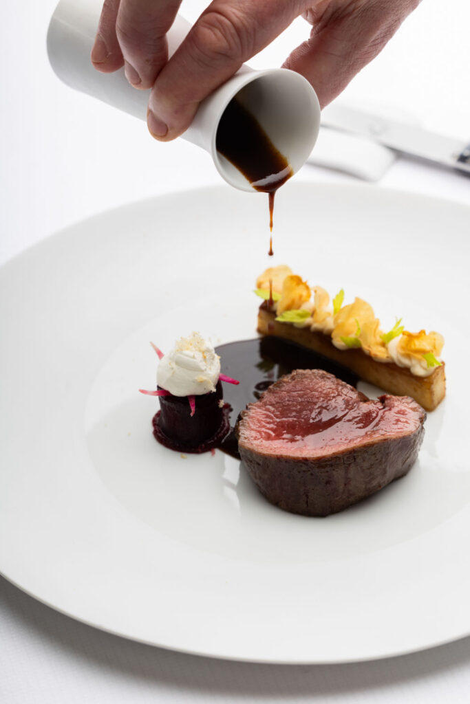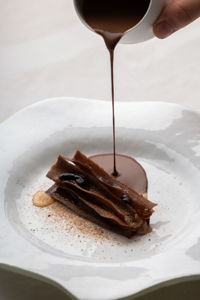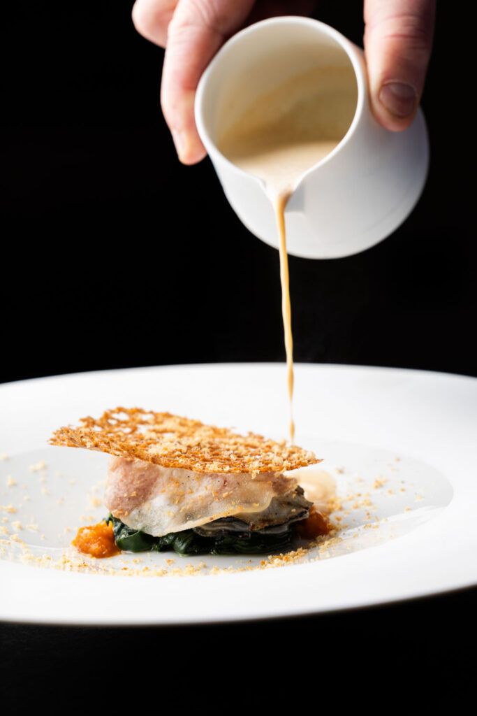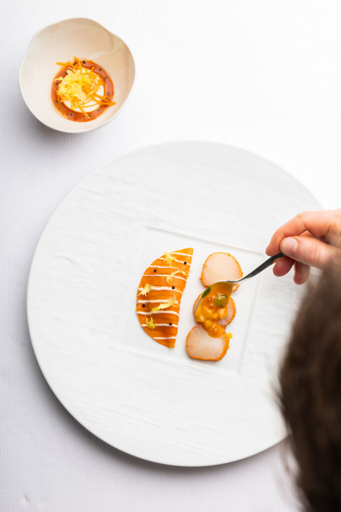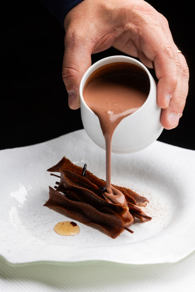 Les spaghettis de pommes de terre au caviar et jus de coquillages — plat signature construit sur un paradoxe de matière noble et de tubercule humble — migrent de La Gourmandière vers le Liziec. Ce type de continuité n’est pas anodine : elle signale que le changement de structure n’est pas un changement d’identité. C’est le même geste culinaire, dans un espace plus capitalisé.