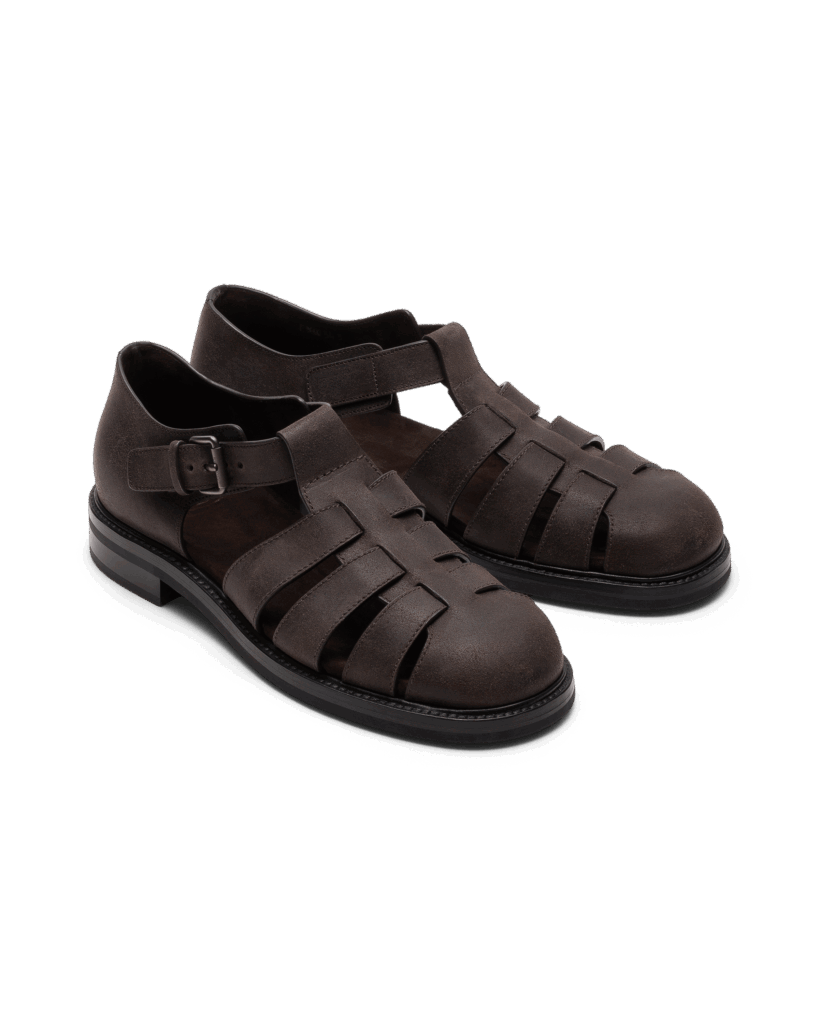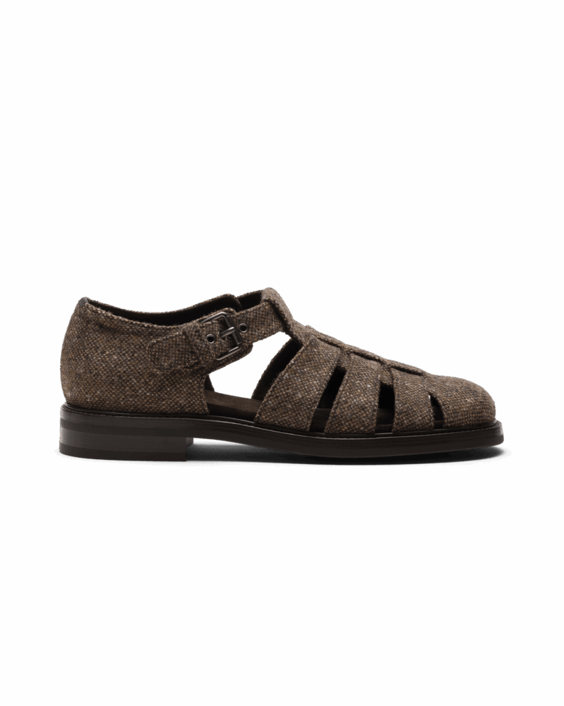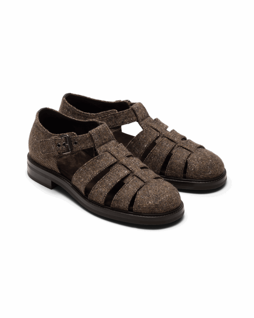 L’élément le plus discuté sera sans doute la collection Sunday Morning : une sandale d’été réinterprétée en daim ciré ou en tweed à chevrons pour la saison froide. L’inversion saisonnière n’est pas une provocation — c’est une proposition commerciale lisible dans le contexte du marché actuel, où la frontière entre intérieur et extérieur, entre formel et résidentiel, s’est définitivement brouillée depuis 2020. Church’s ne l’a pas inventé ; mais la maison le formule avec une cohérence de matières (le tweed knickerbocker, le tartan) qui évite l’arbitraire du gadget.