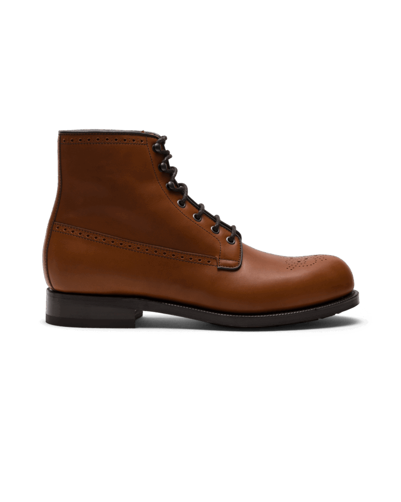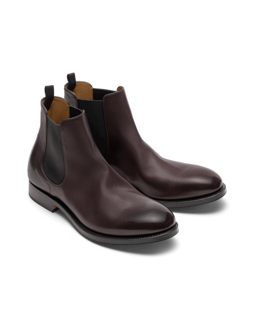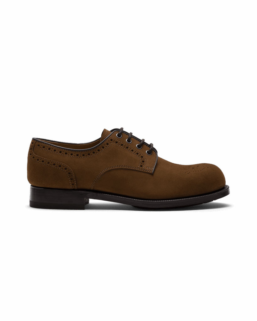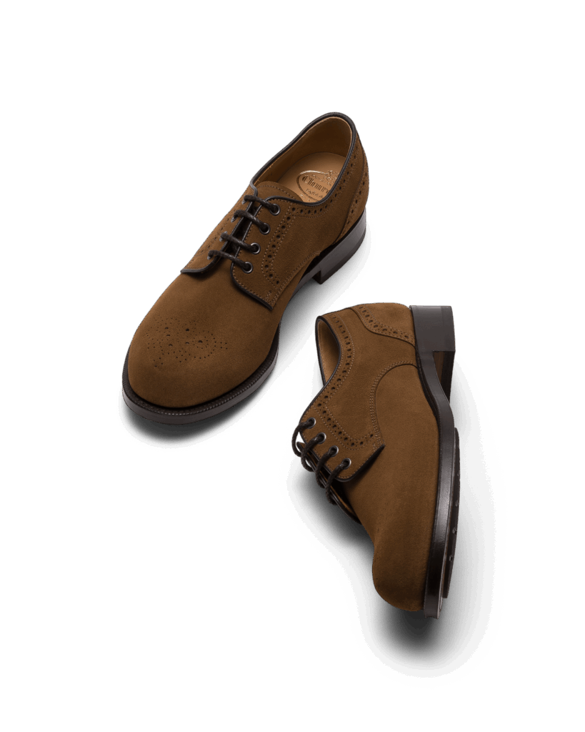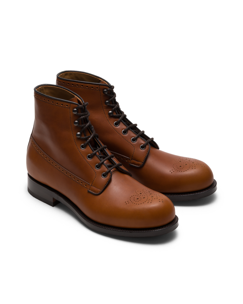 La collection s’organise en trois ensembles — Regent, New Formal, Royal — que le communiqué nomme symphonies. Derrière la rhétorique, des choix techniques lisibles. La gamme Regent repose sur la forme 133 Country, un patronage conçu pour absorber la contrainte du terrain sans tordre le galbe du pied. Le cuir de veau inversé — grain tourné vers l’intérieur, surface veloutée — est plus poreux mais offre une résistance à l’abrasion supérieure aux daims classiques. La botte Shefford y ajoute un tablier cousu main à coutures apparentes : une signature formelle qui dit l’effort avant de le cacher.