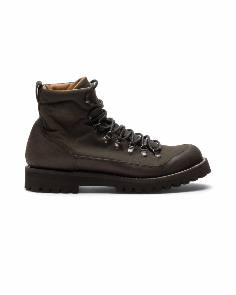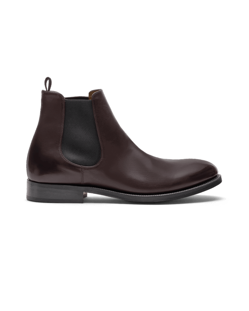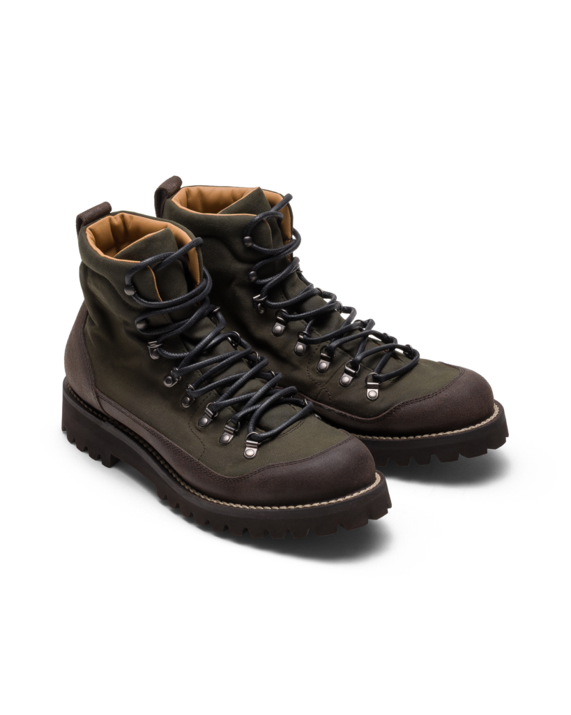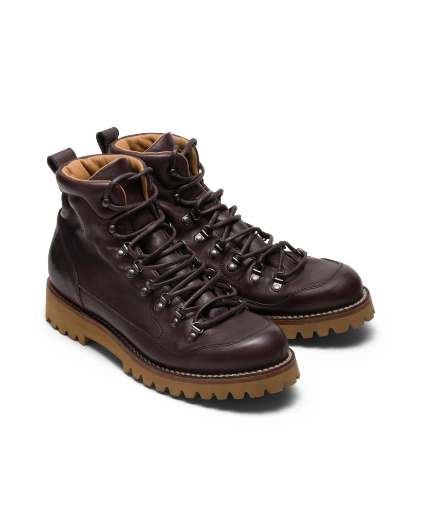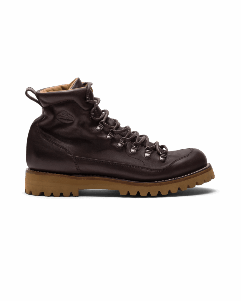 La collection s’organise en trois ensembles — Regent, New Formal, Royal — que le communiqué nomme symphonies. Derrière la rhétorique, des choix techniques lisibles. La gamme Regent repose sur la forme 133 Country, un patronage conçu pour absorber la contrainte du terrain sans tordre le galbe du pied. Le cuir de veau inversé — grain tourné vers l’intérieur, surface veloutée — est plus poreux mais offre une résistance à l’abrasion supérieure aux daims classiques. La botte Shefford y ajoute un tablier cousu main à coutures apparentes : une signature formelle qui dit l’effort avant de le cacher.