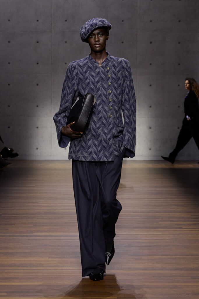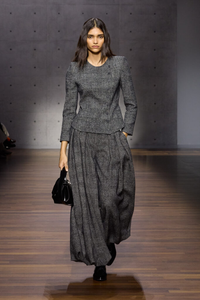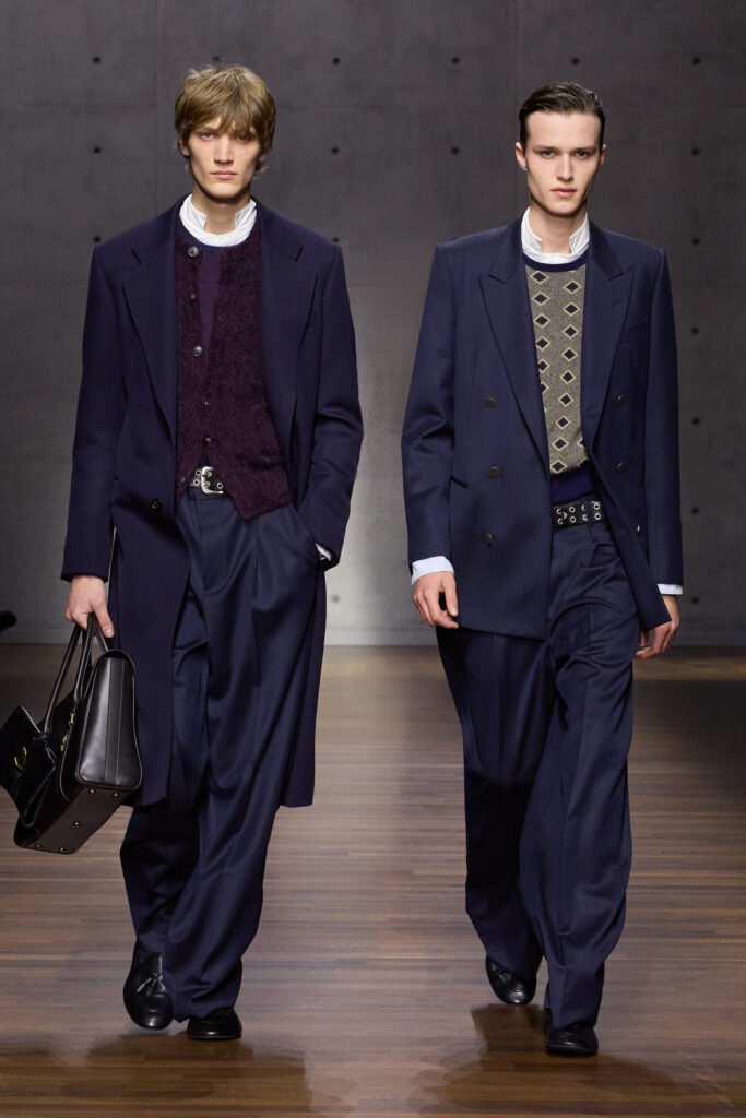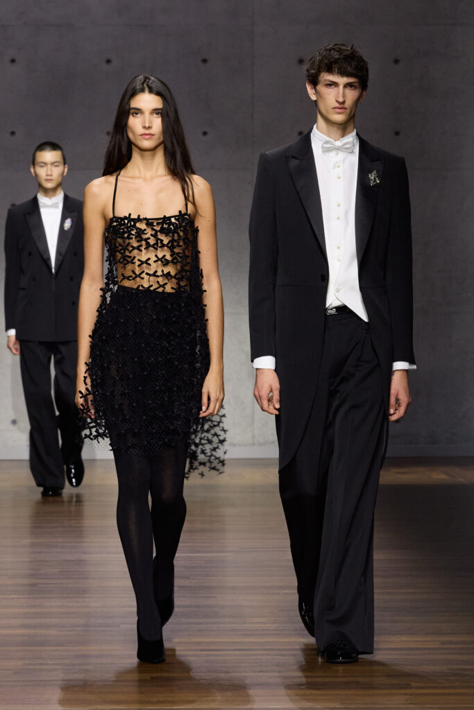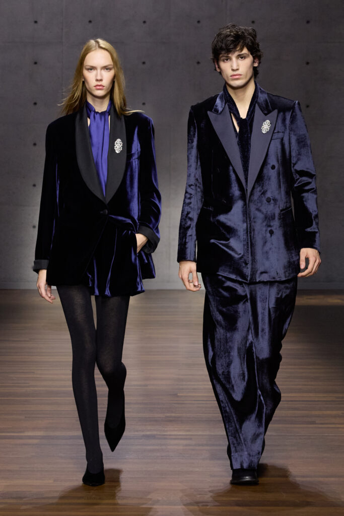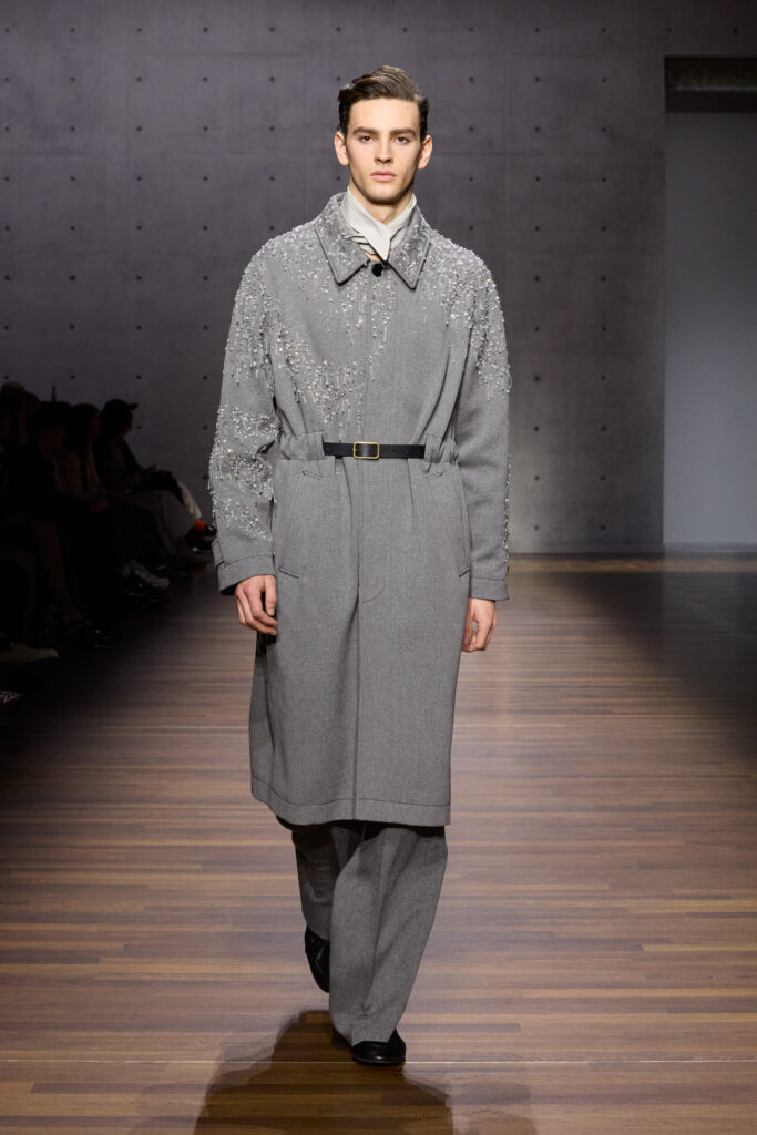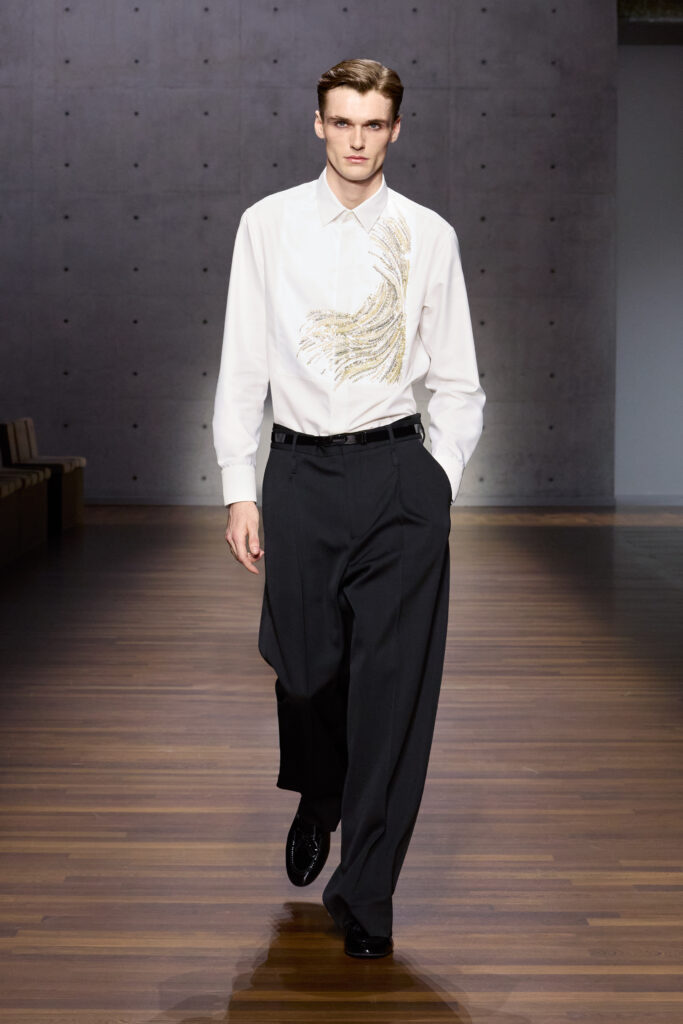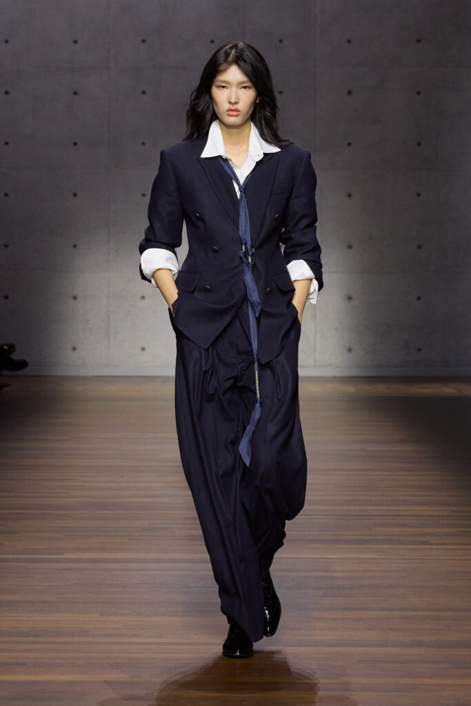 La silhouette mérite attention : verticale, épaules nettes, sens du mouvement. Ce n’est pas le volume enveloppant de la saison précédente ni la légèreté structurée de certaines propositions concurrentes. C’est une verticalité qui rappelle les tailleurs anglais — jaquettes, waistcoats, manteaux enveloppants — filtrée par une sensibilité milanaise qui sait alléger sans dissoudre. Les broderies cristal évoquant des gouttes de pluie sont le seul ornement non fonctionnel de la collection : elles arrivent sur les pièces les plus formelles, comme une permission accordée à la dernière minute.
