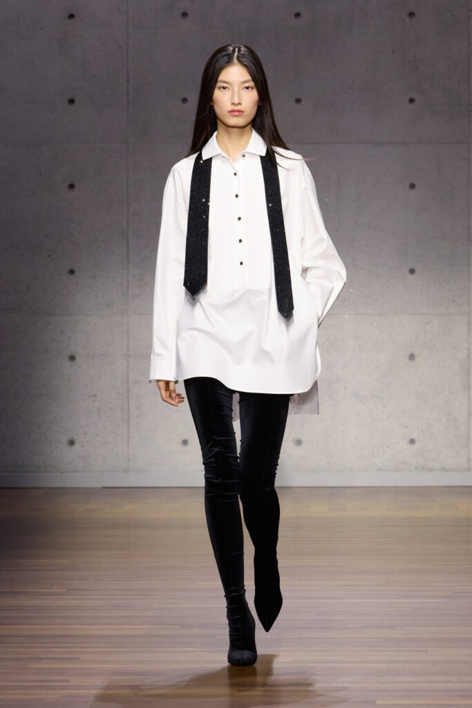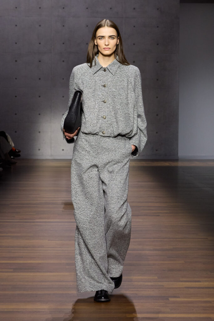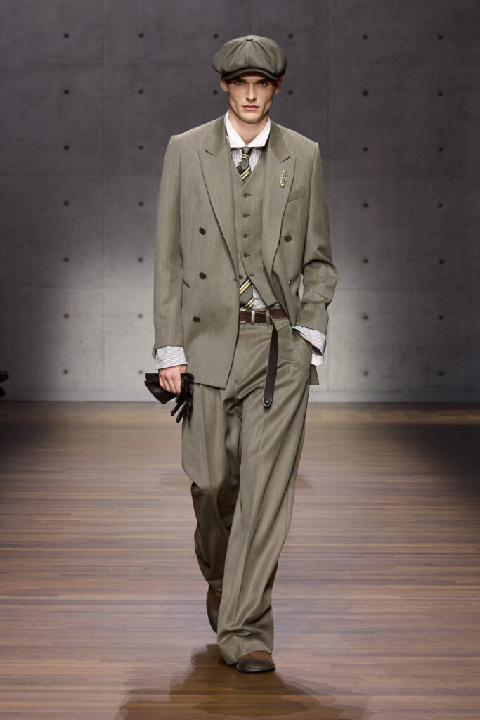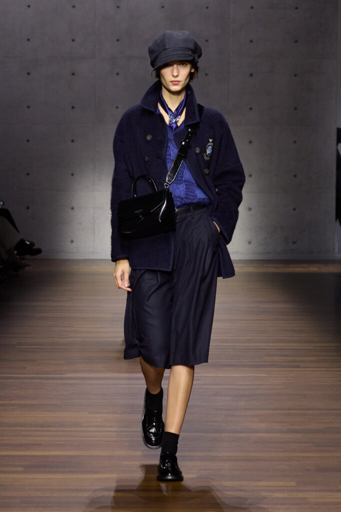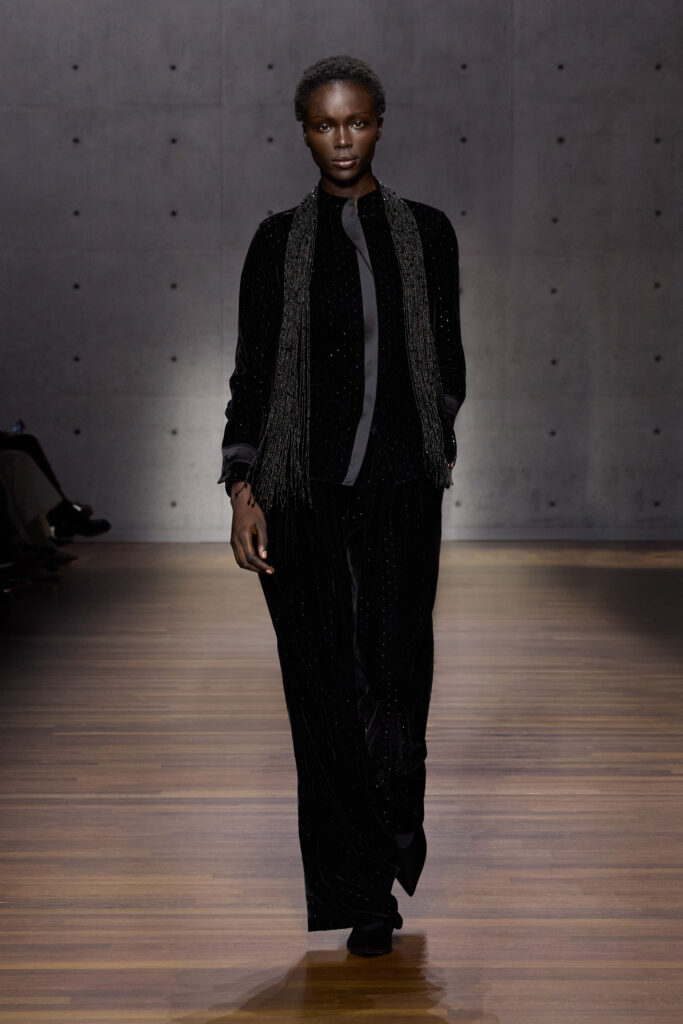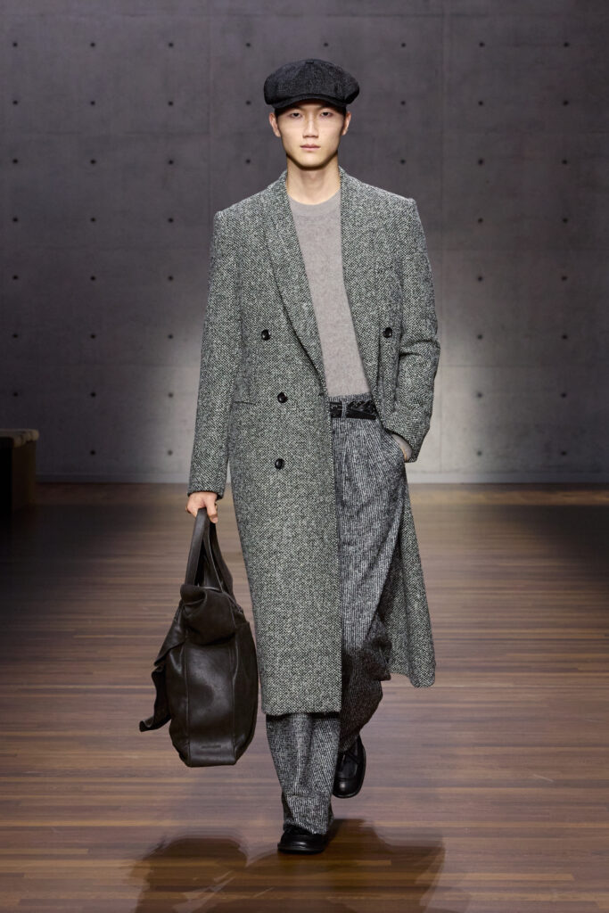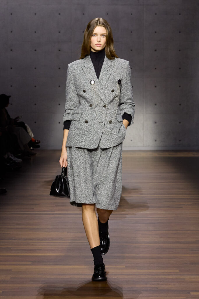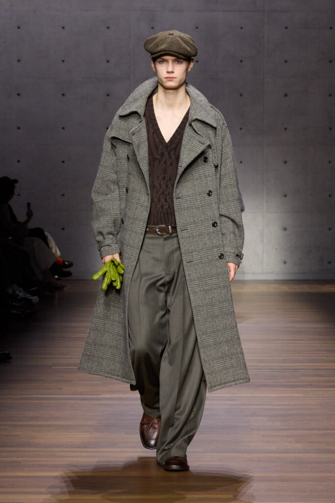 La silhouette mérite attention : verticale, épaules nettes, sens du mouvement. Ce n’est pas le volume enveloppant de la saison précédente ni la légèreté structurée de certaines propositions concurrentes. C’est une verticalité qui rappelle les tailleurs anglais — jaquettes, waistcoats, manteaux enveloppants — filtrée par une sensibilité milanaise qui sait alléger sans dissoudre. Les broderies cristal évoquant des gouttes de pluie sont le seul ornement non fonctionnel de la collection : elles arrivent sur les pièces les plus formelles, comme une permission accordée à la dernière minute.