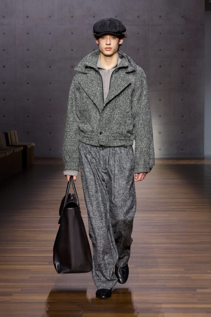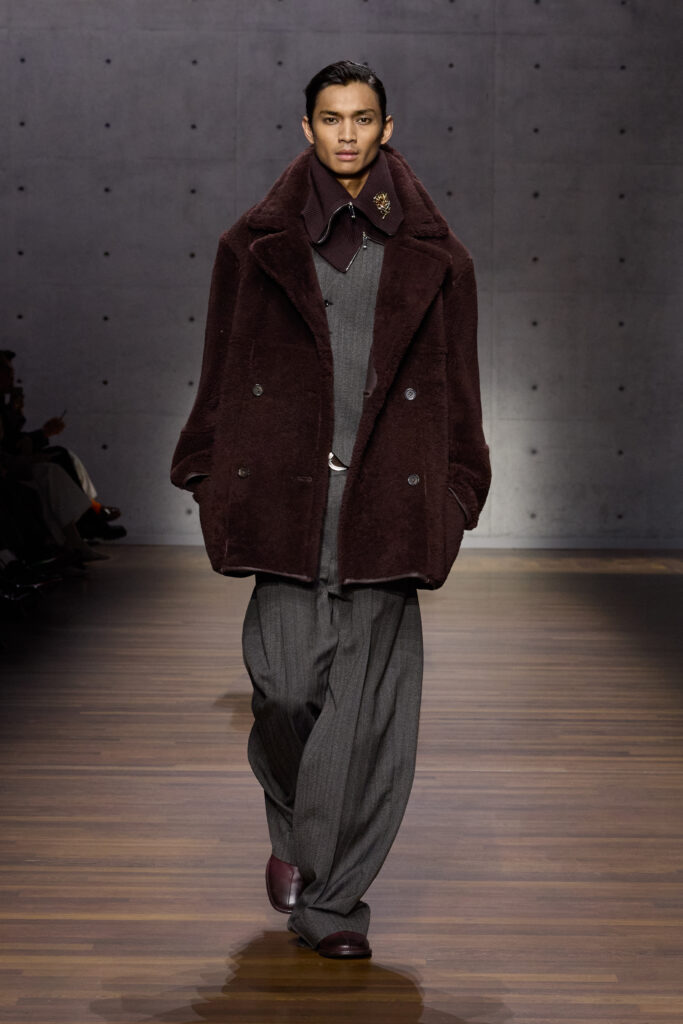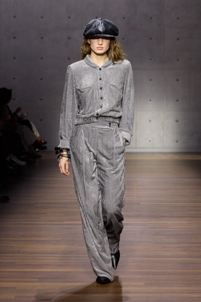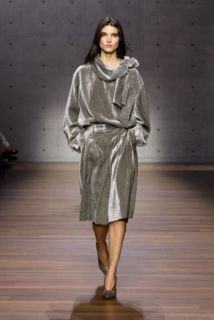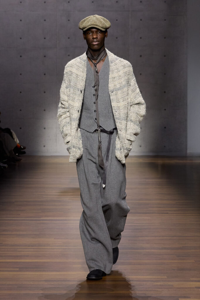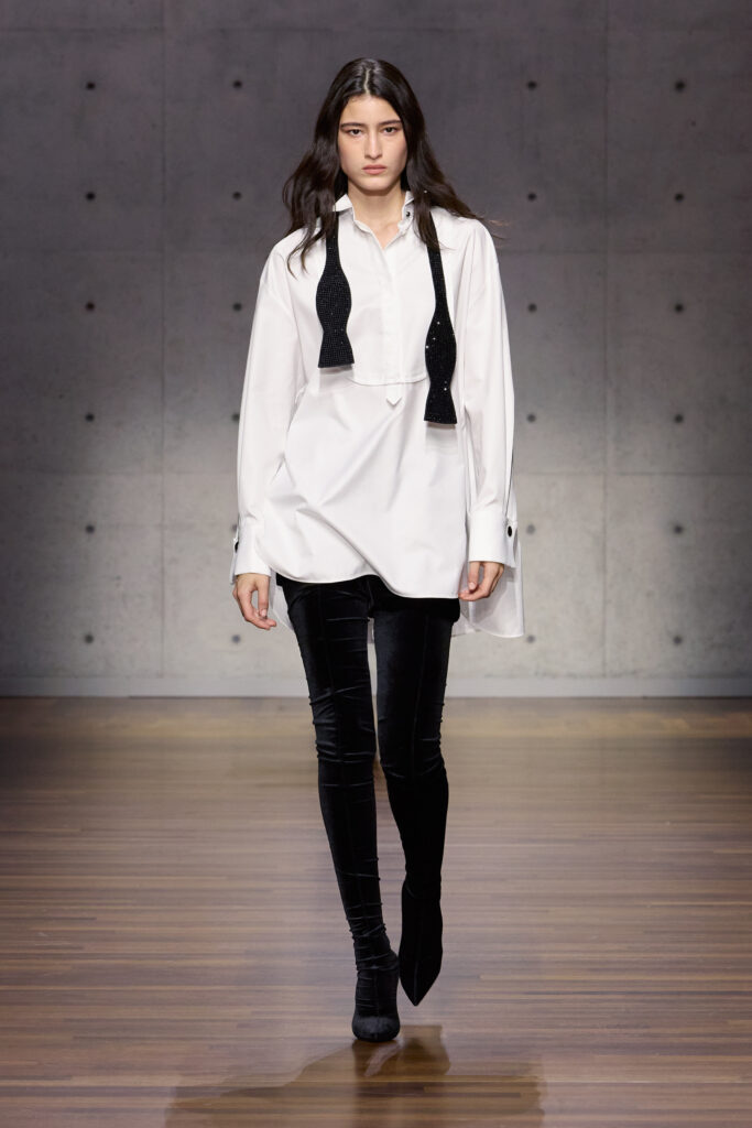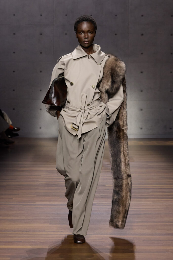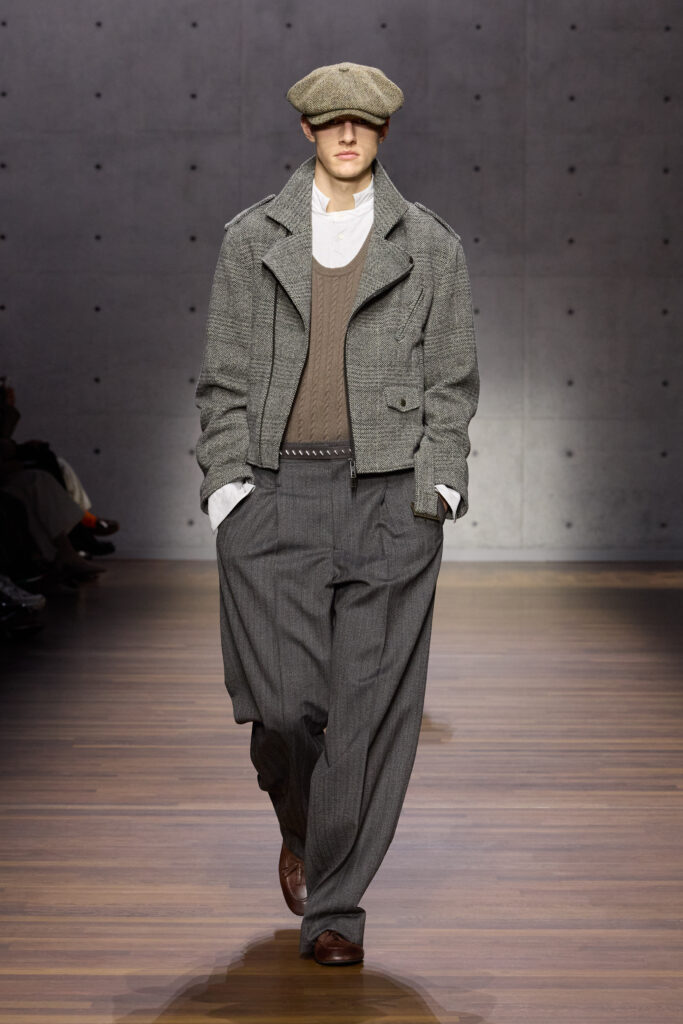 La silhouette mérite attention : verticale, épaules nettes, sens du mouvement. Ce n’est pas le volume enveloppant de la saison précédente ni la légèreté structurée de certaines propositions concurrentes. C’est une verticalité qui rappelle les tailleurs anglais — jaquettes, waistcoats, manteaux enveloppants — filtrée par une sensibilité milanaise qui sait alléger sans dissoudre. Les broderies cristal évoquant des gouttes de pluie sont le seul ornement non fonctionnel de la collection : elles arrivent sur les pièces les plus formelles, comme une permission accordée à la dernière minute.