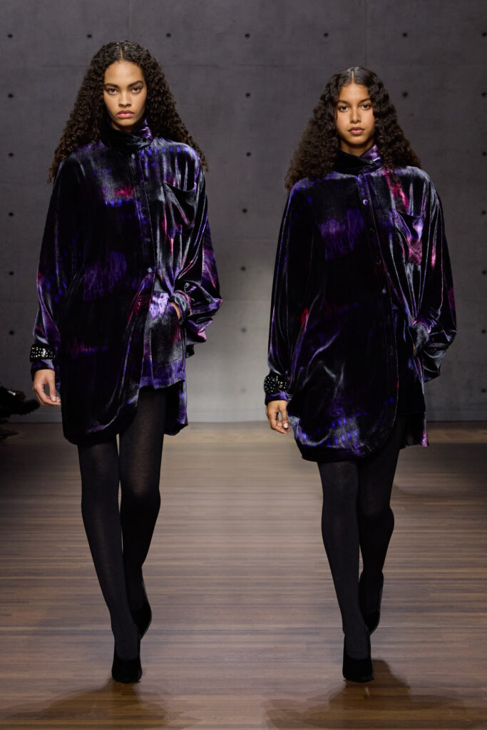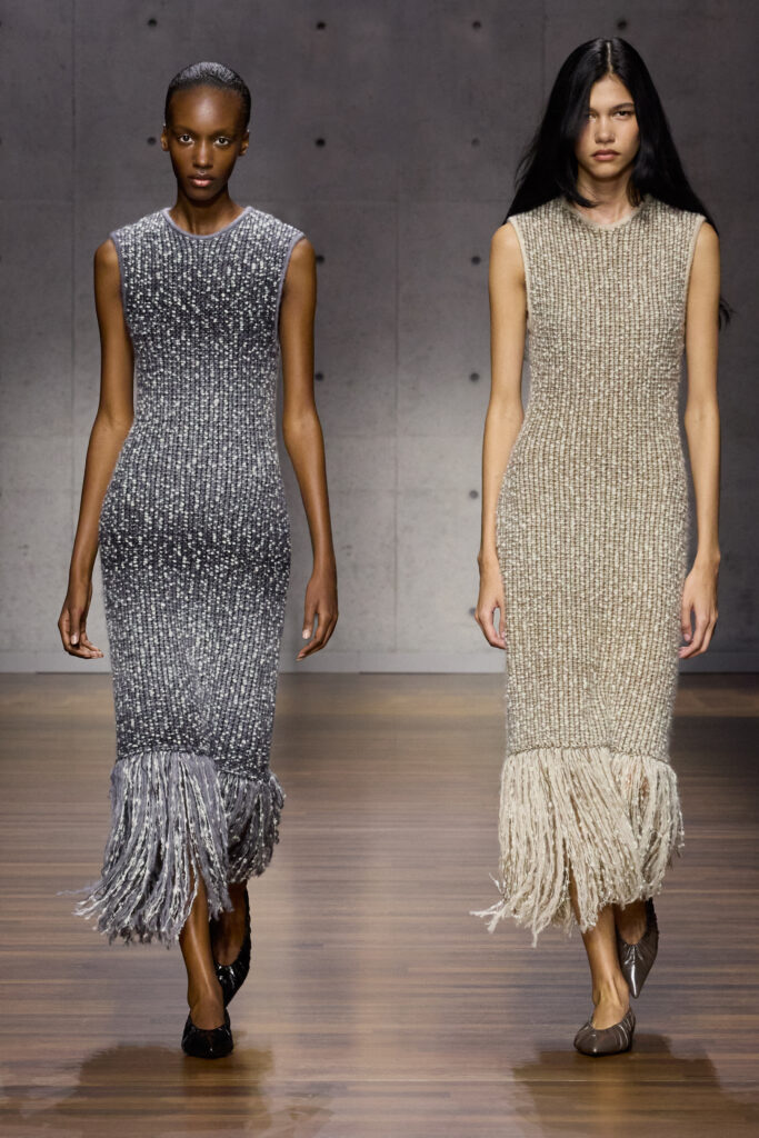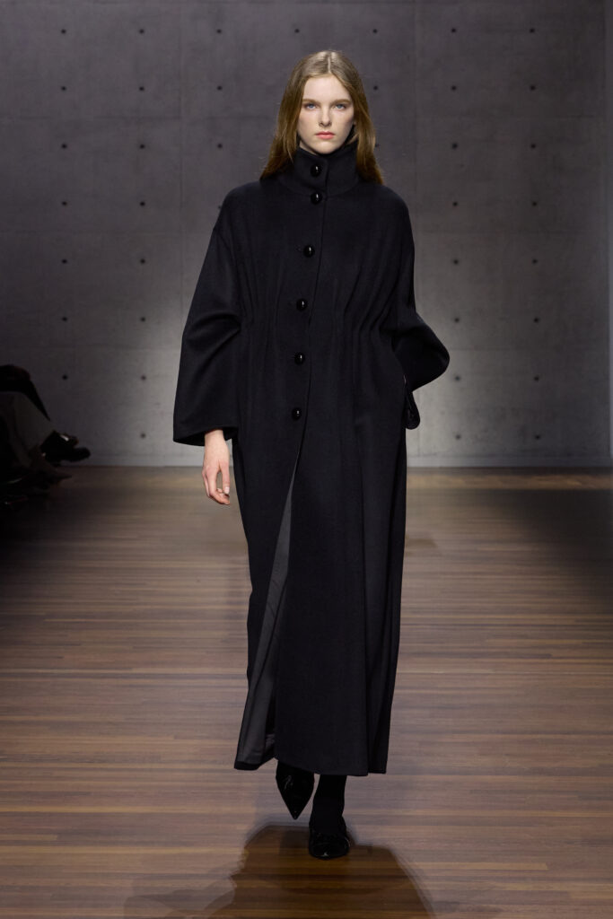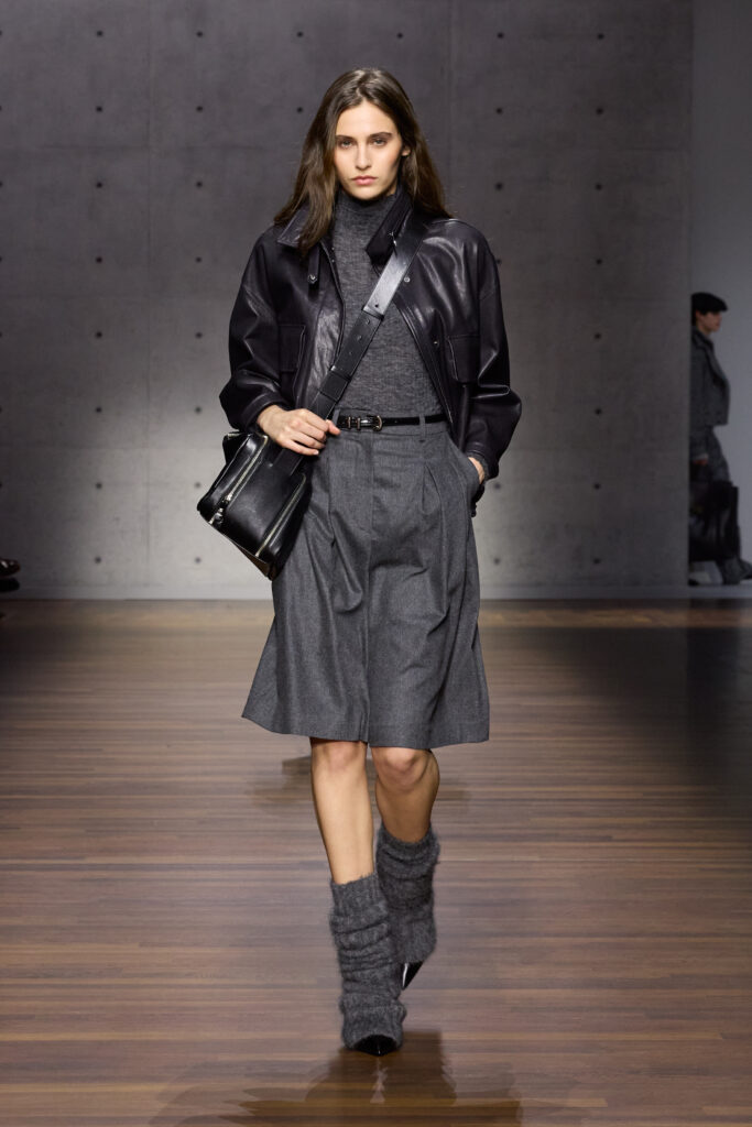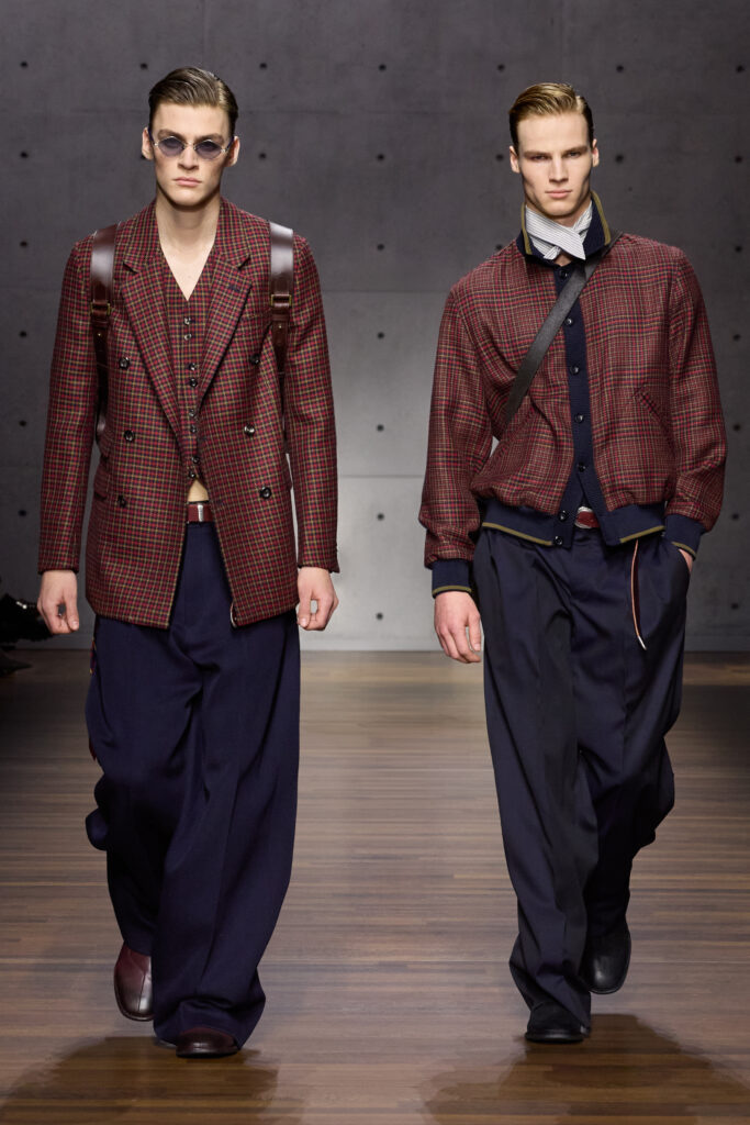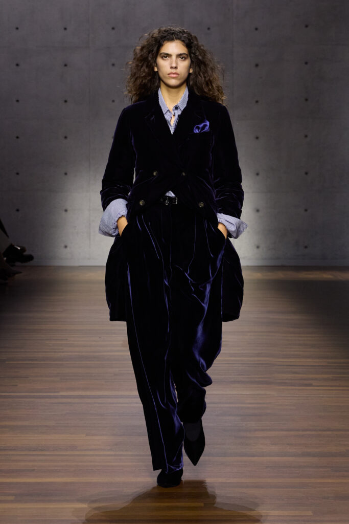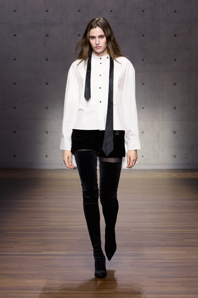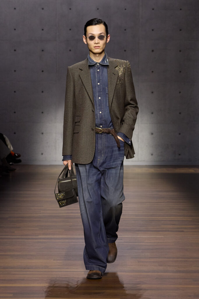 La silhouette mérite attention : verticale, épaules nettes, sens du mouvement. Ce n’est pas le volume enveloppant de la saison précédente ni la légèreté structurée de certaines propositions concurrentes. C’est une verticalité qui rappelle les tailleurs anglais — jaquettes, waistcoats, manteaux enveloppants — filtrée par une sensibilité milanaise qui sait alléger sans dissoudre. Les broderies cristal évoquant des gouttes de pluie sont le seul ornement non fonctionnel de la collection : elles arrivent sur les pièces les plus formelles, comme une permission accordée à la dernière minute.