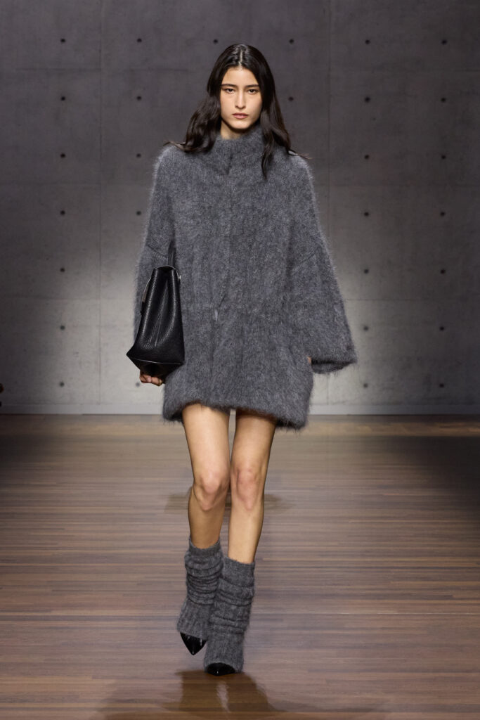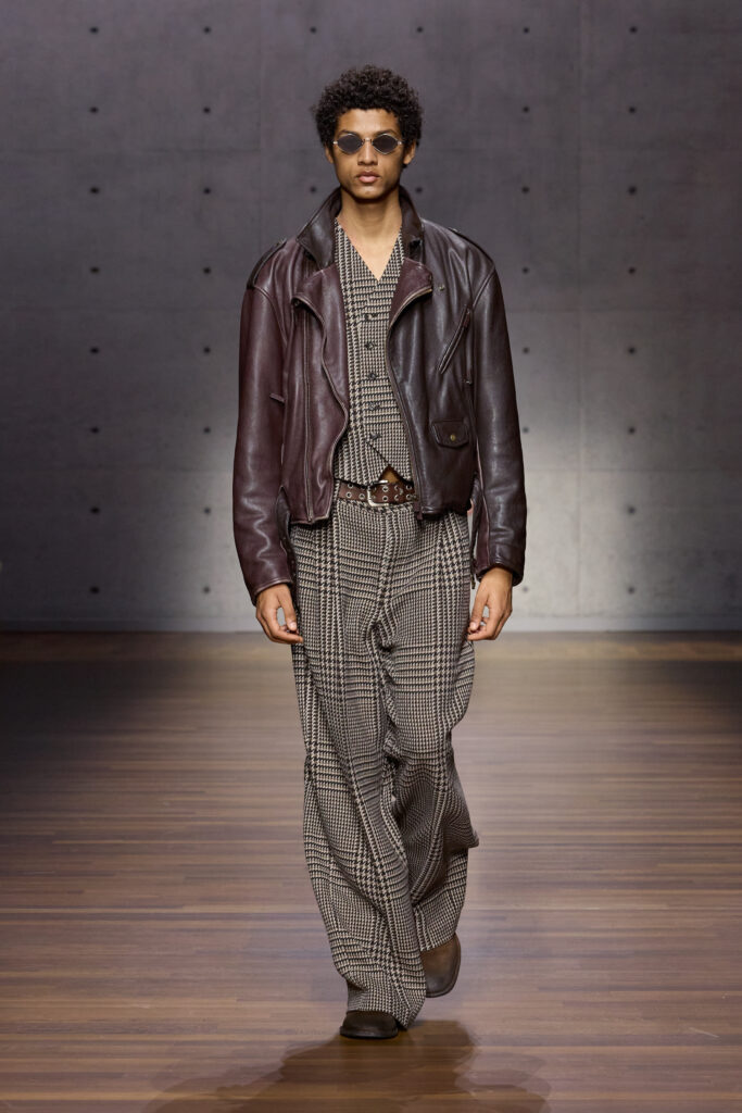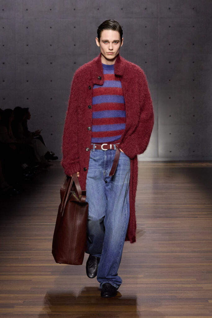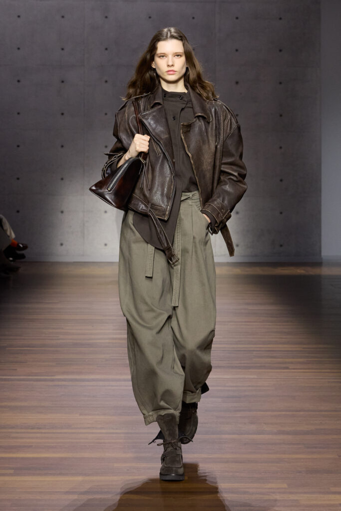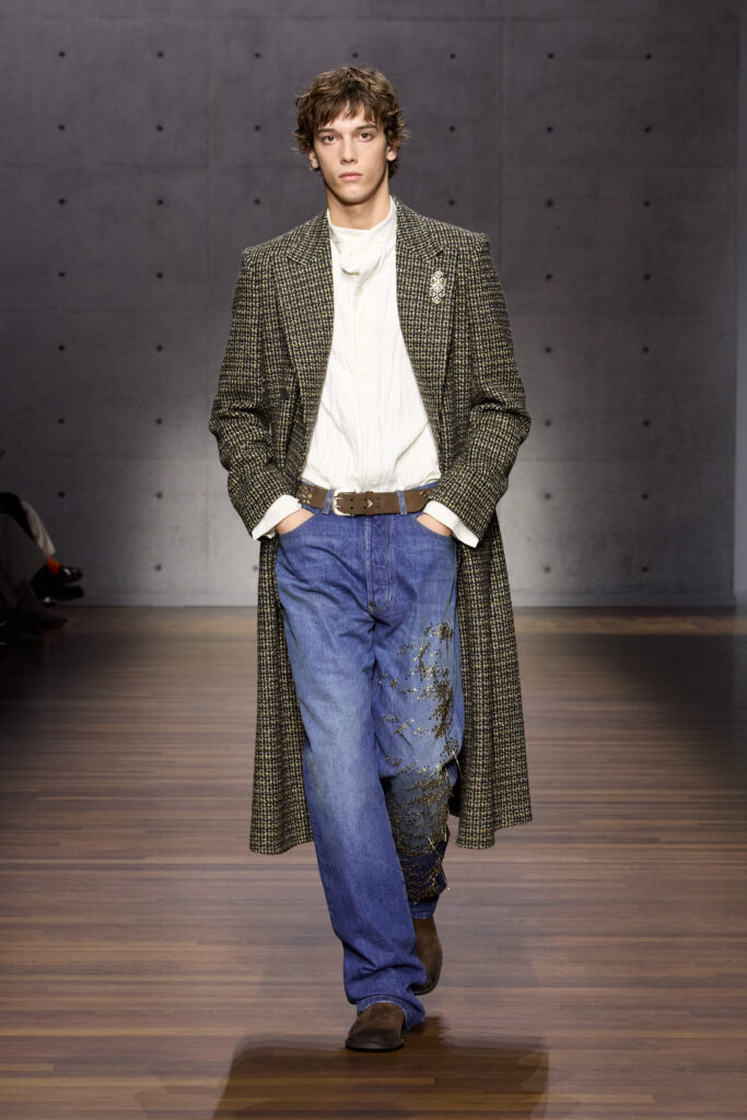 La réponse se lit dans le textile avant de se lire dans le discours. Les matières choisies — tweed à main vécu, jaspé, mélanges laine/lin au toucher habité, shearling à long poil — ne sont pas des matières de jeunesse au sens commercial du terme. Ce sont des matières d’héritage traitées avec un regard contemporain : le cuir à effet usé n’est pas une simulation de vieillissement, c’est une affirmation que la durée a de la valeur. Le denim, lui, traverse la collection comme une ligne basse continue — présent dans les pièces formelles comme dans les plus souples, refusant sa propre hiérarchie.