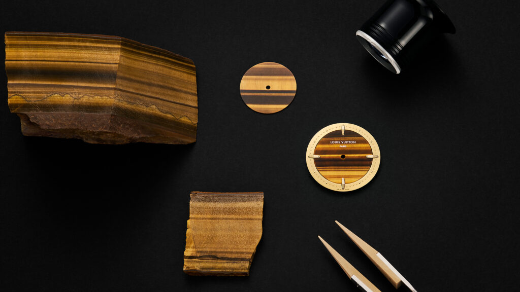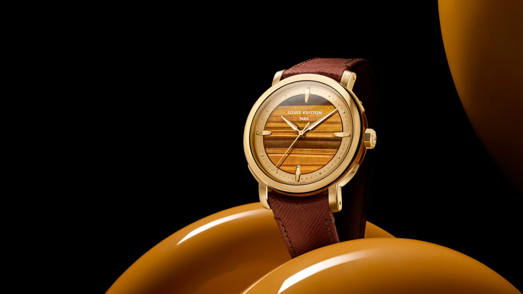 Chez Louis Vuitton, cette orientation dialogue avec l’histoire de la Maison, construite autour du voyage mais aussi de la durabilité des objets. Les malles, conçues pour traverser les décennies, portaient déjà les traces du temps. Le cadran en œil de tigre prolonge cette idée : il ne s’altère pas, il évolue dans la perception que l’on en a.